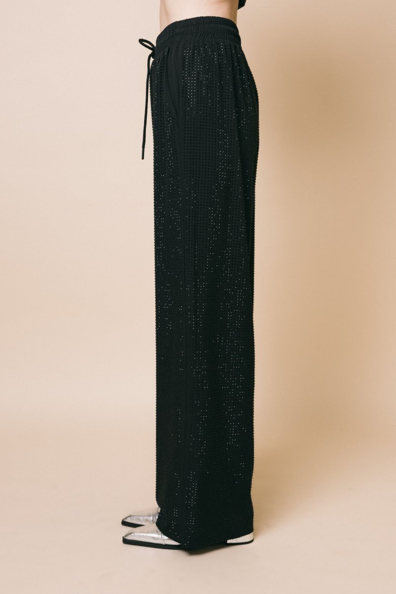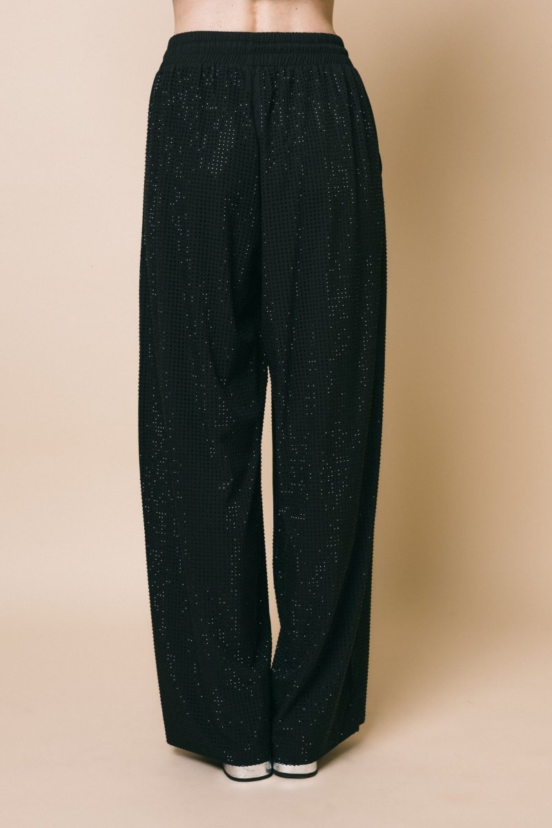 Pantalone palazzo tempestato di strass tono su tono con coulisse in vita *Confy fit Altezza modella: 1.75 cm Taglia indossata: S Tessuto: 50% poliuretano 50% poliestere Istruzioni per il lavaggio: lavabile a secco
