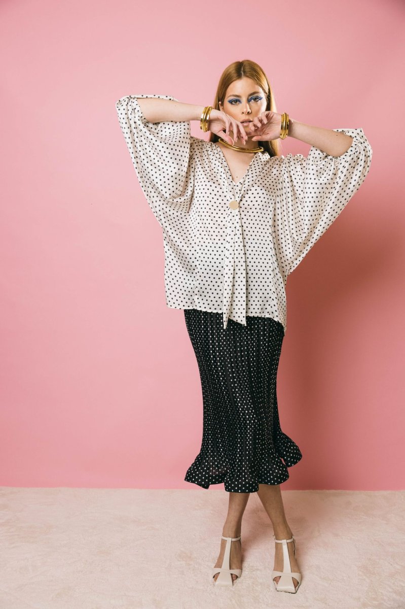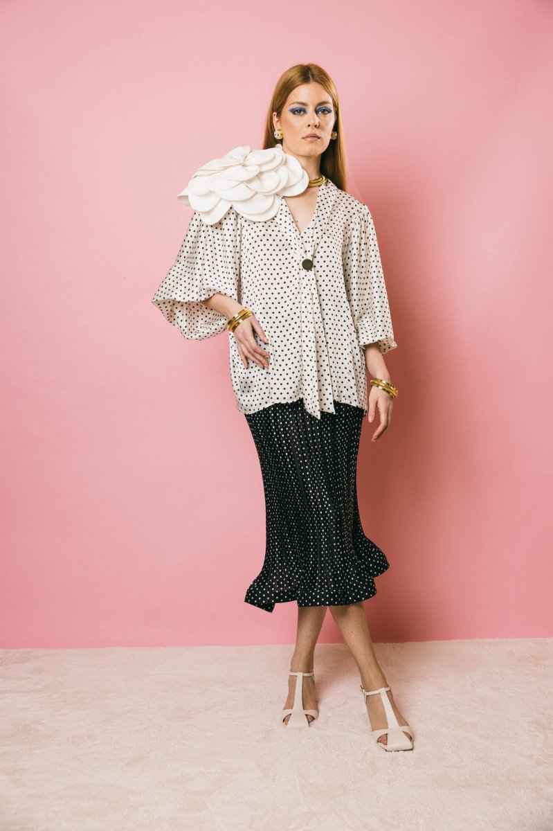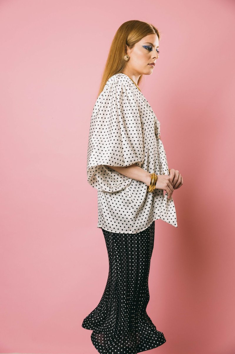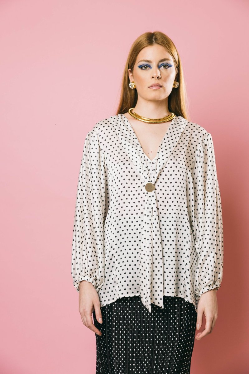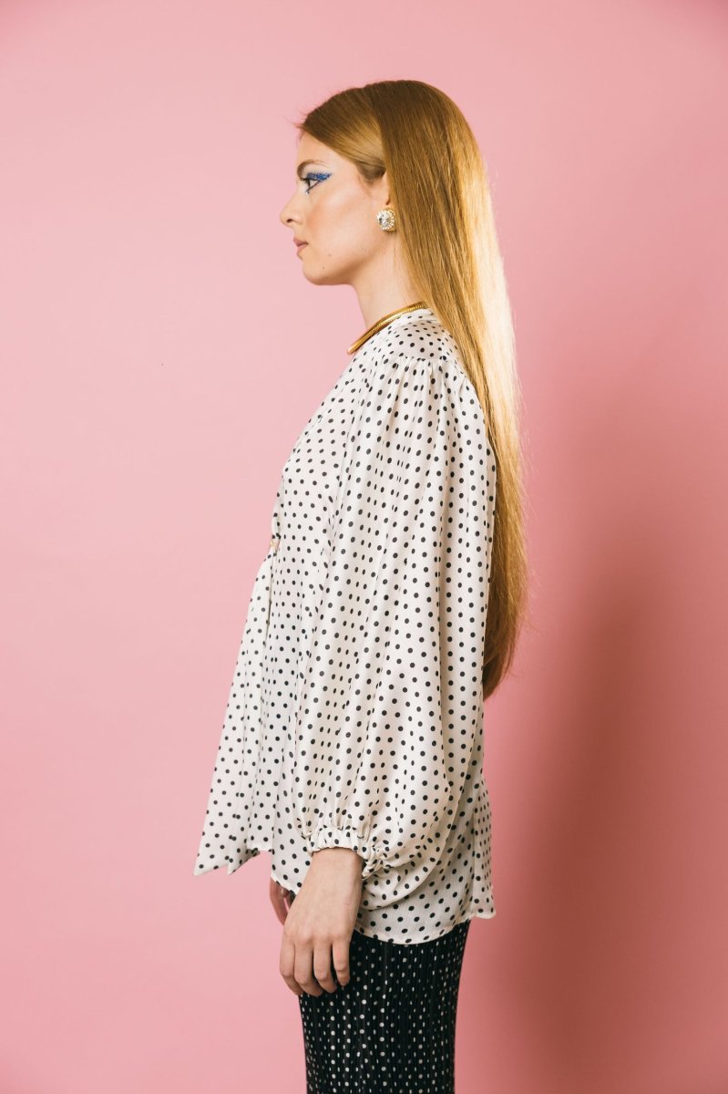 Blusa meravigliosamente femminile e raffinata, realizzata in un pregiato tessuto a pois fondo color seta. Impreziosita da maniche a palloncino, sia sulle spalle che sul fondo, completate da un delicato elastico per un effetto voluminoso e sofisticato. Il design eè arricchito da uno scollo a V e da un foulard con ferma foulard incorporato, che aggiunge un tocco di classe e ricercatezza. Un capo di estrema eleganza, perfetto per valorizzare qualsiasi look con grazia e stile.