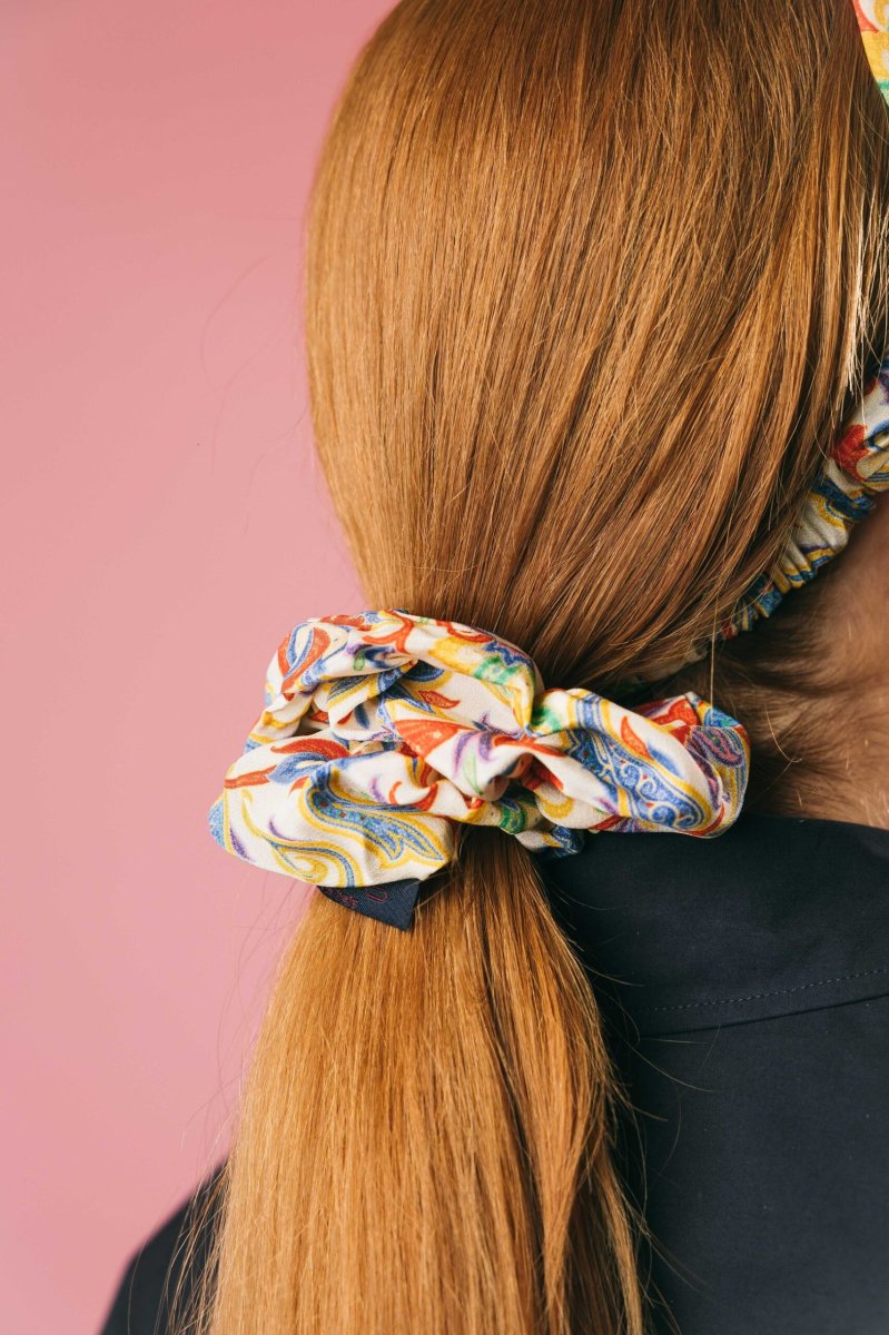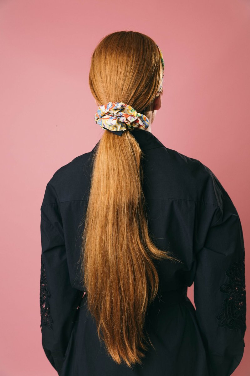 Elegante elastico per capelli misura grande in pura seta, impreziosito dalla sofisticata fantasia pegaso. Un accessorio raffinato che unisce praticità e stile, perfetto per aggiungere un tocco di comfort e femminilità a qualsiasi outfit.