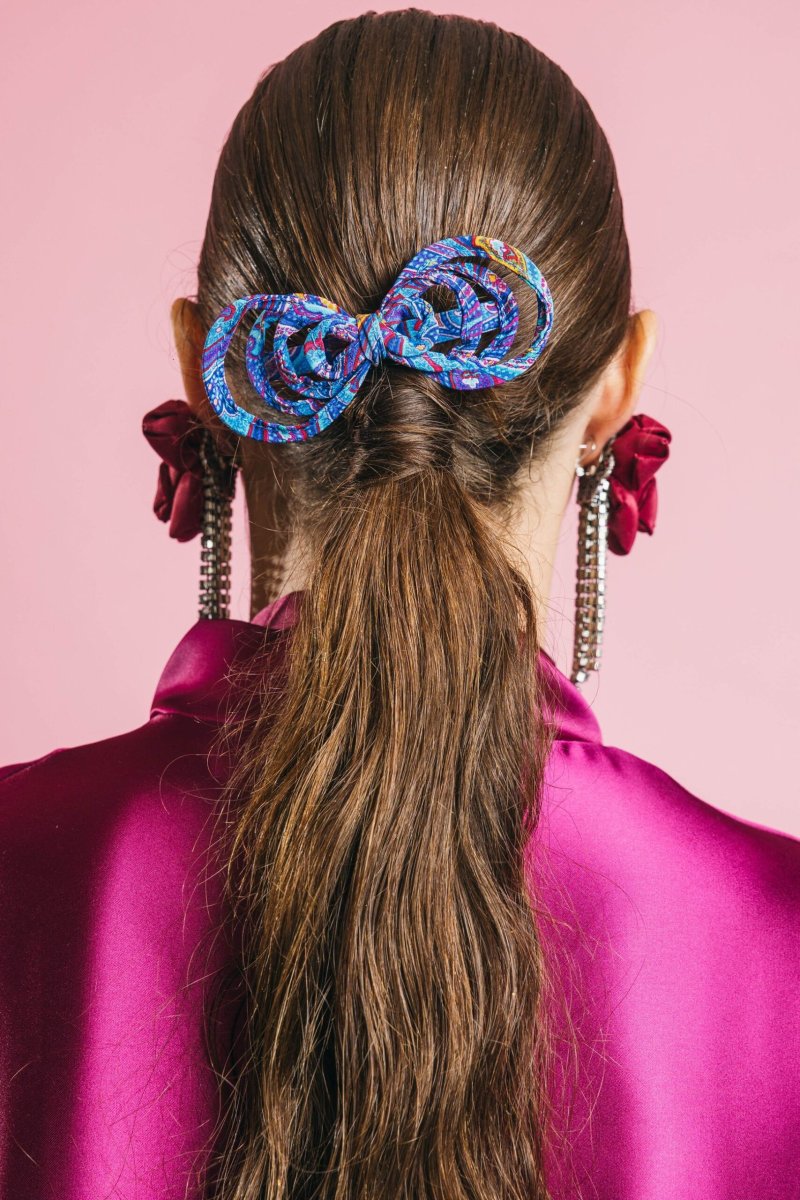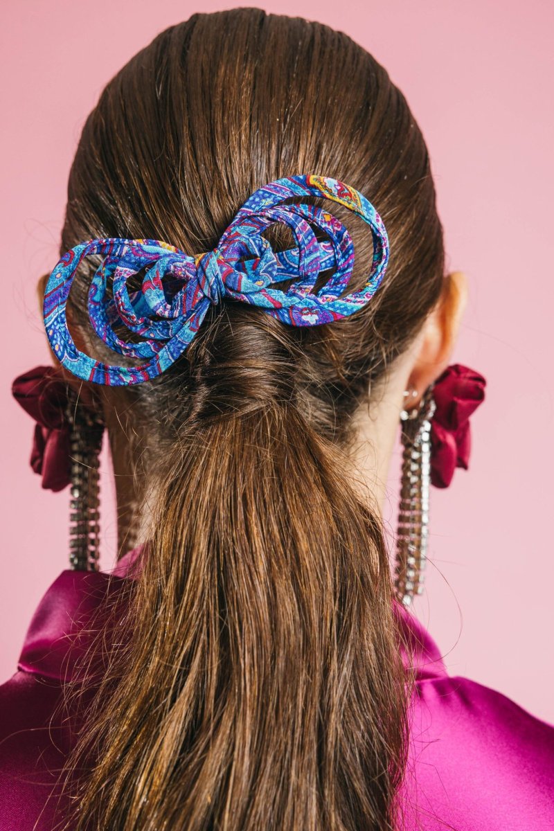Elegante e sofisticato fermaglio a forma di fiocco di cm 10 realizzato in tessuto fantasia paisley bluette multicolor.