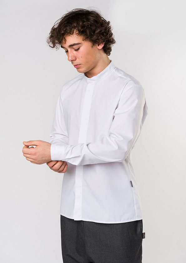 – collo alla coreana – abbottonatura coperta – manica lunga