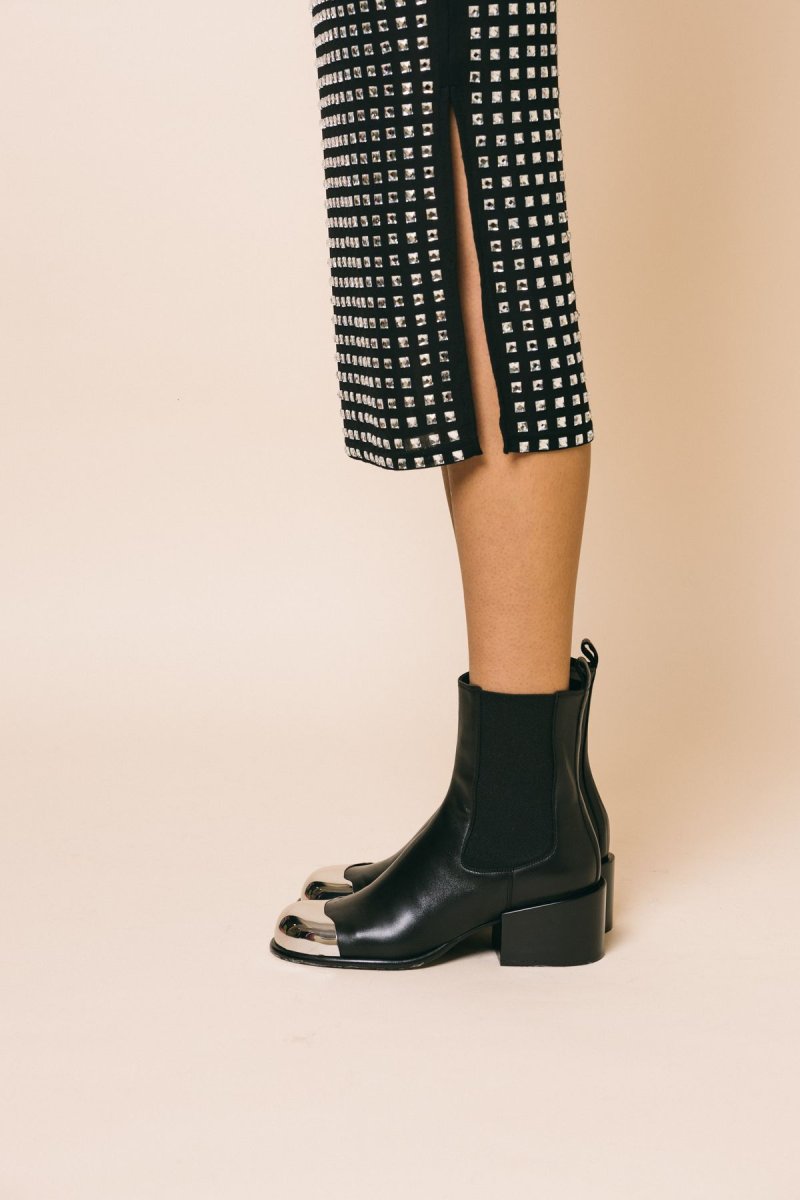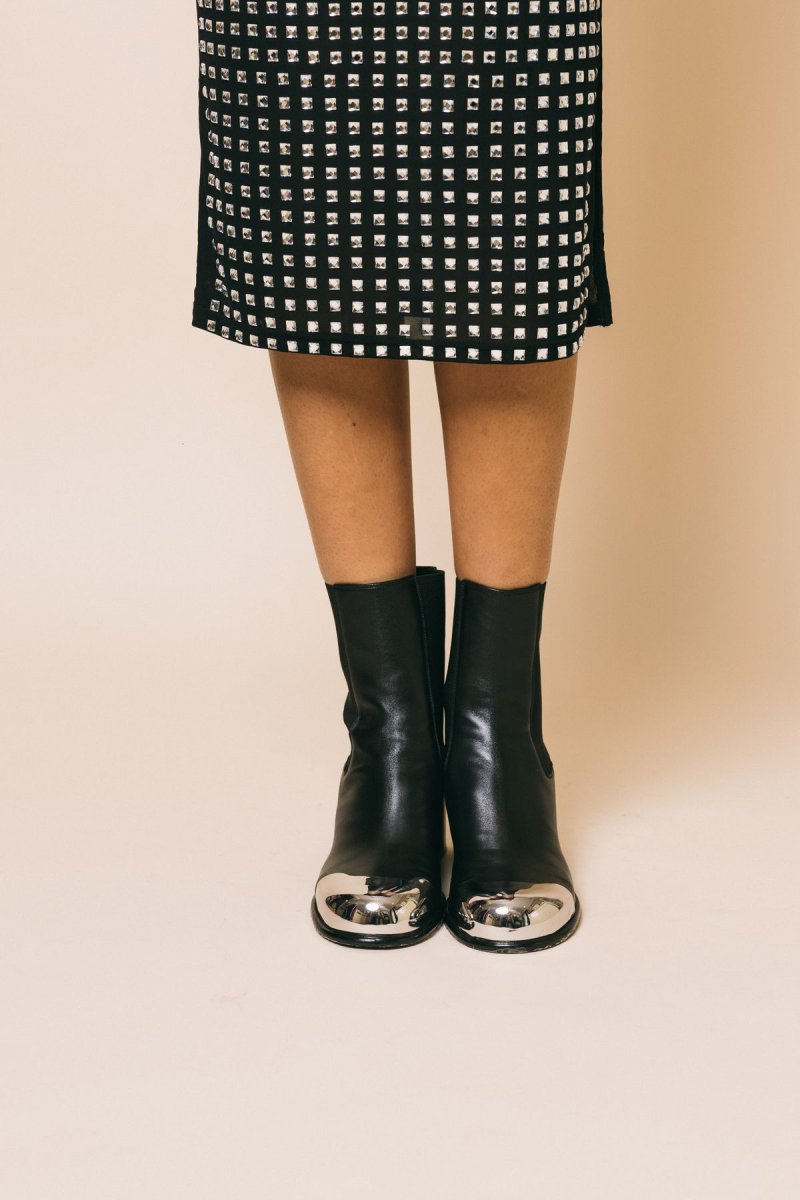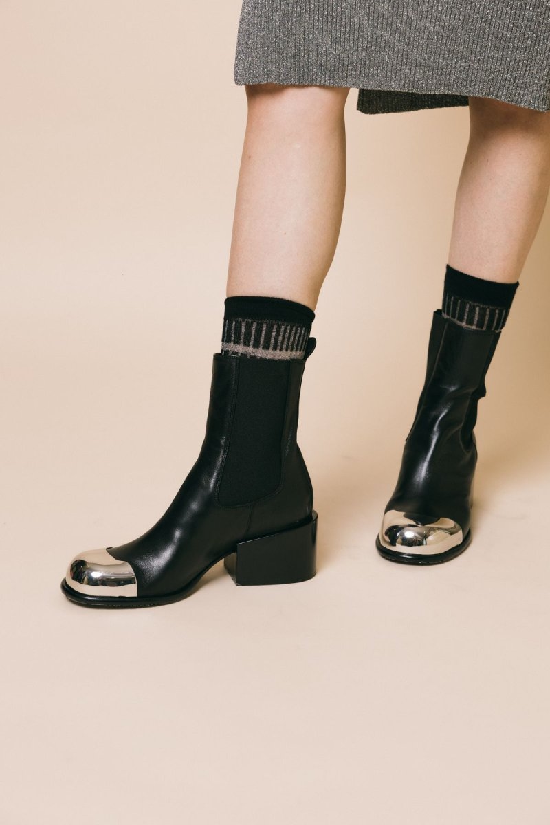 Stivale in pelle con punta in metallo argento Tomaia in pelle Fodera e soletta in pelle Suola in cuoio e gomma Altezza gambale: 16 cm Tacco: 6 cm Composizione: pelle Made in Italy