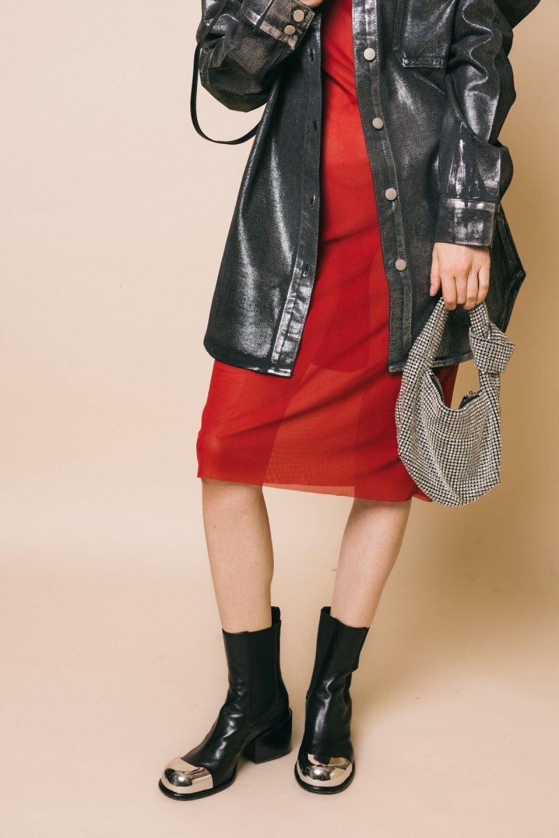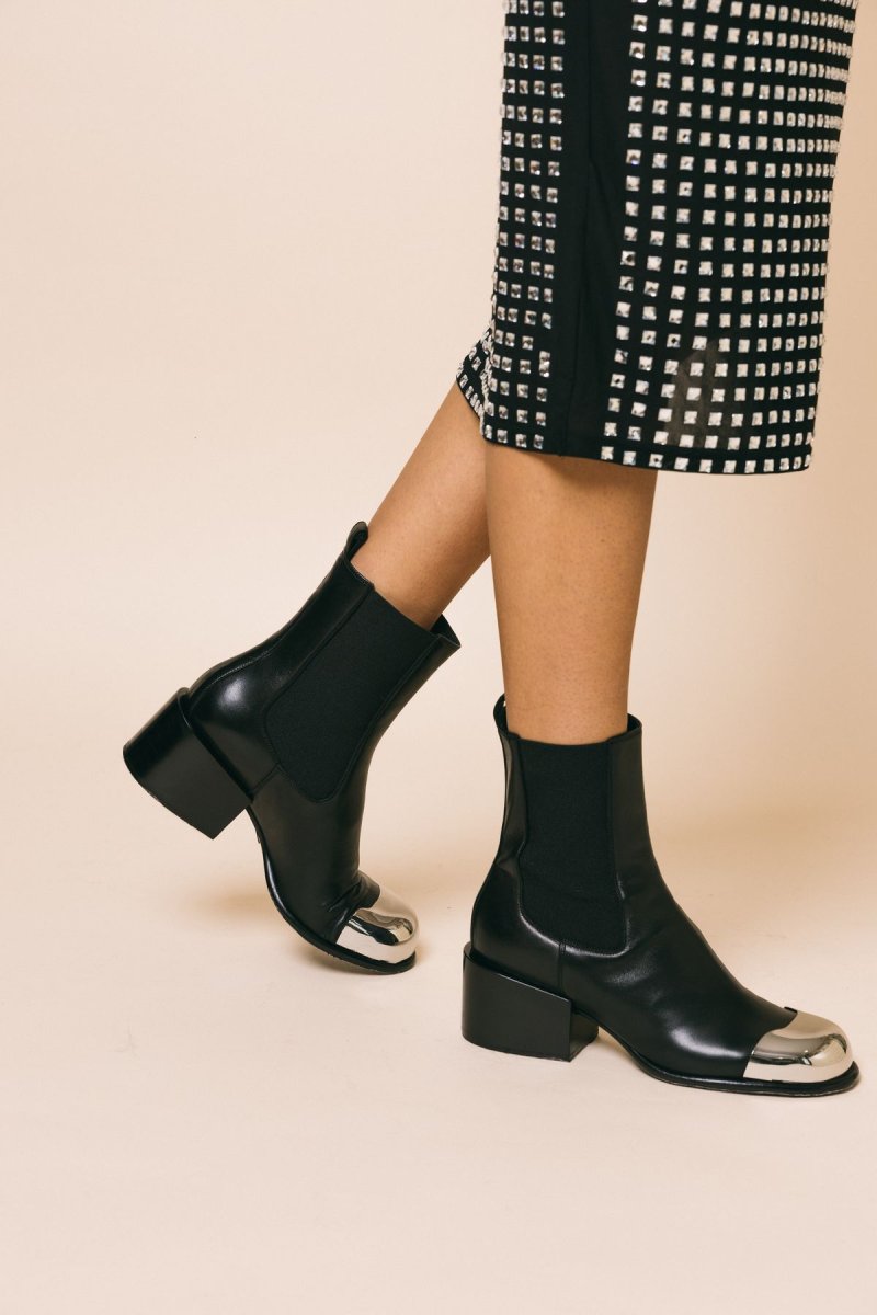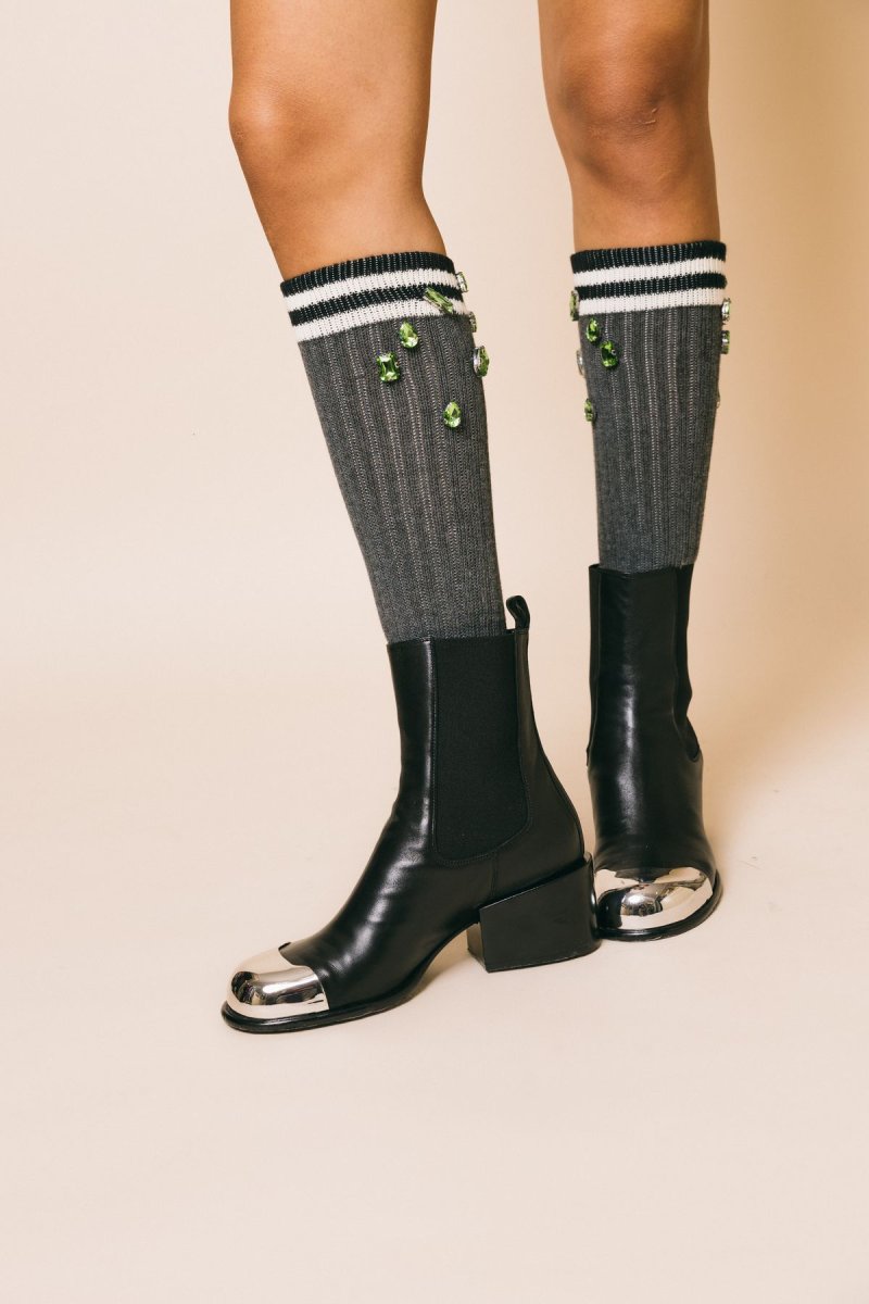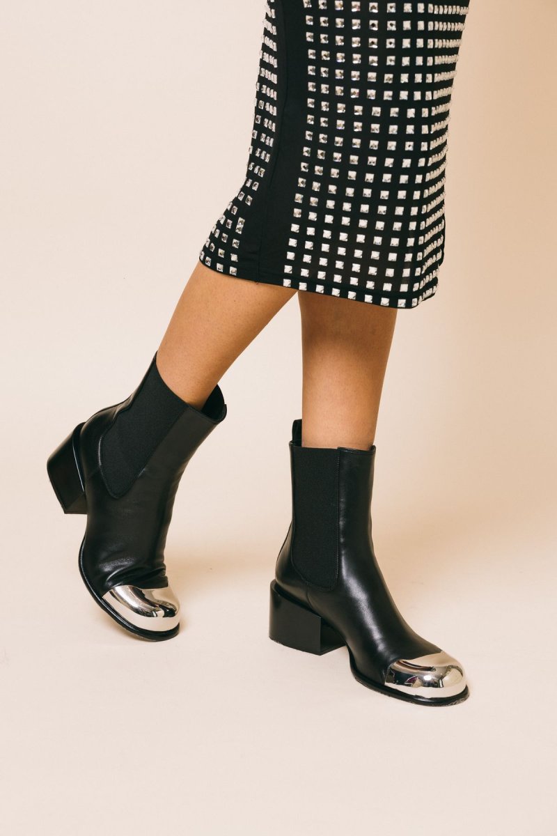 Stivale in pelle con punta in metallo argento Tomaia in pelle Fodera e soletta in pelle Suola in cuoio e gomma Altezza gambale: 16 cm Tacco: 6 cm Composizione: pelle Made in Italy