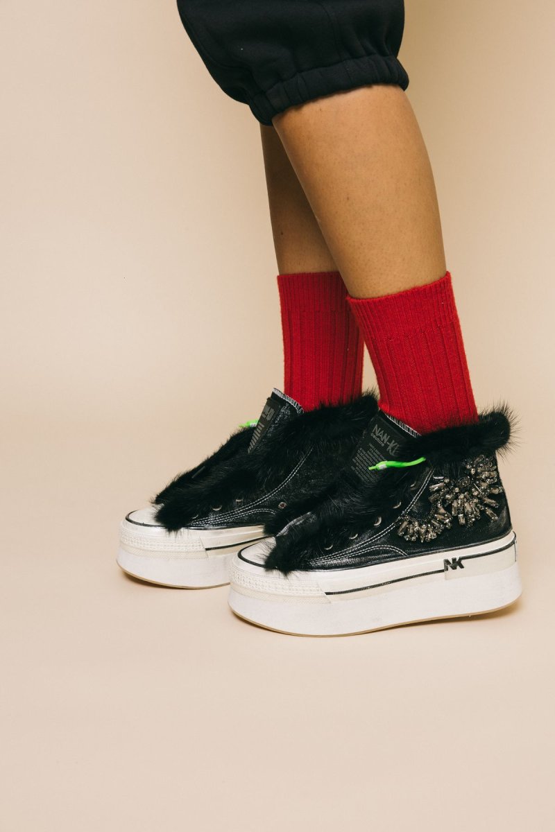 Sneakers alta in tela nera, dettaglio gioiello laterale ,applicazione visione nero sui bordi Altezza gambale: 10 cm Altezza fondo: 7,2 cm