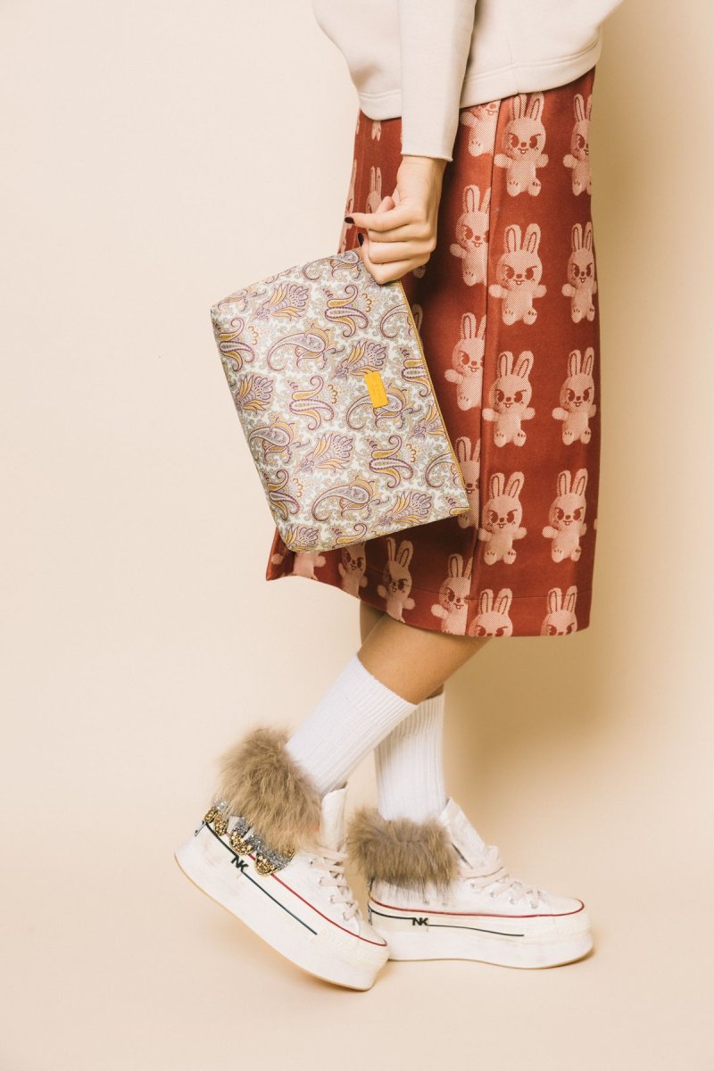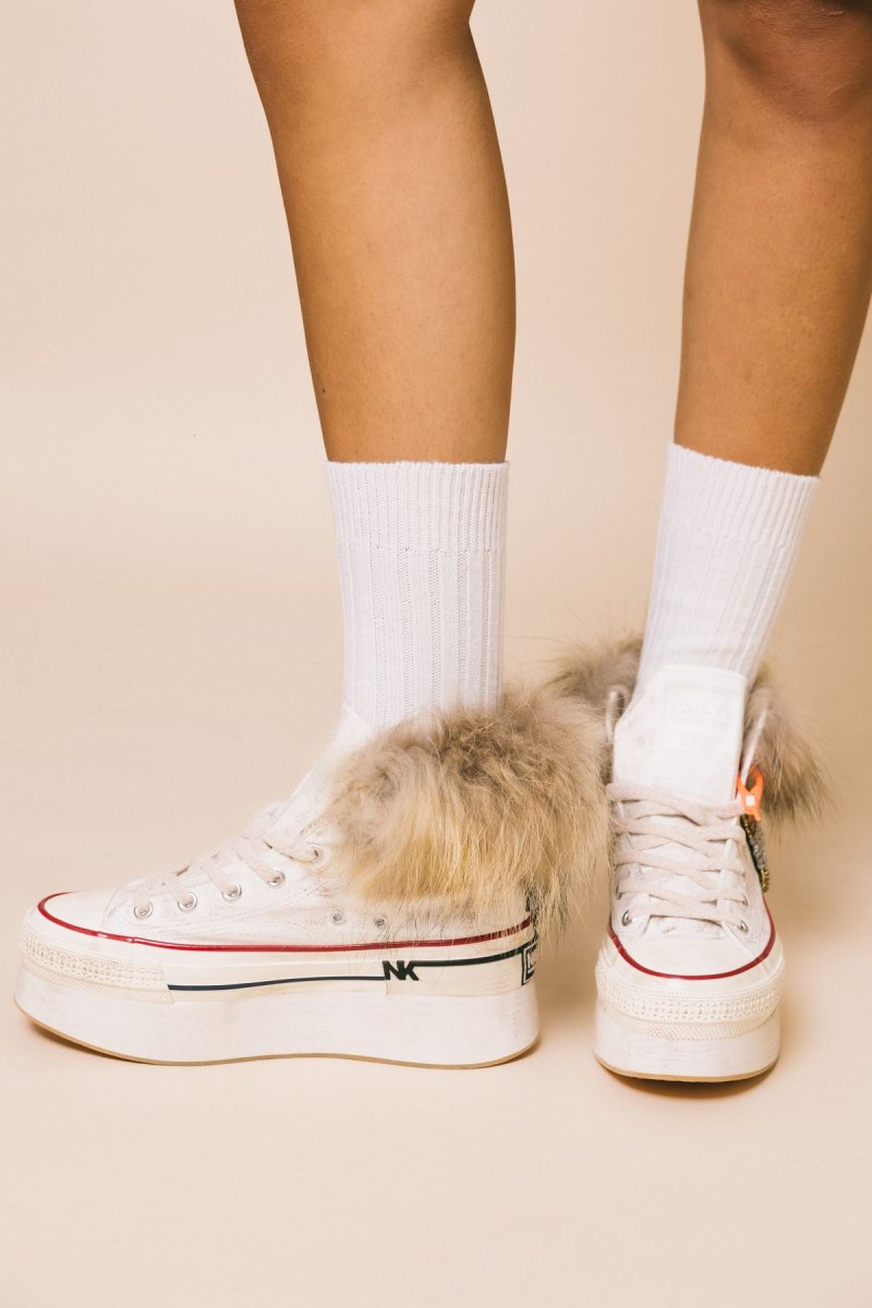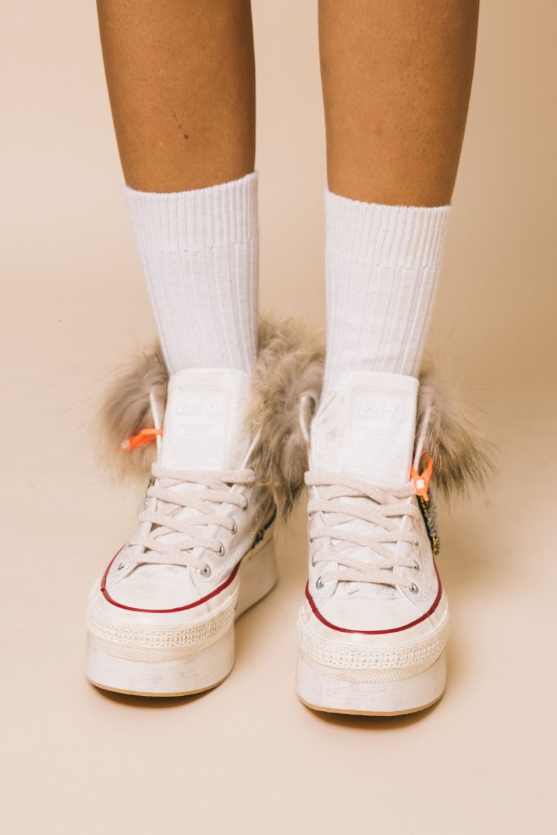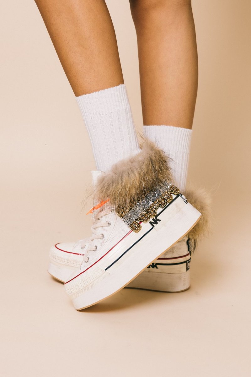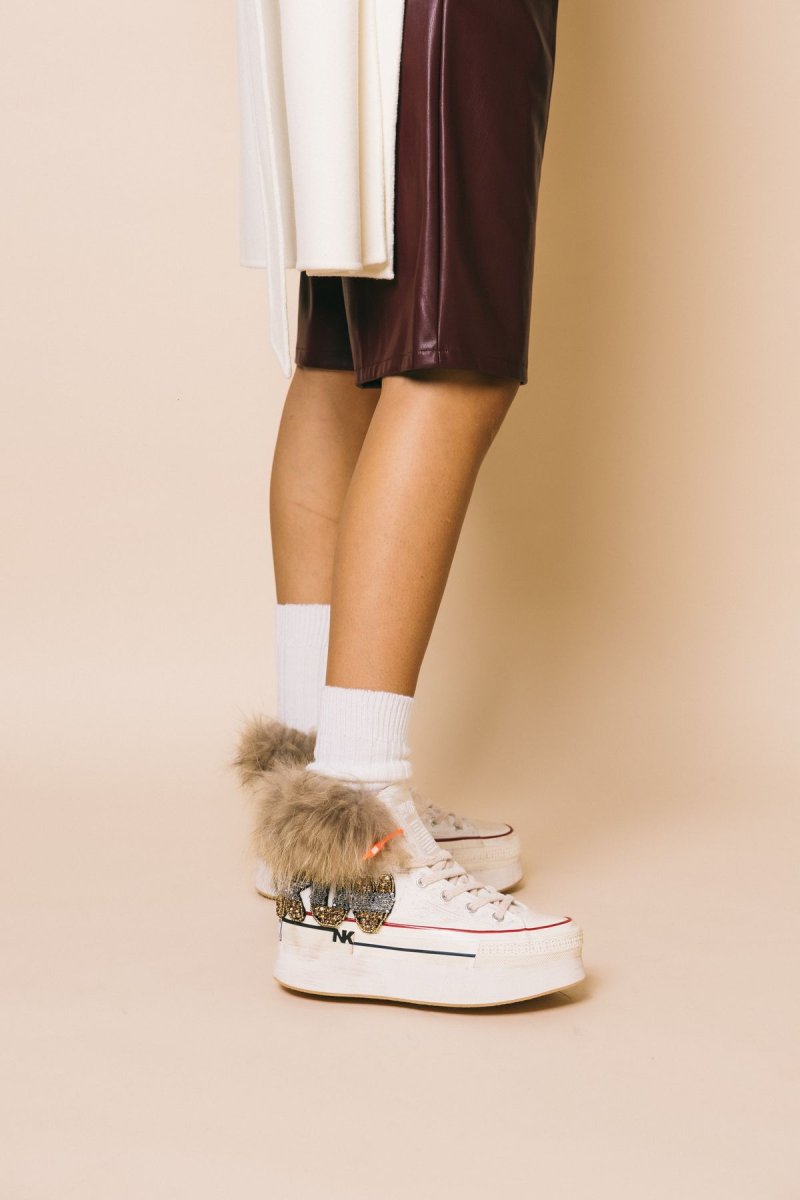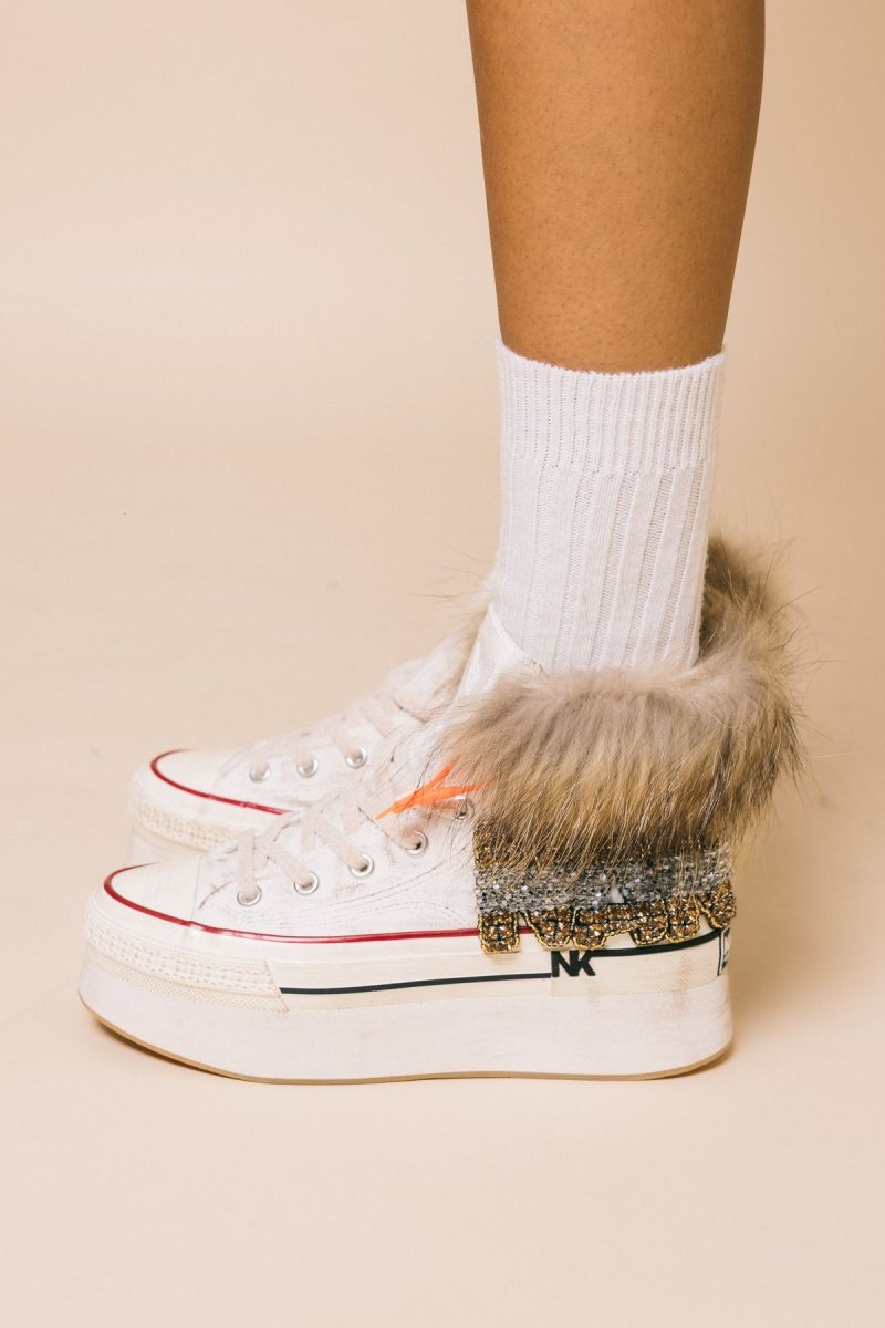 Sneakers alta in tela bianca, dettaglio gioiello laterale , applicazione volpe sul bordo