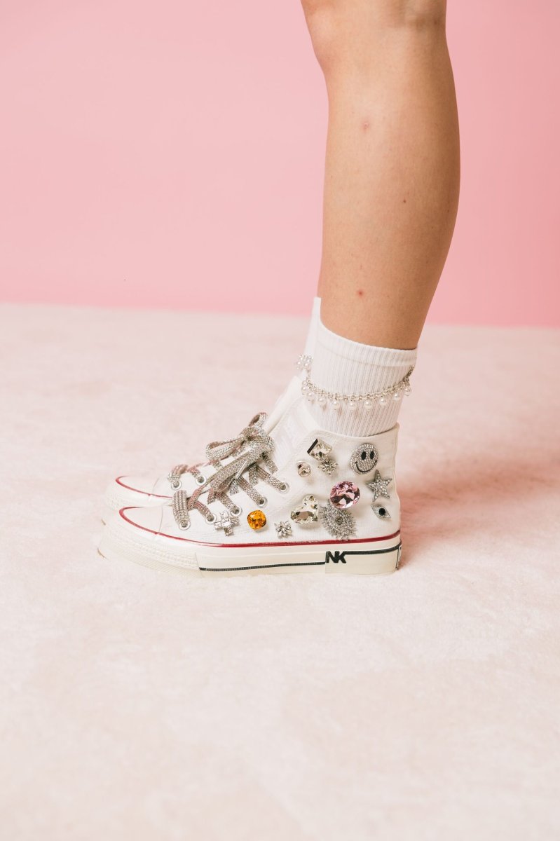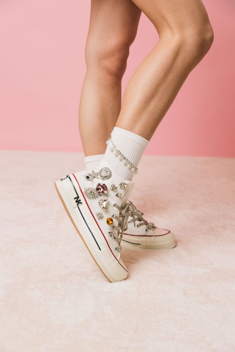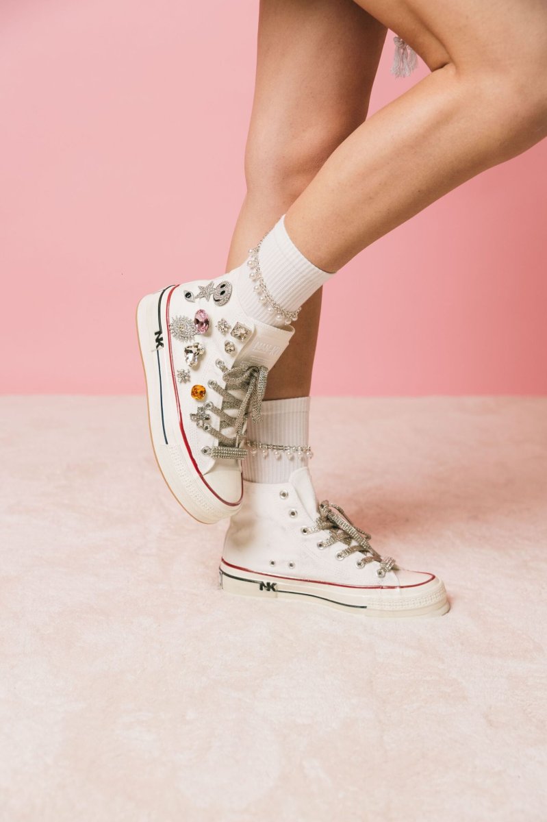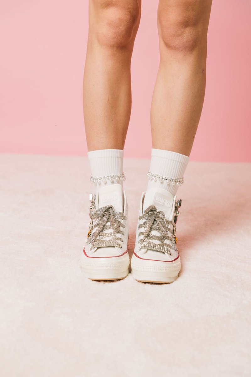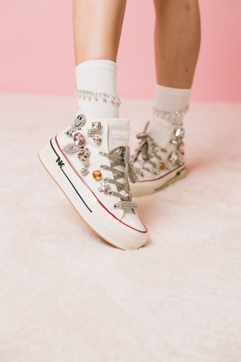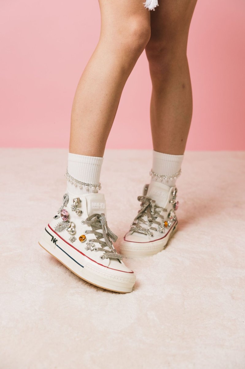Un equilibrio perfetto tra artigianalità e modernità, sneakers realizzata a mano che esprime raffinatezza e ricercatezza attraverso applicazioni gioiello crystal e multicolor, impreziosite da una piastra in pavèe crystal che dona ulteriore luminosità. I lacci in silver lurex aggiungono un tocco di eleganza discreta, mentre la suola rialzata, da 2 cm e la zeppa da 5,5 cm garantiscono slancio e comfort.