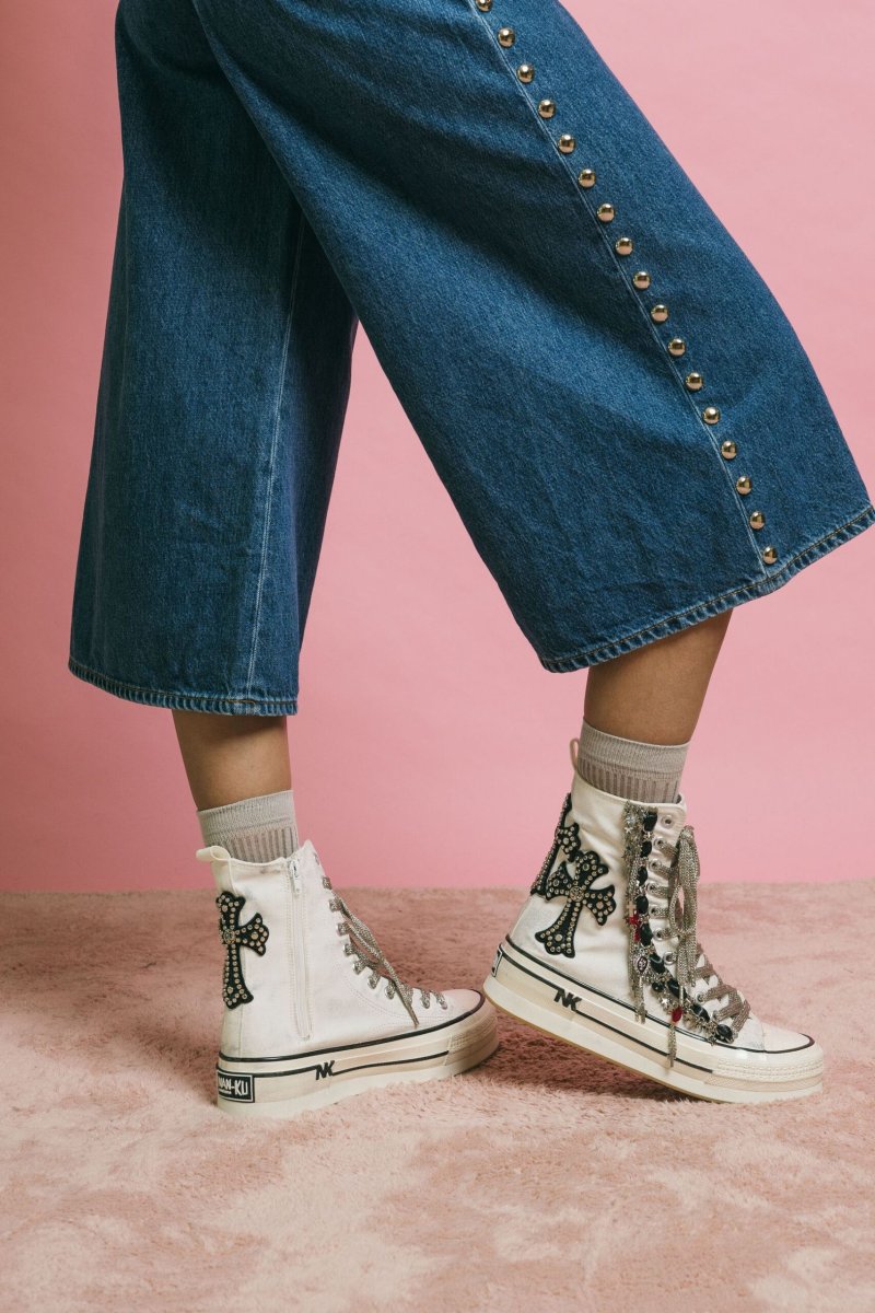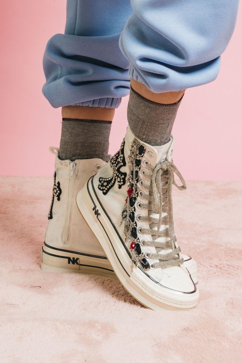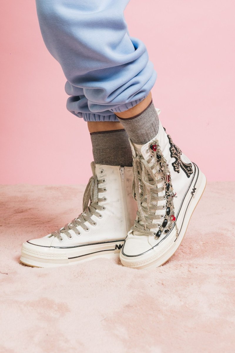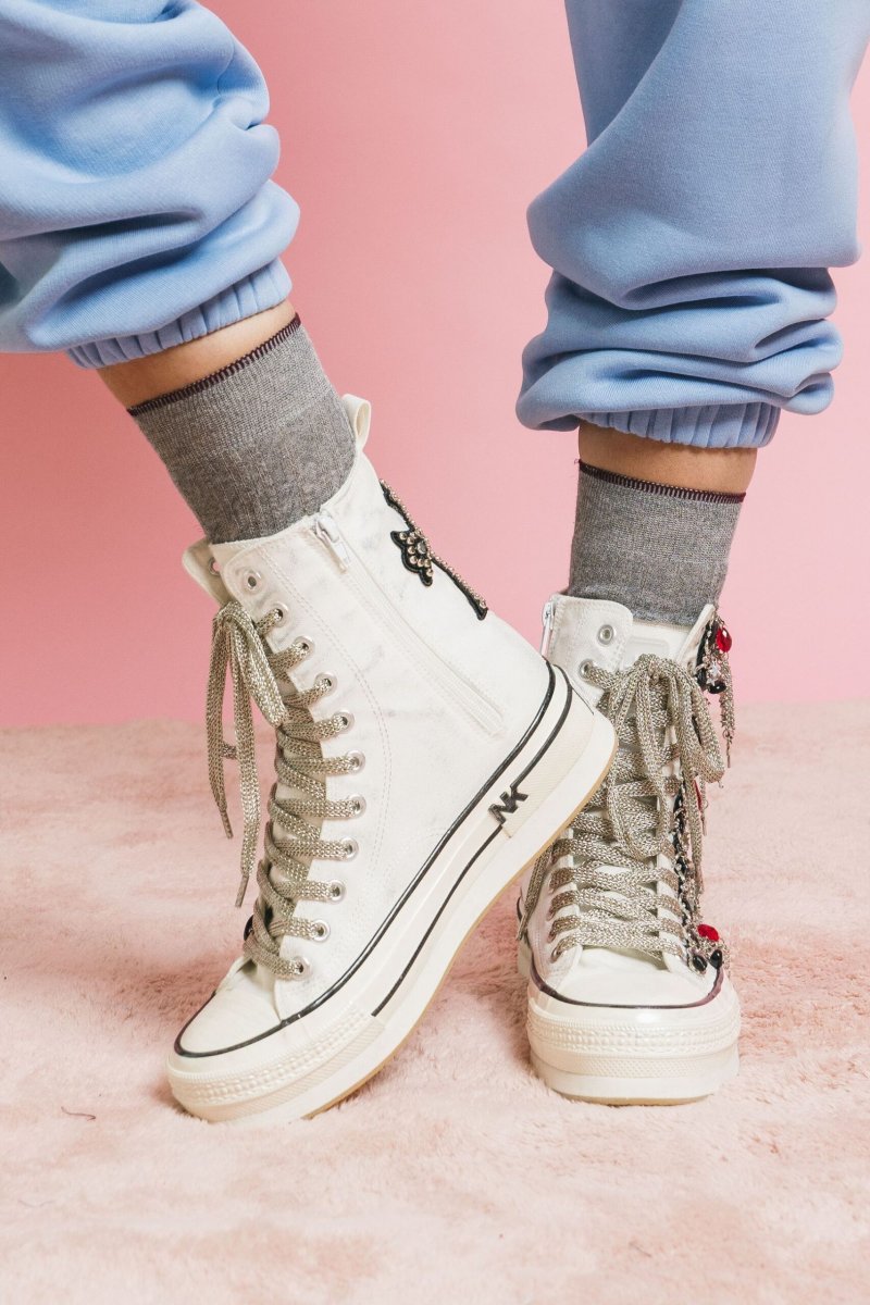 Sneakers alte in canvas bianco, dal carattere deciso e raffinato, arricchite da dettagli unici che trasformano una calzatura casual in un pezzo statement.