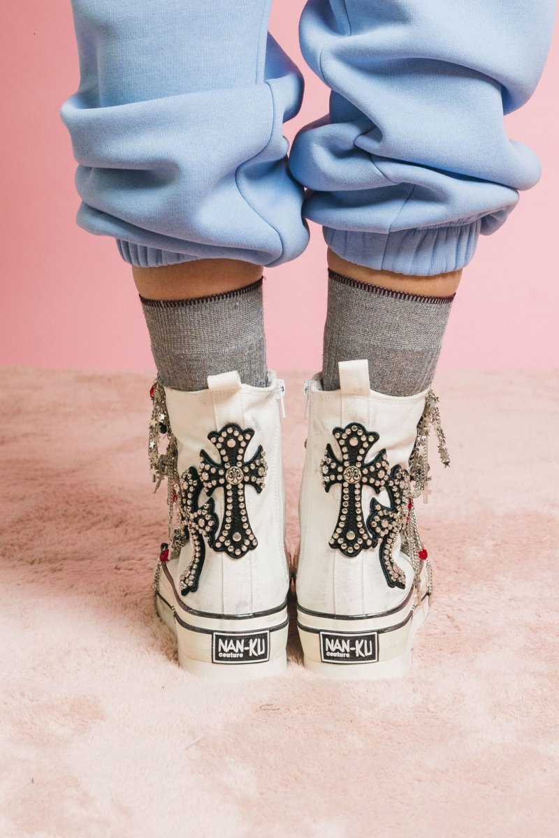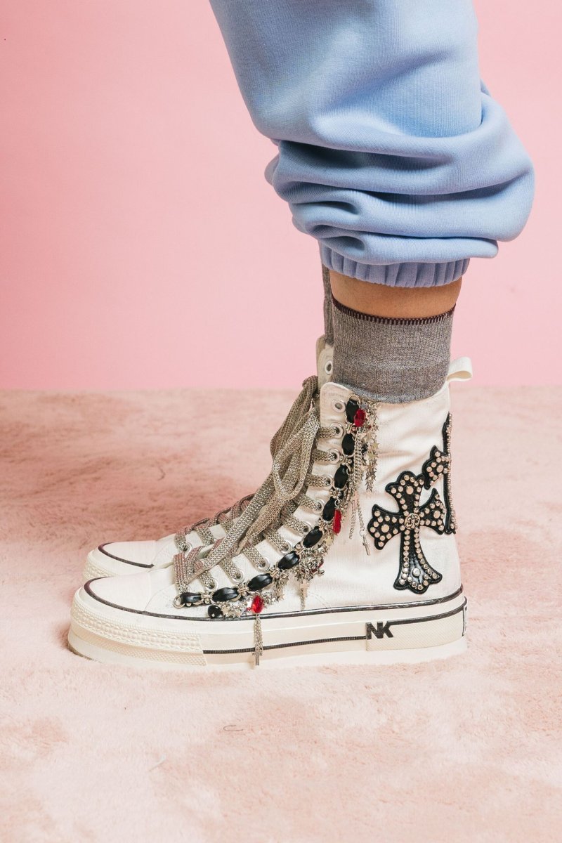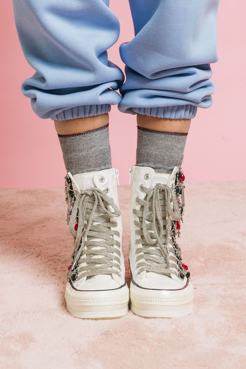 Sneakers alte in canvas bianco, dal carattere deciso e raffinato, arricchite da dettagli unici che trasformano una calzatura casual in un pezzo statement. Il modello è impreziosito da: Crocifissi decorativi applicati lateralmente in pelle nera con borchie metalliche Lacci in tessuto lurex argento, inpreziosite da charms gioiello a forma di stelle, croci e cristalli rossi. Altezza suola platform in gomma 5,5 cm Altezza gambale: 15 cm Chiusura con zip interna per una calzata pratica e veloce. Un connubio tra stile urban e allure rock-chic, perfette per chi ama distinguersi. Dettagli tecnici Tomaia: canvas bianco con inserti in pelle e borchie…