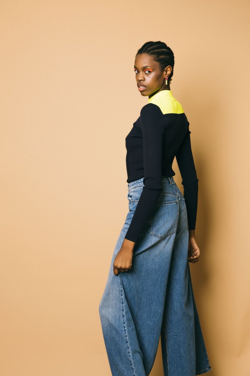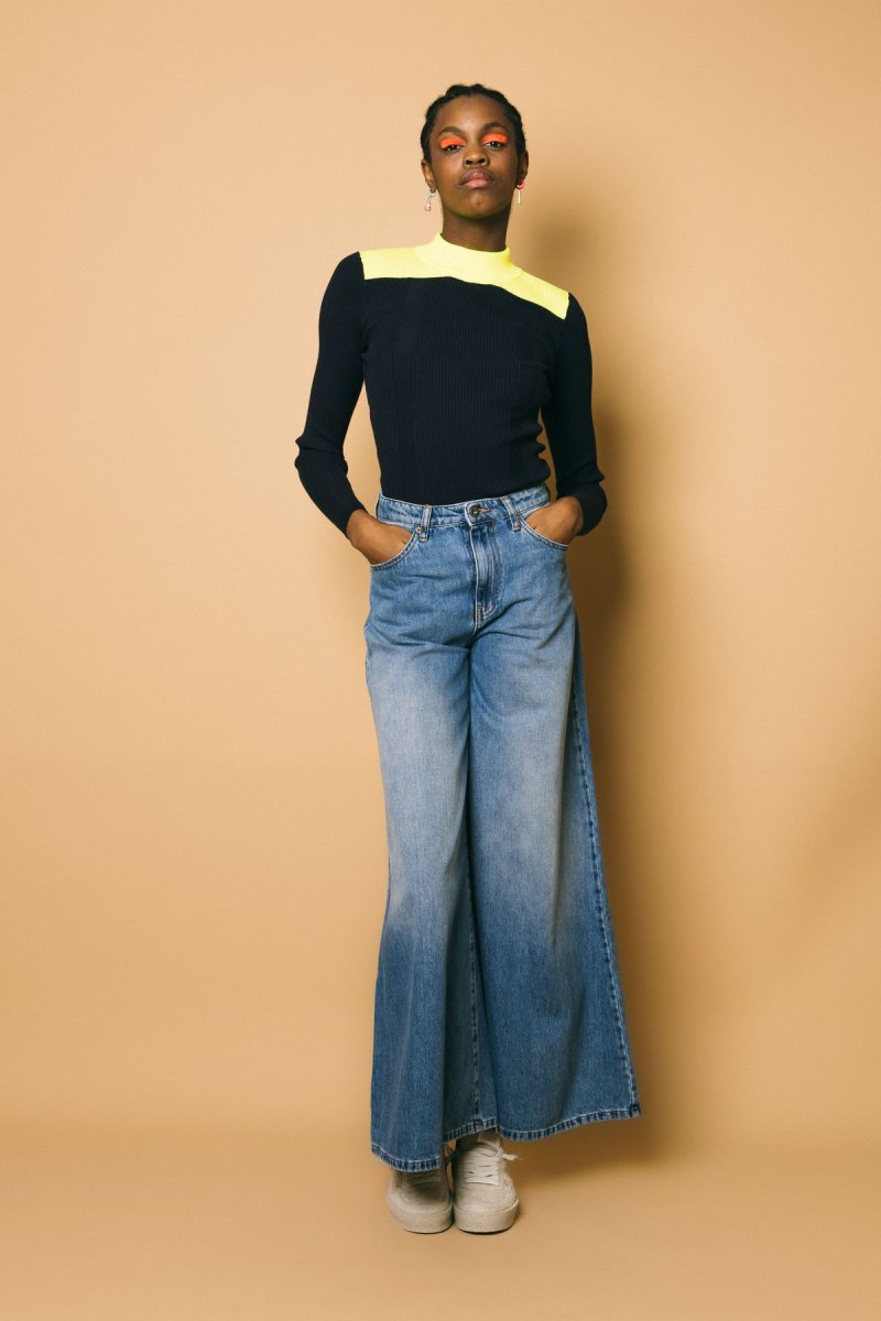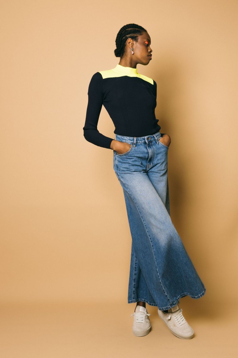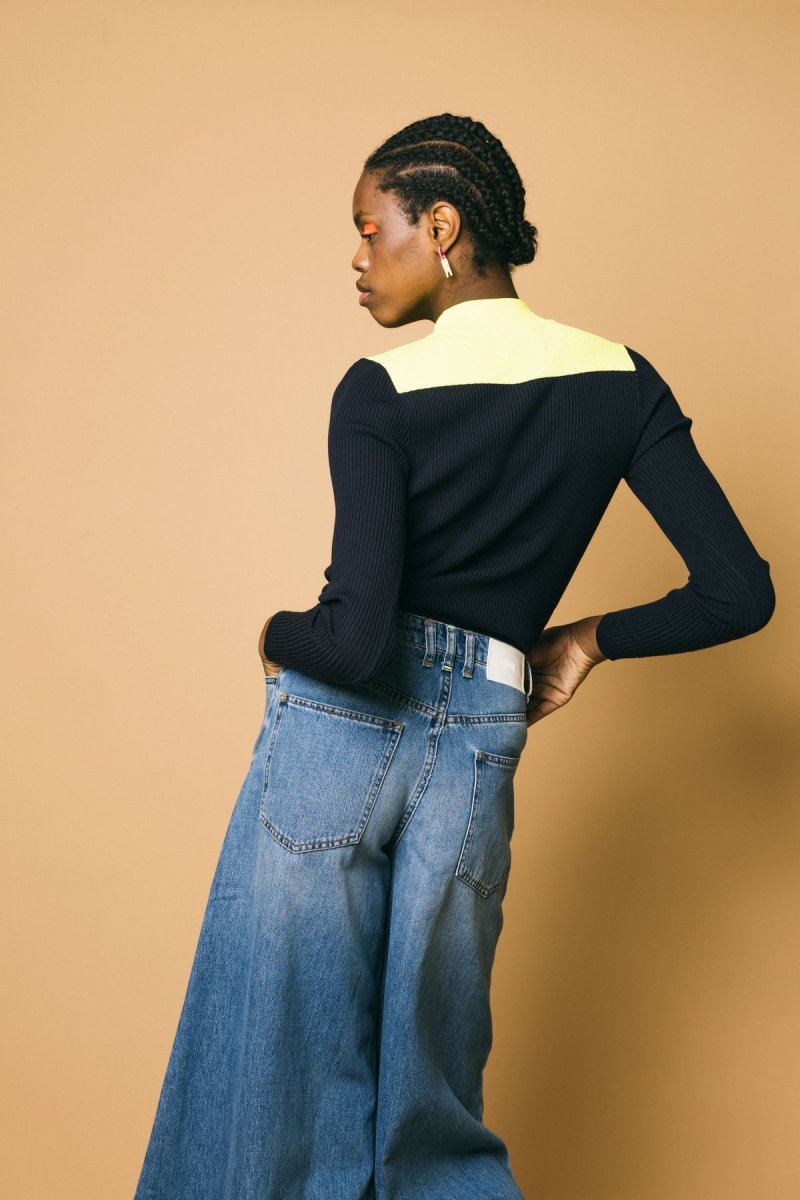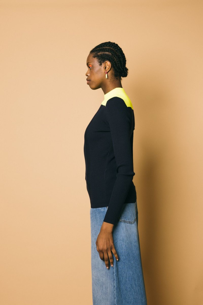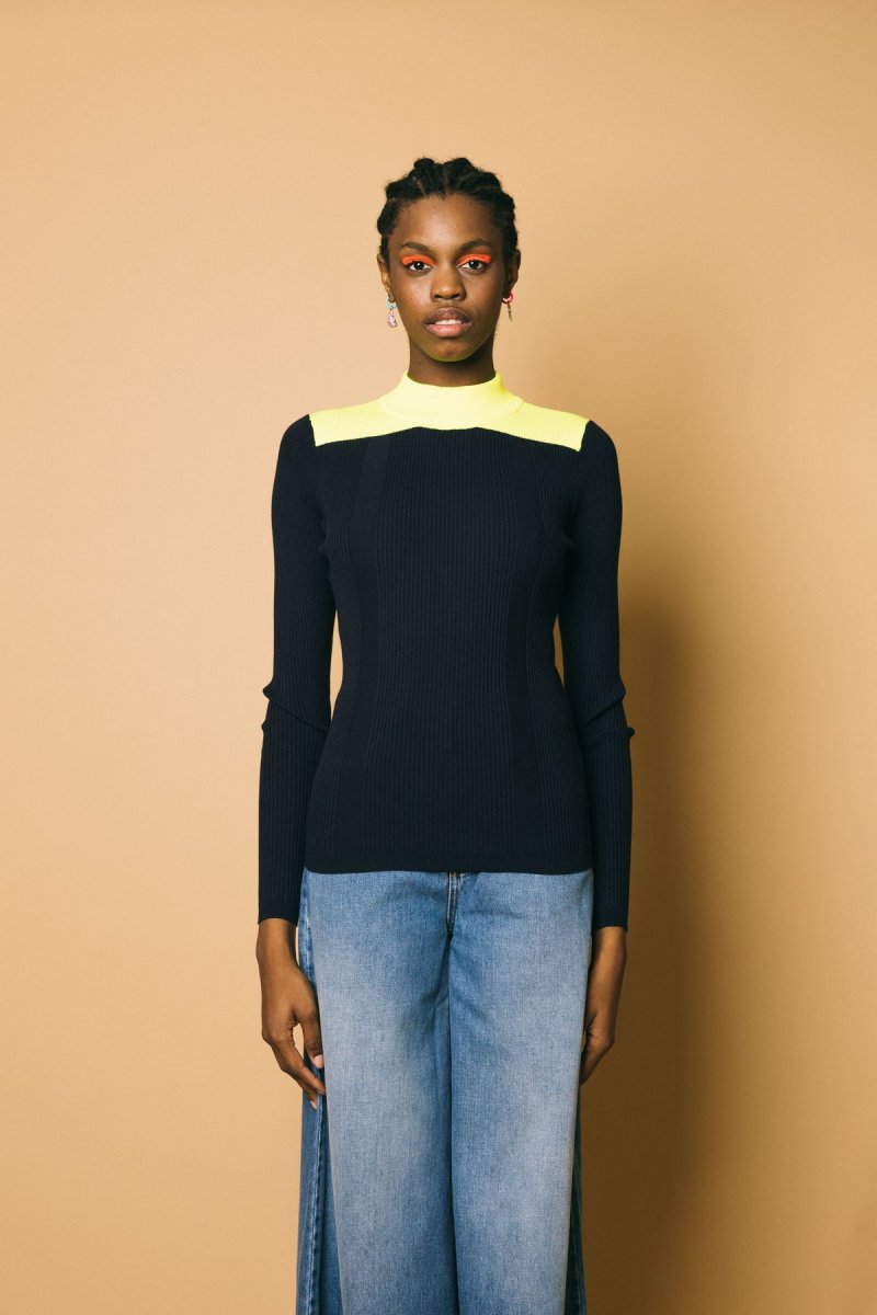 Maglia maniche lunghe, tessuto molto elasticizzato a costine, vestibilità estremamente confortevole, collo rotondo a contrasto color-blocking Altezza modella: 1.81cm Taglia indossata: S 52% viscosa 32%poliestere 16% poliestere riciclato Lavaggio a mano