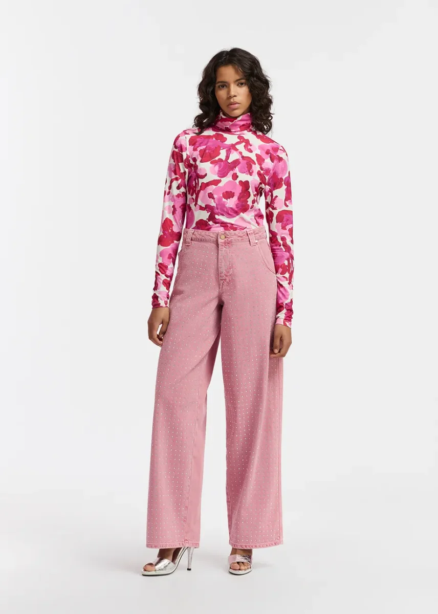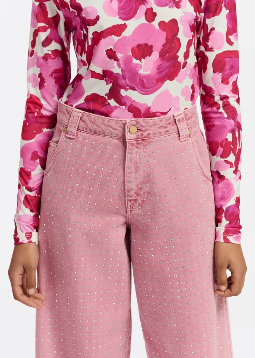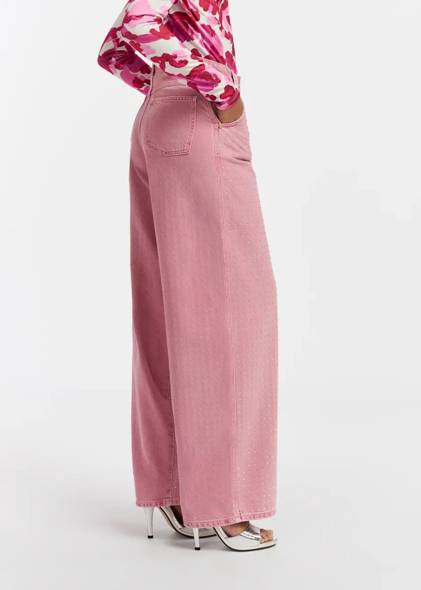 Jeans vita alta, gamba larga impreziositi da strass rosa su tutta la parte anteriore, vestibilità comoda