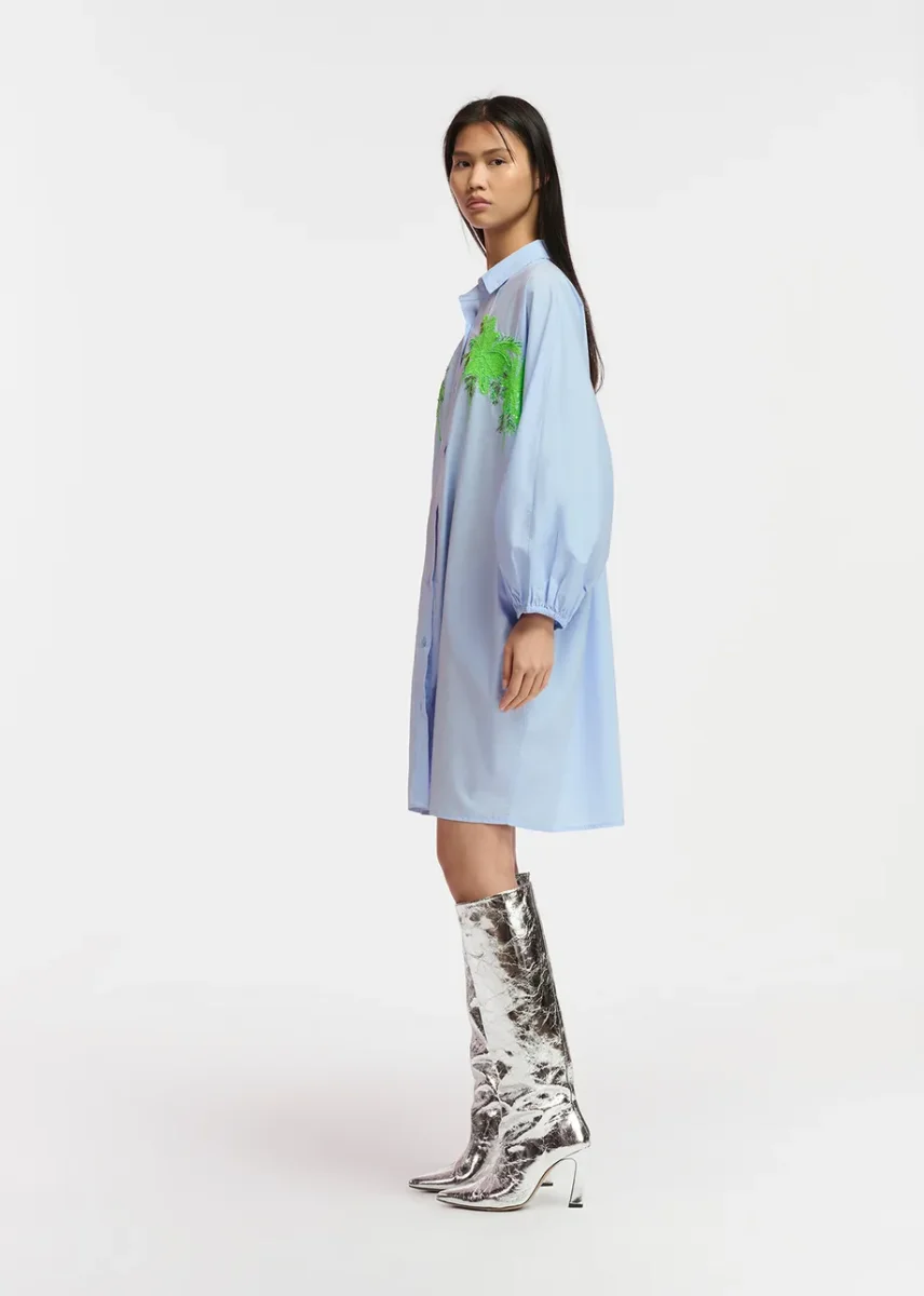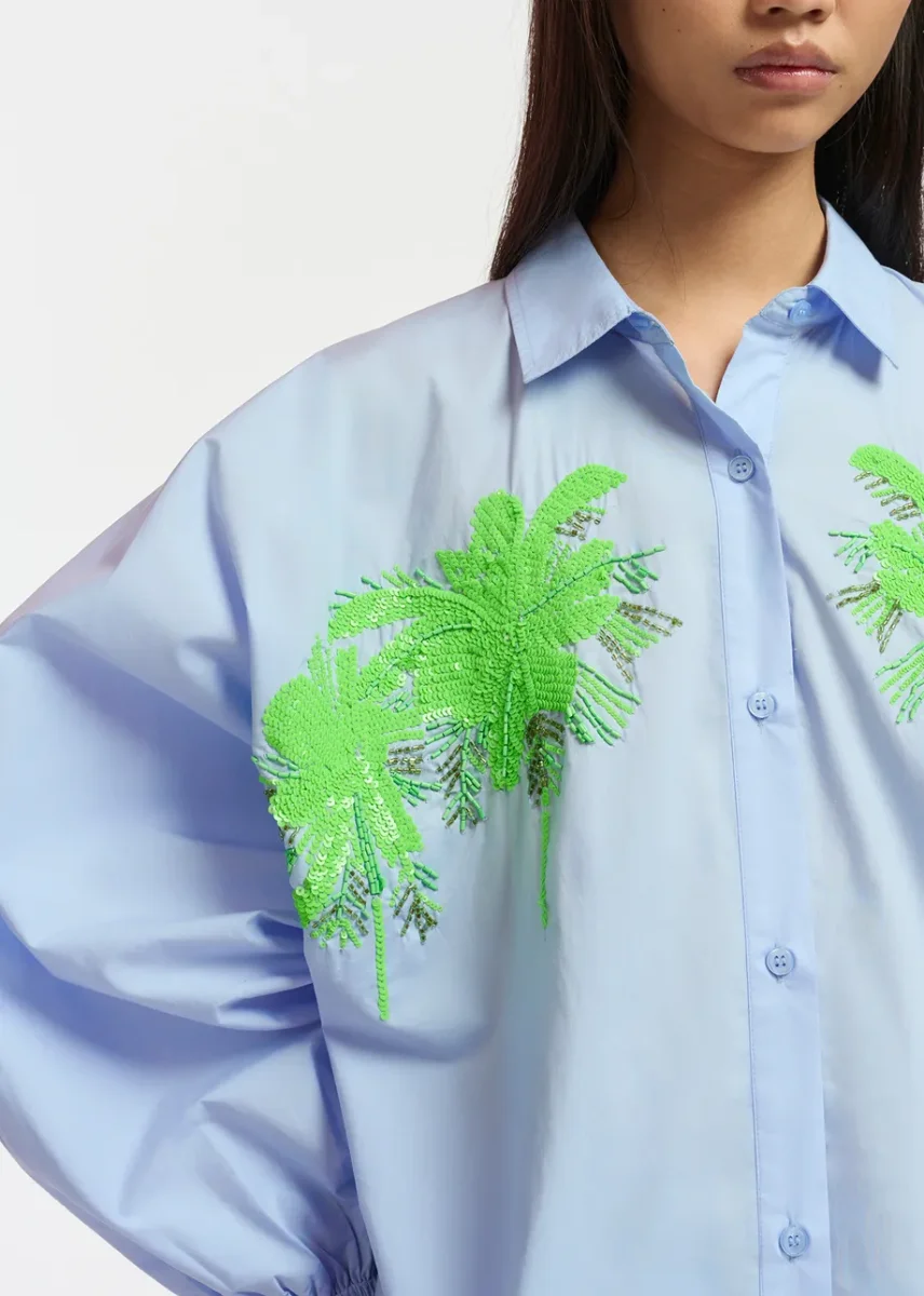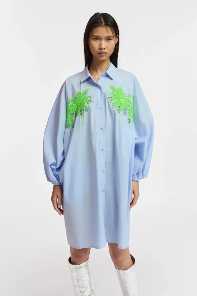 Abito camicia over in cotone popeline, dettaglio decorazione palme con paillettes e perline lilla, manica ampia con elastico sul fondo