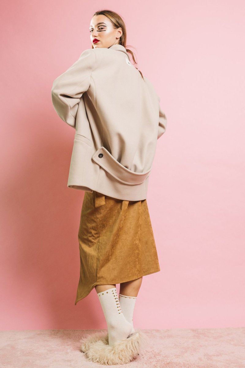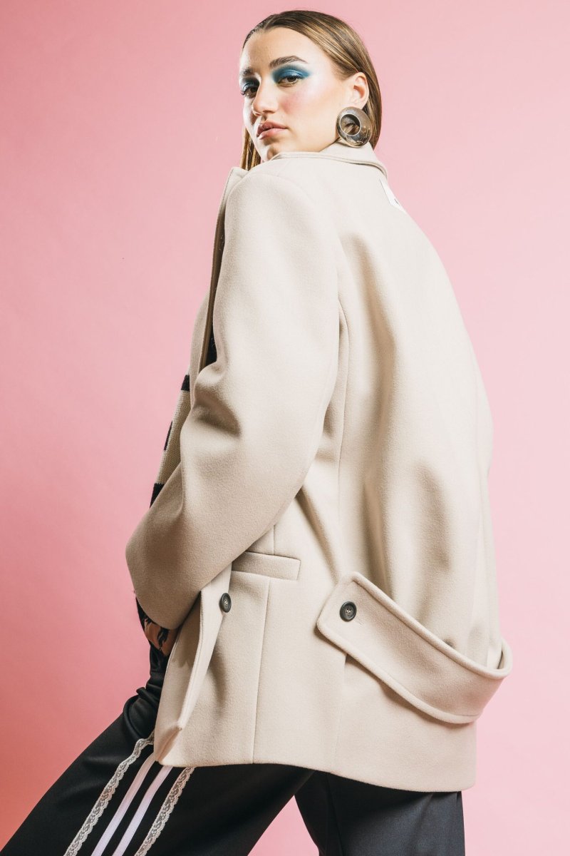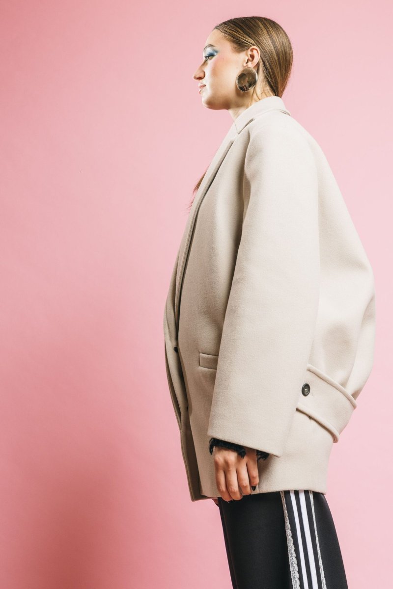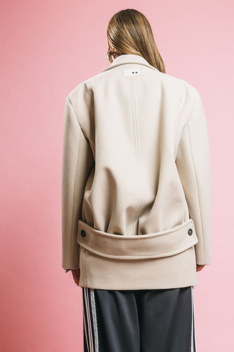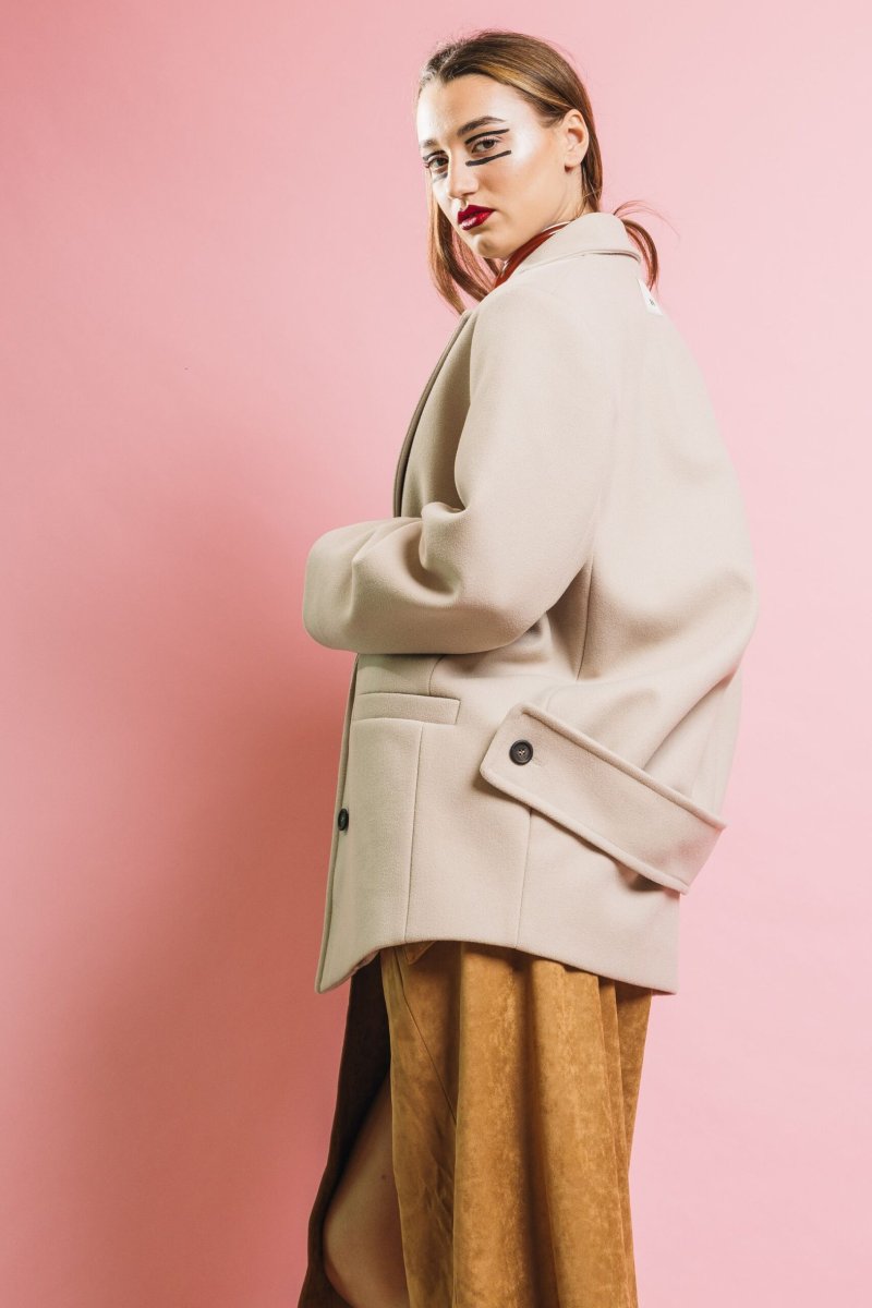 Questo capospalla è caratterizzato da una linea relax fit che coniuga comfort e struttura. La chiusura è nascosta con doppio bottone a pressione, mentre l’interno presenta una tasca a filetto. Su retro un fascione con asole funge da dettaglio distintivo: può essere rimosso senza alterare l’architettura del capo. Completa il design l’etichetta con logo posizionata sotto il colletto. Un capo dal carattere essenziale ma ricercato, realizzato con cura sartoriale e 100% made in Italy.