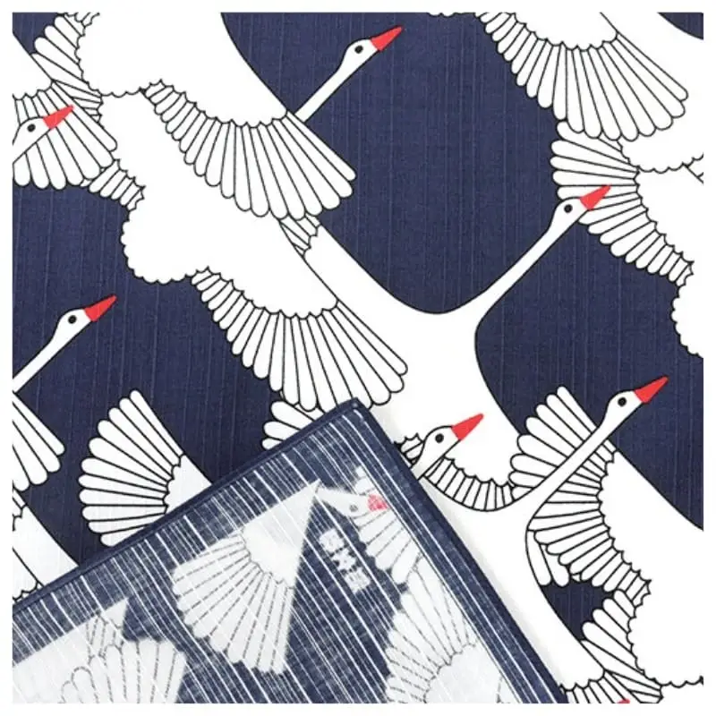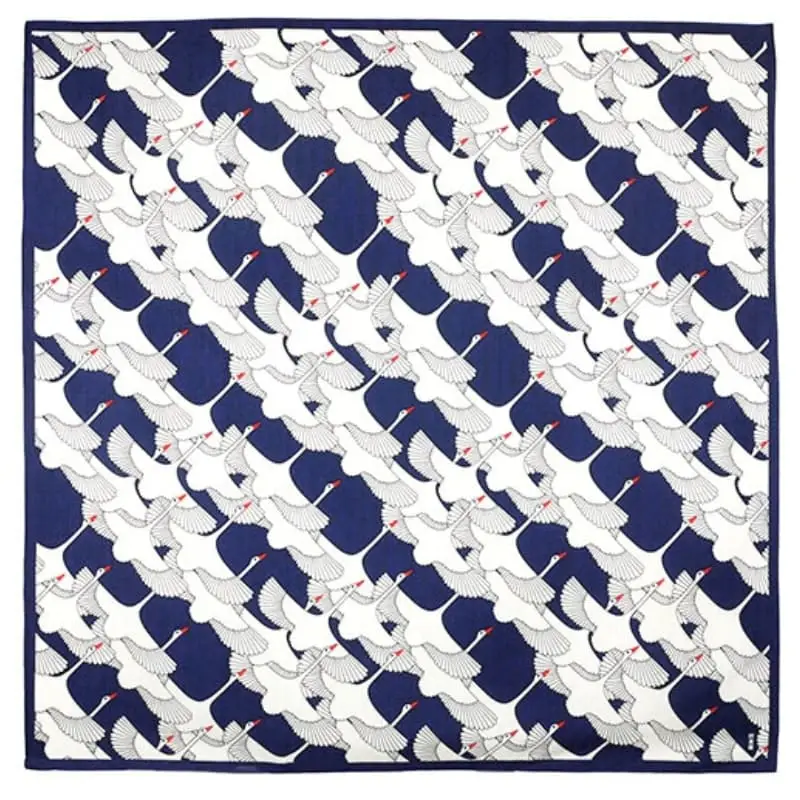 Questo furoshiki giapponese raffigura un volo di gru, simbolo tradizionale di longevità e felicità in Giappone. Il suo motivo ripetitivo con le linee pulite gli conferisce uno stile grafico senza tempo, ideale per impreziosire un imballaggio o decorare una parete. Il furoshiki realizzato in Giappone in cotone shantung, un tessuto morbido e resistente, misura 90×90 cm e si trasforma in una borsa grazie a un semplice manico. Un accessorio pratico e significativo.