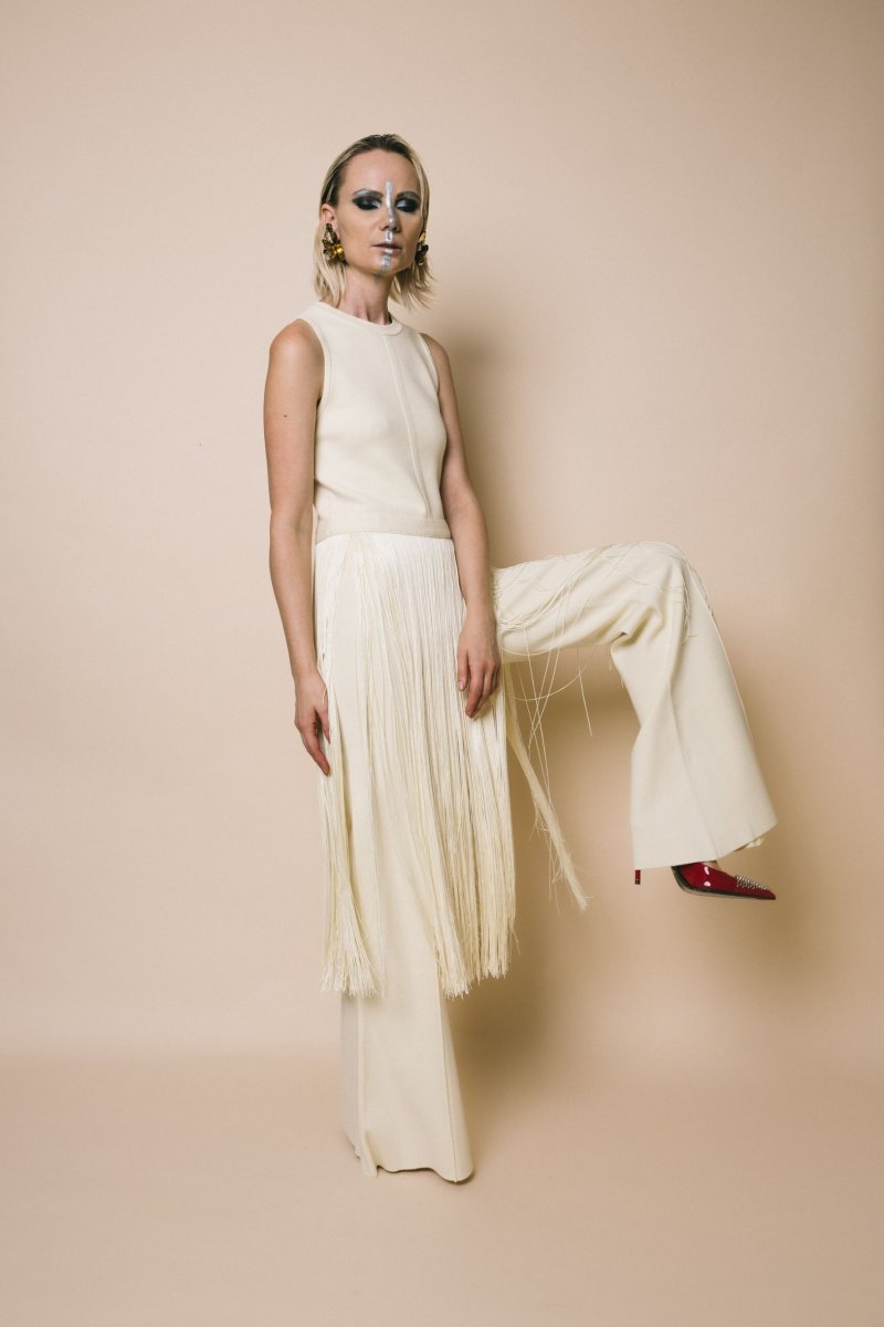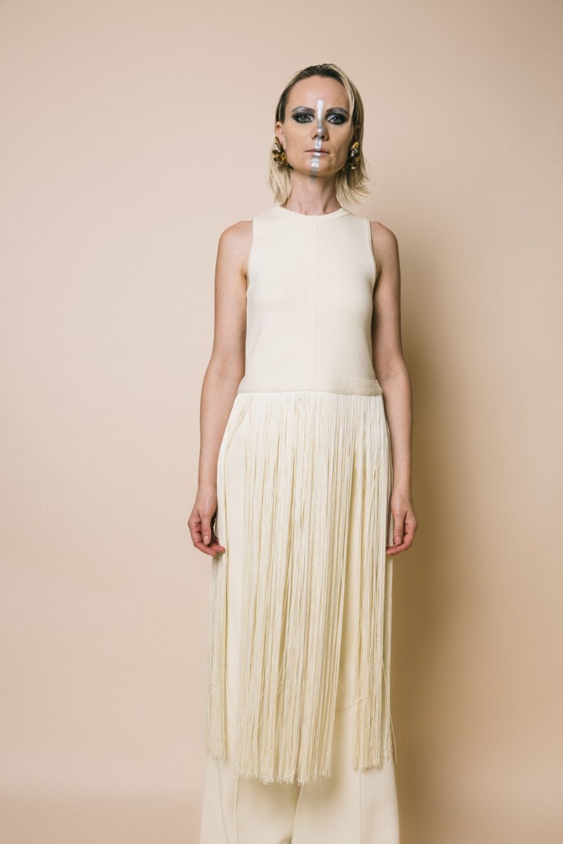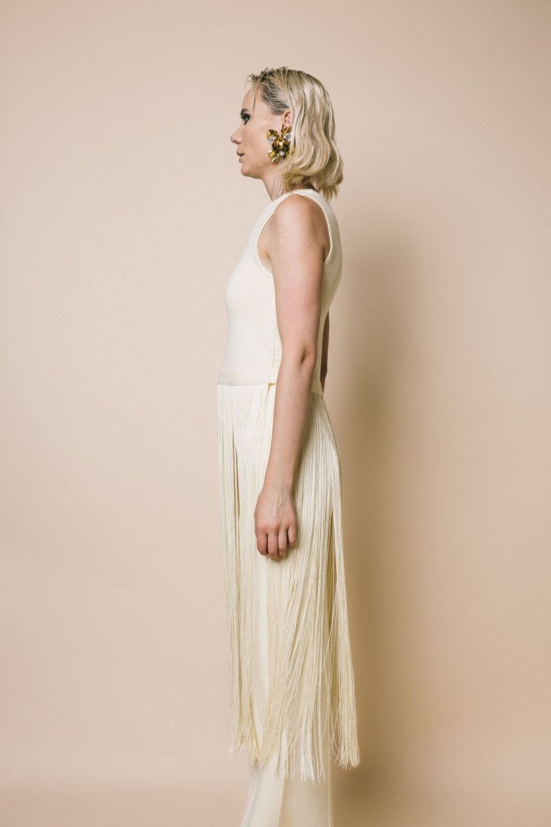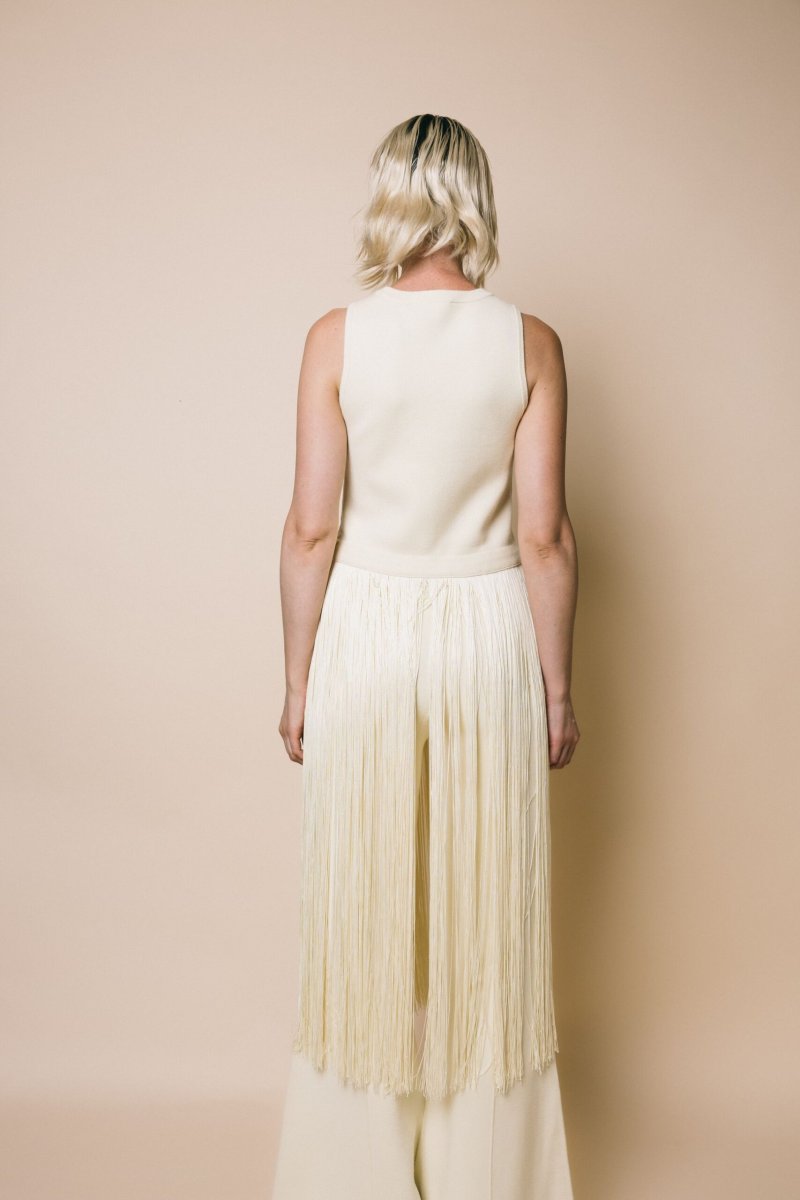 Top in maglia con lunghe frange che scendono ben sotto le ginocchia, aggiungendo movimento e consistenza alla silhouette