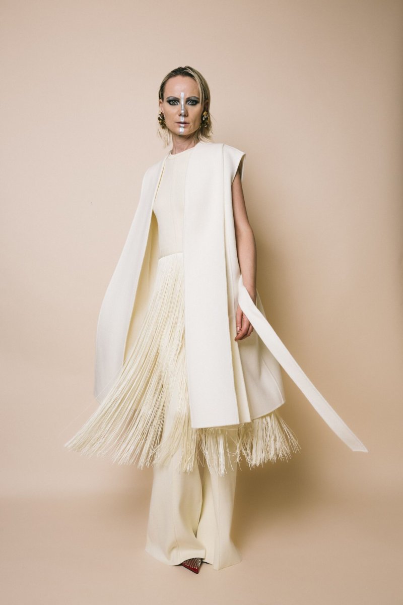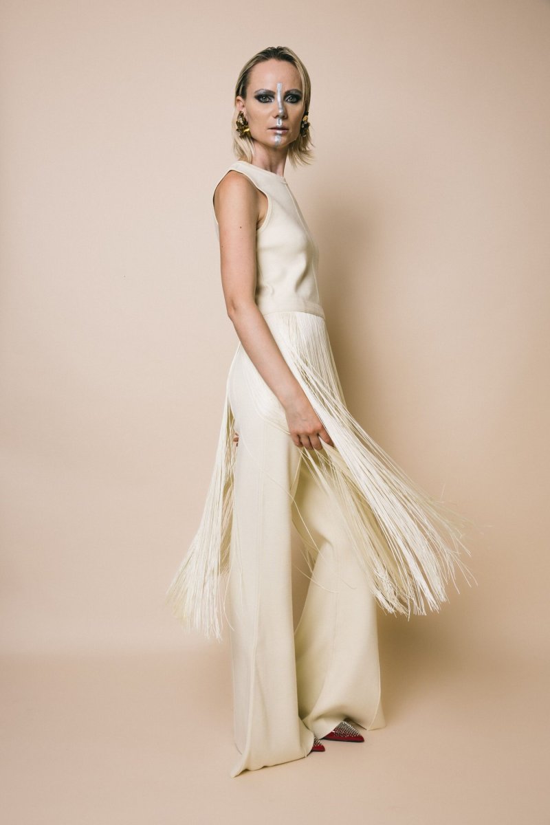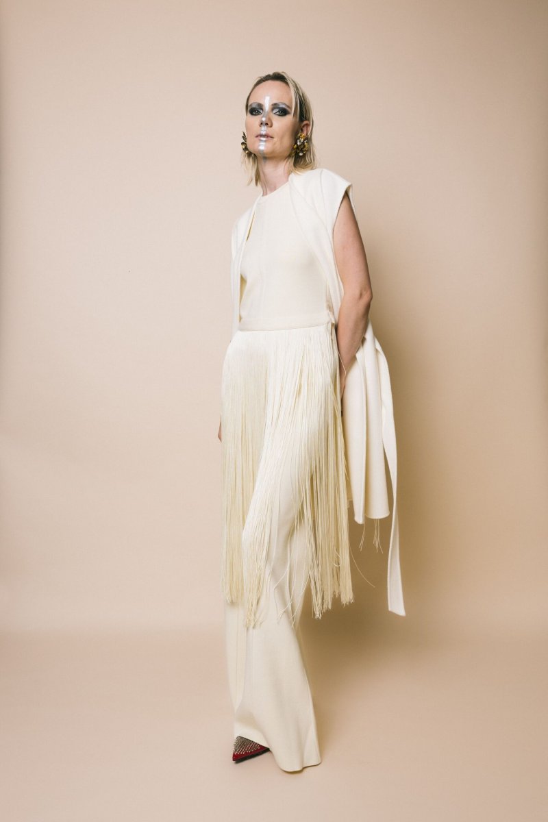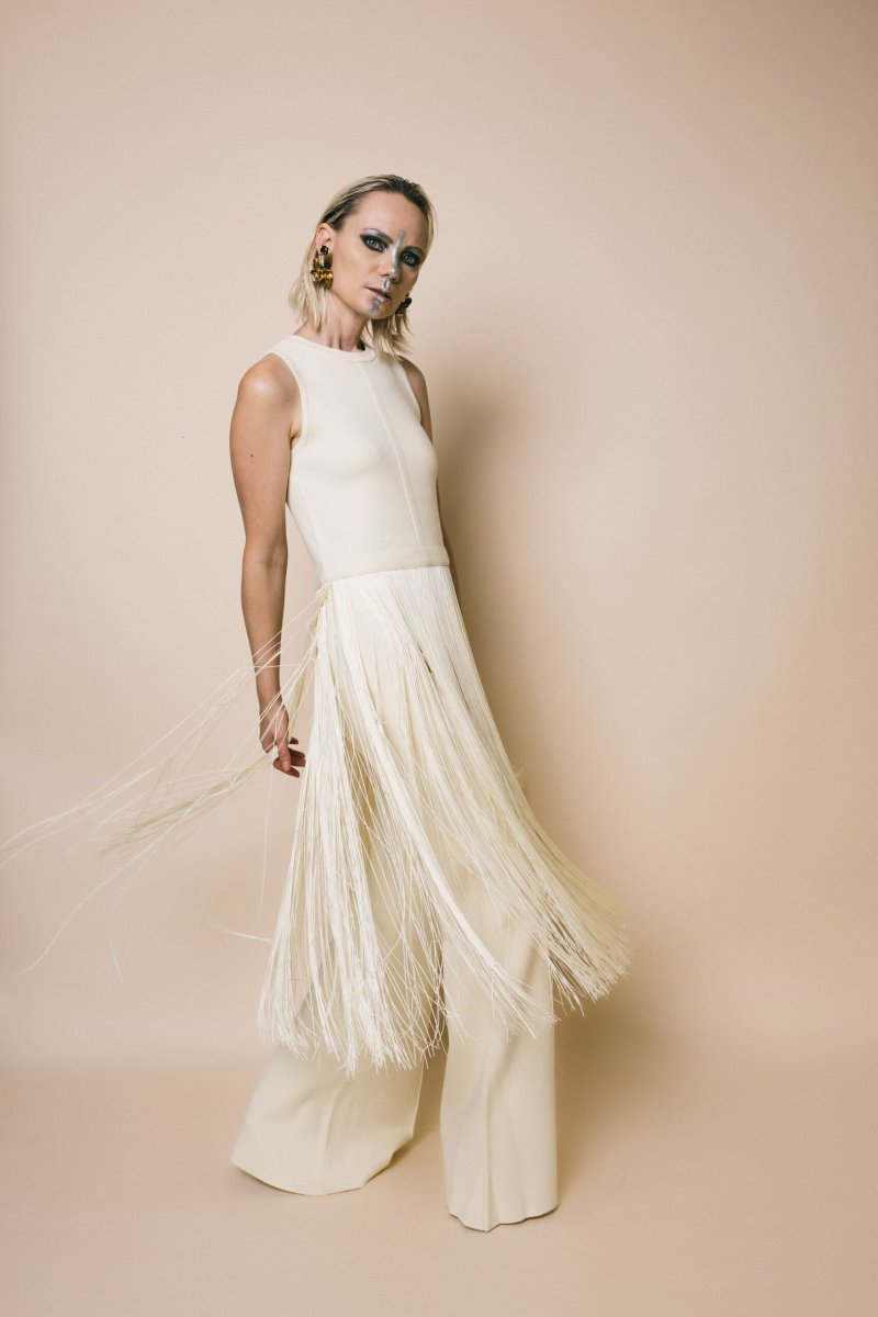 Top in maglia con lunghe frange che scendono ben sotto le ginocchia, aggiungendo movimento e consistenza alla silhouette