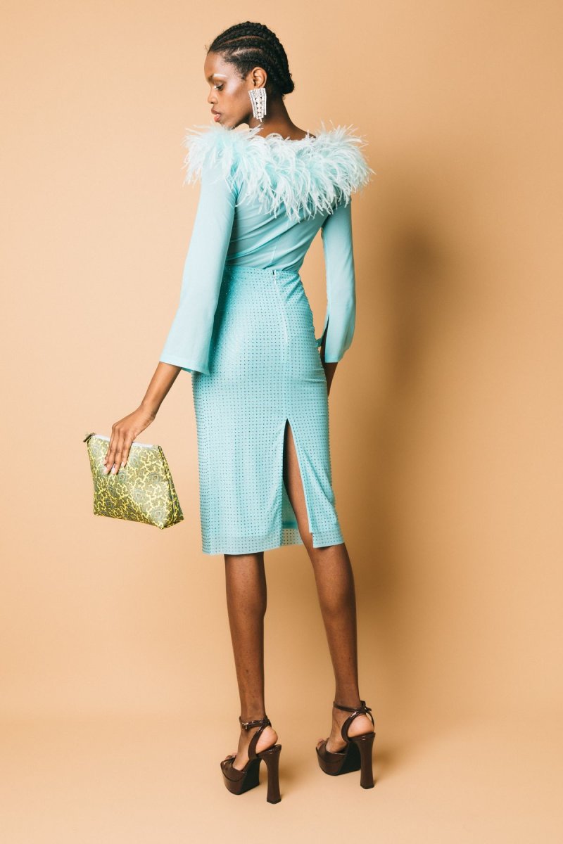 Gonna modello tubino in tulle stretch tempestato di strass Altezza modella :1.81 cm Taglia indossata: XS/S