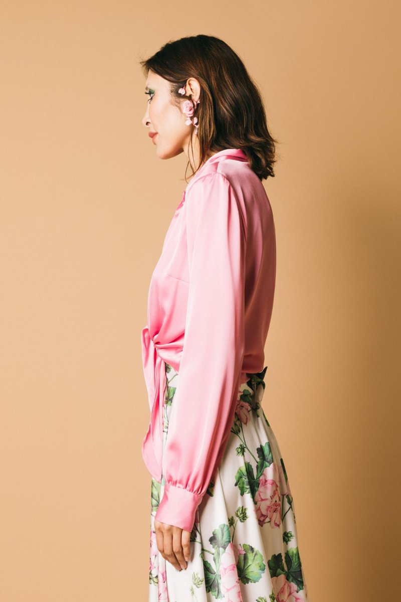 Camicia cropped in satin con nodo Altezza modella: 1.78cm Taglia indossata: 42