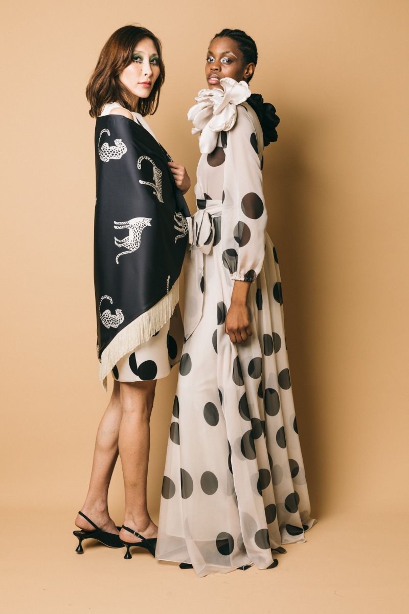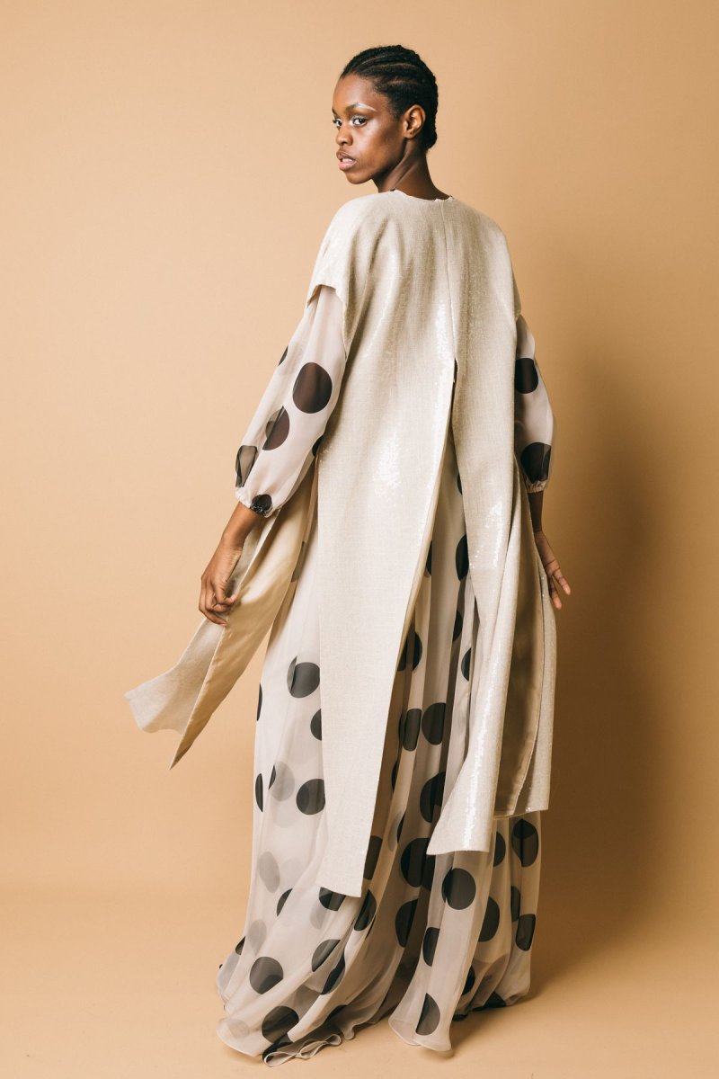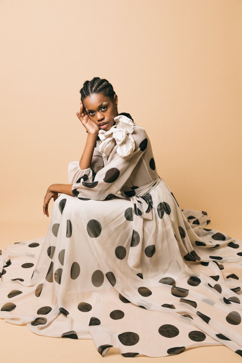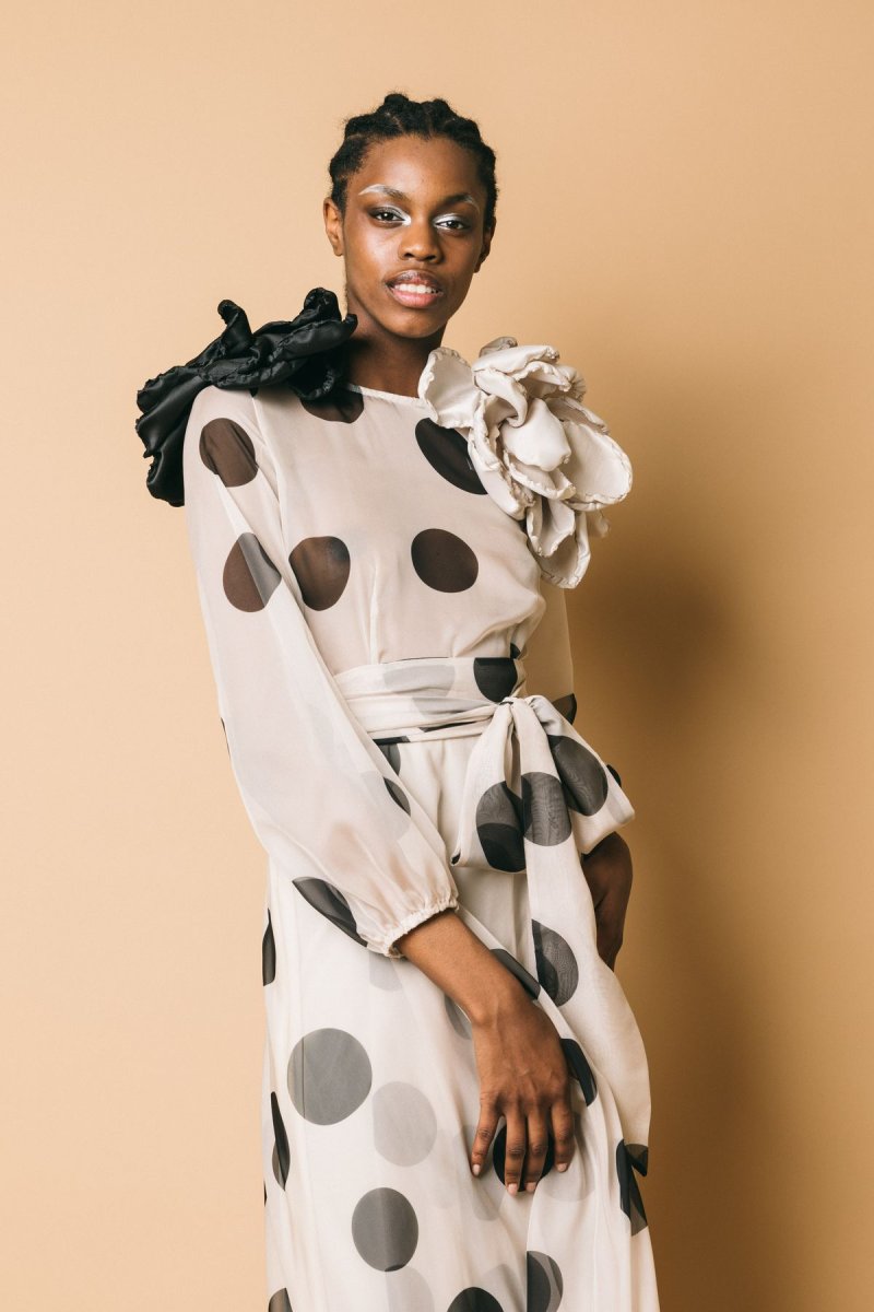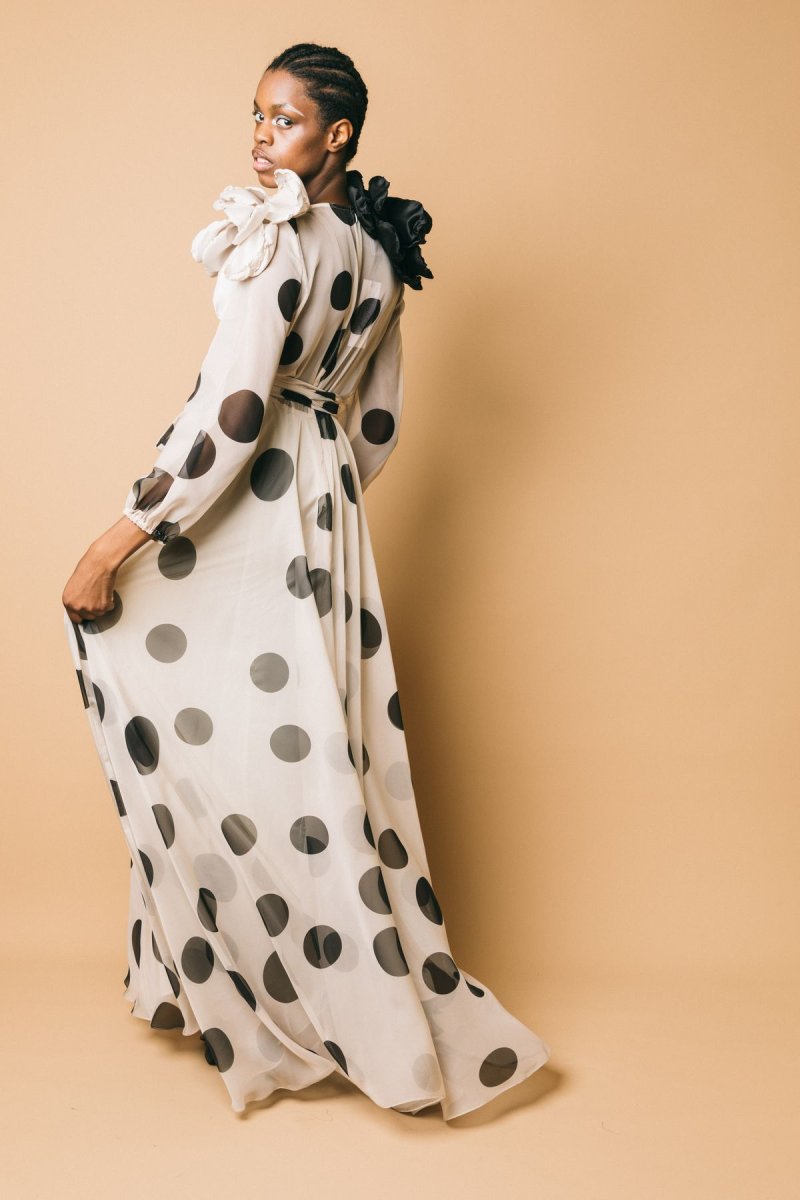 Abito lungo in chiffon, fantasia pois, dettaglio cintura da annodare in vita. Chiusura con zip invisibile, manica leggermente a palloncino con Altezza modella: 1.81cm taglia indossata: 44