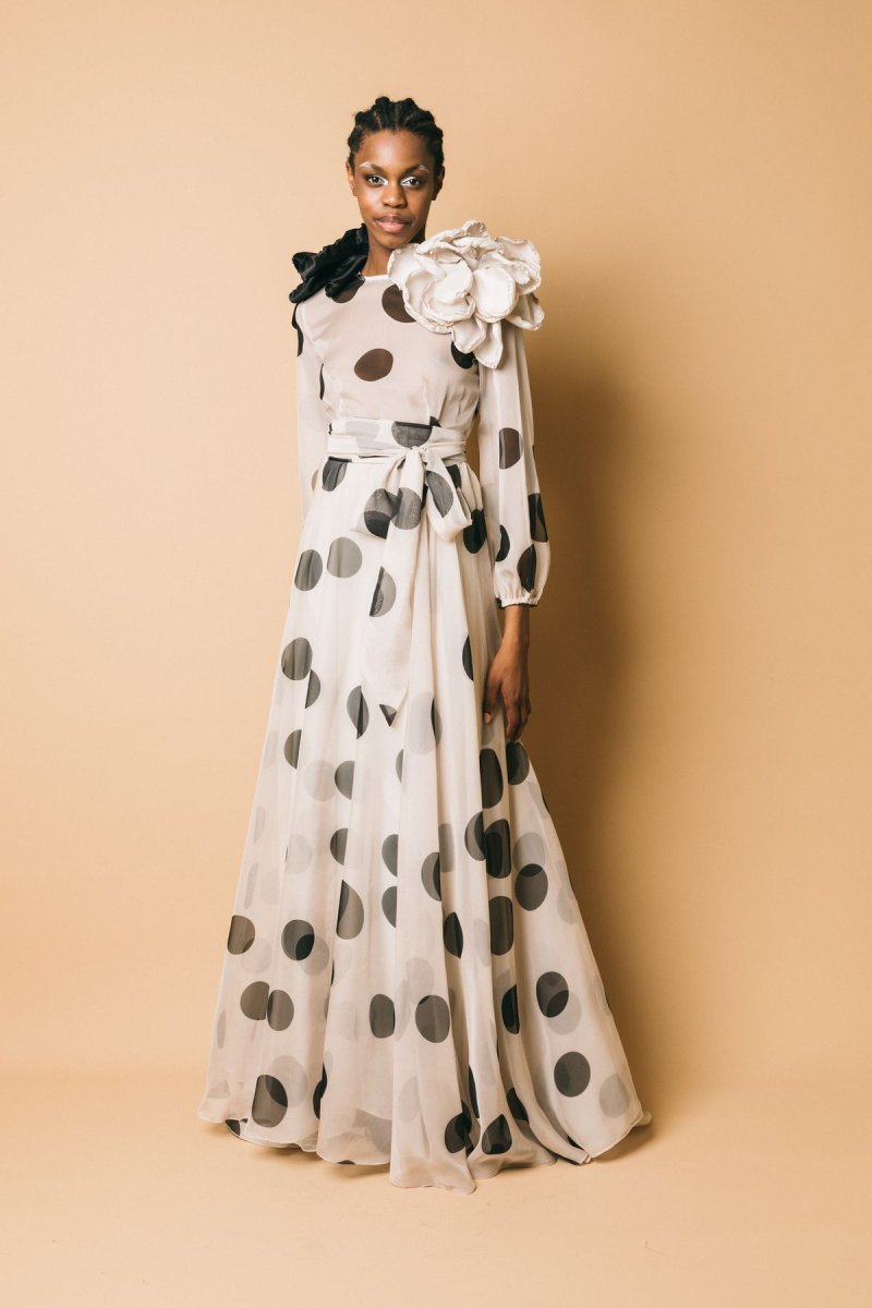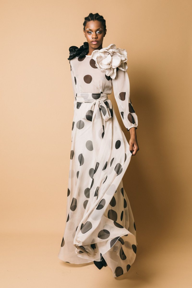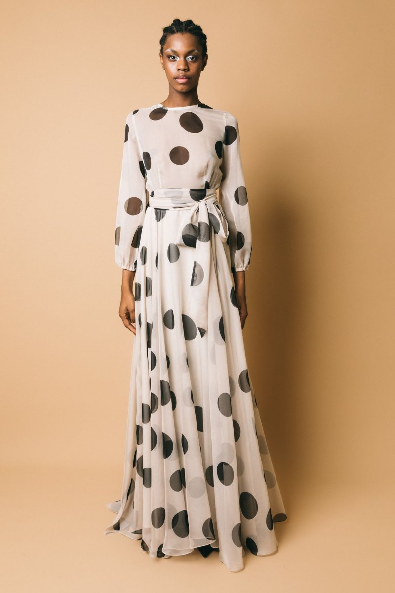 Abito lungo in chiffon, fantasia pois, dettaglio cintura da annodare in vita.