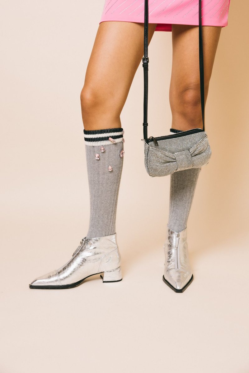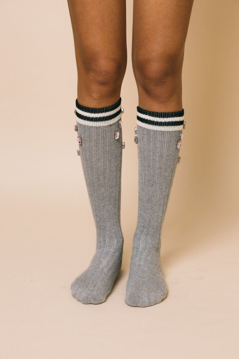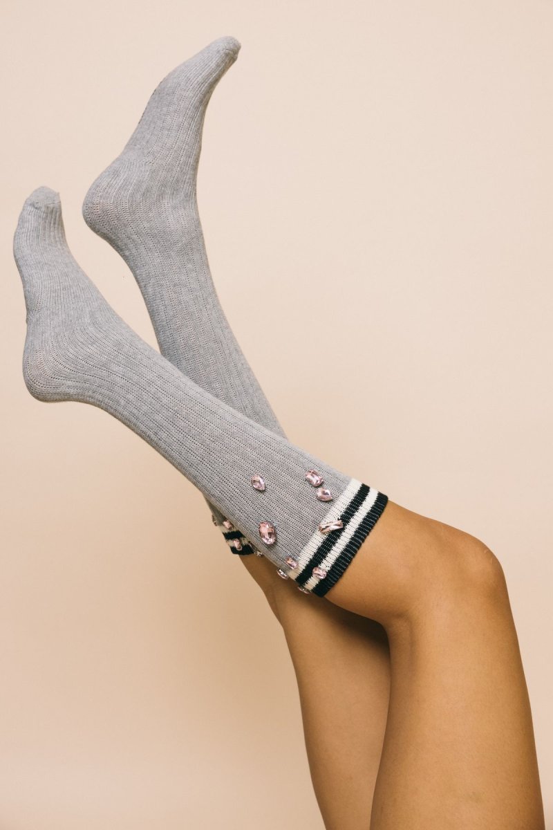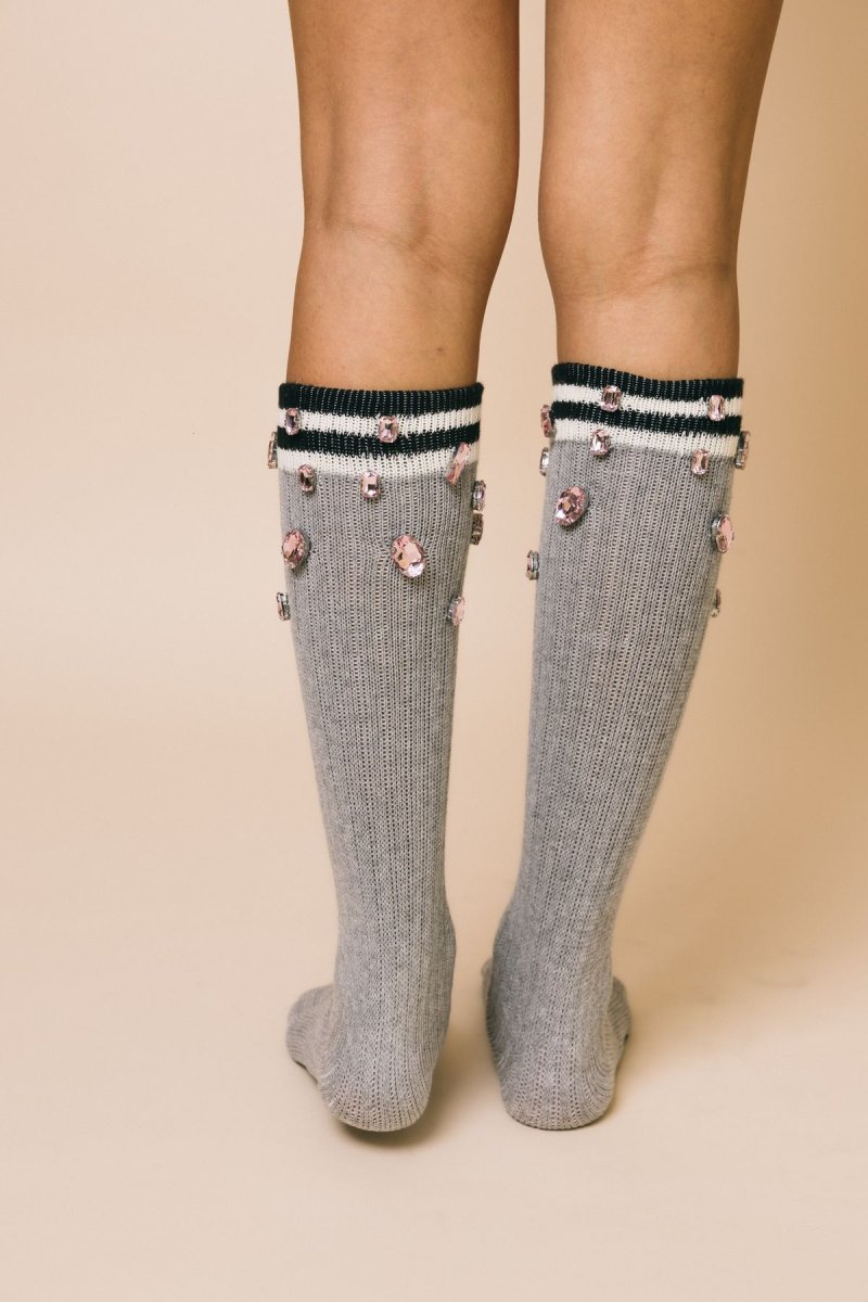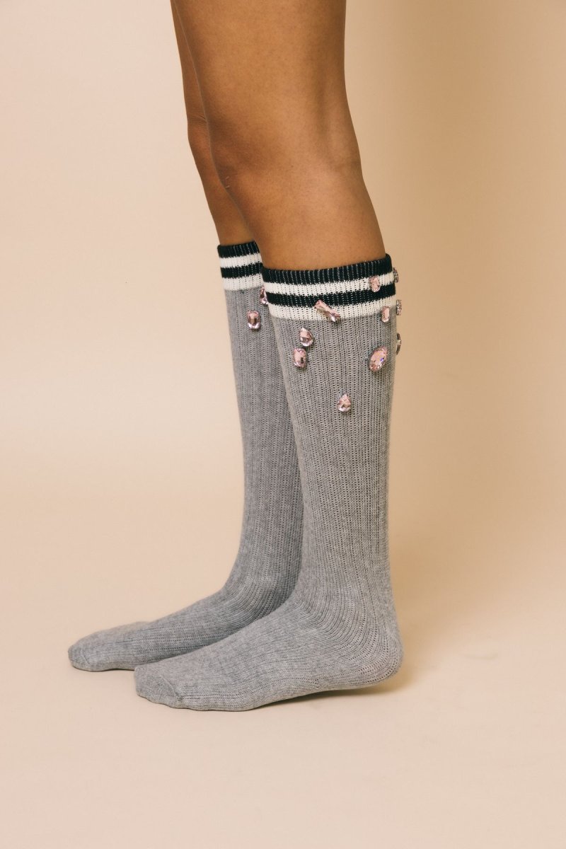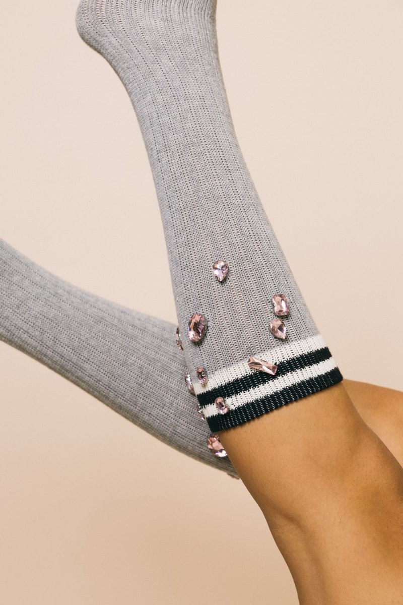 Calzini lunghi a costine grigio chiaro con maxi gemme rosa