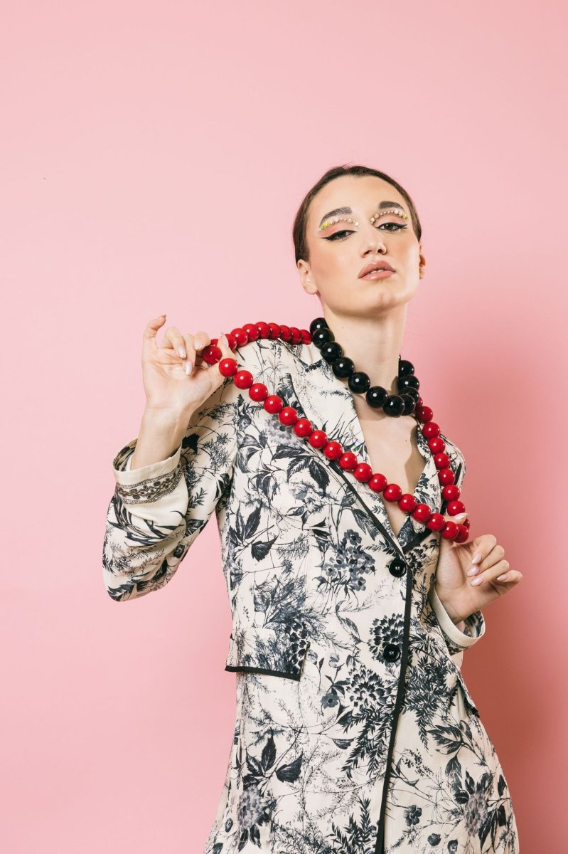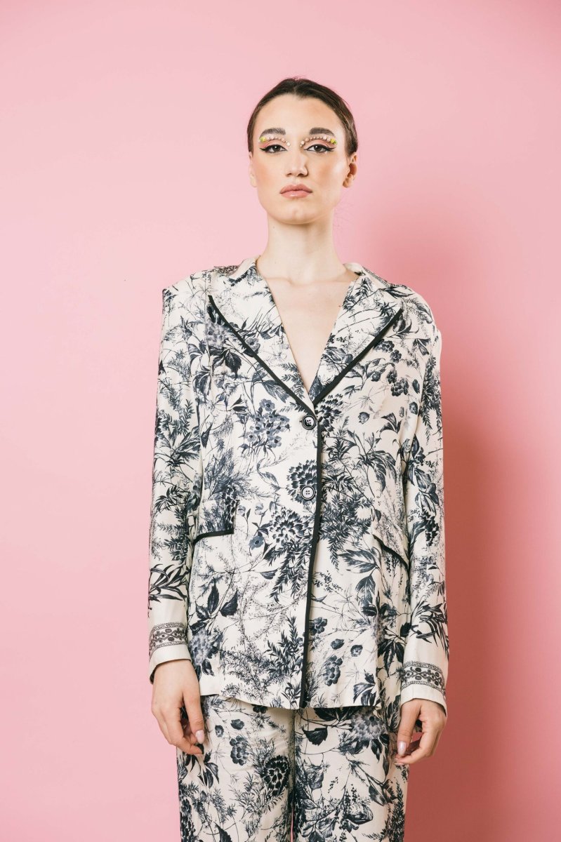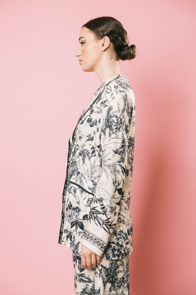 Blazer sfoderato, dal tessuto leggero e raffinato , caratterizzato da una sofisticata fantasia botanica su base naturale. Il design è impreziosito da profili in gros grain nero che definiscono con eleganza le tasche con patte e il rever. Presenta chiusura a due bottoni e spalline strutturate, che esaltano la silhouette. Un capo di estrema femminilità, eleganza e ricercatezza, che dona un tocco di stile a qualsiasi outfit.