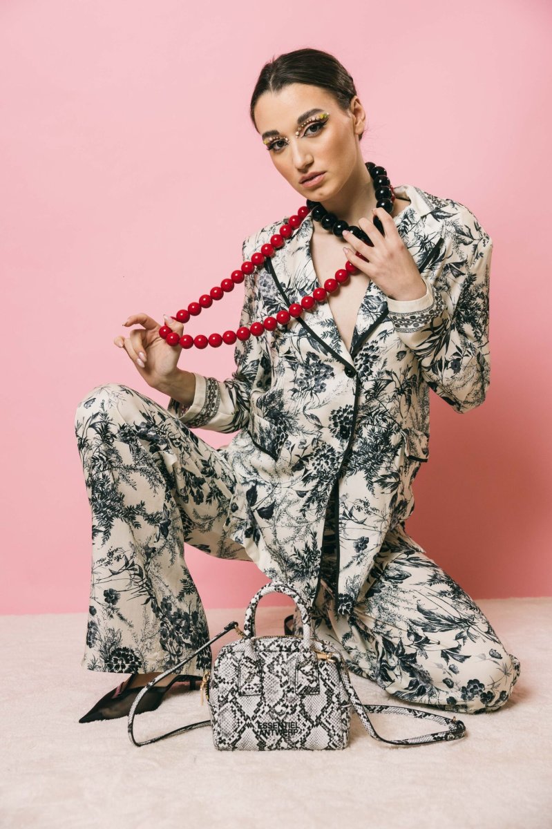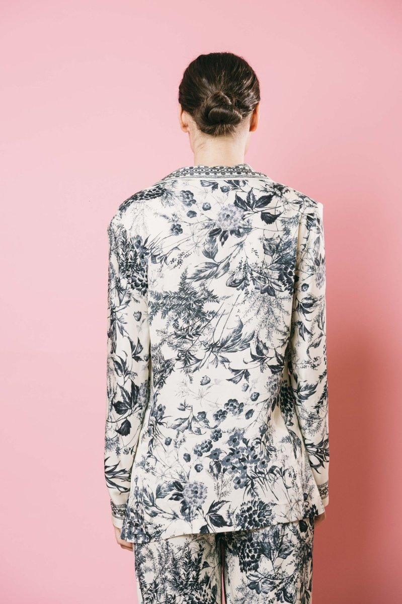 Blazer sfoderato, dal tessuto leggero e raffinato , caratterizzato da una sofisticata fantasia botanica su base naturale. Il design è impreziosito da profili in gros grain nero che definiscono con eleganza le tasche con patte e il rever. Presenta chiusura a due bottoni e spalline strutturate, che esaltano la silhouette. Un capo di estrema femminilità, eleganza e ricercatezza, che dona un tocco di stile a qualsiasi outfit. Composizione: 100% viscosa *Lavabile a secco