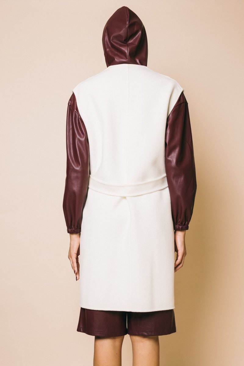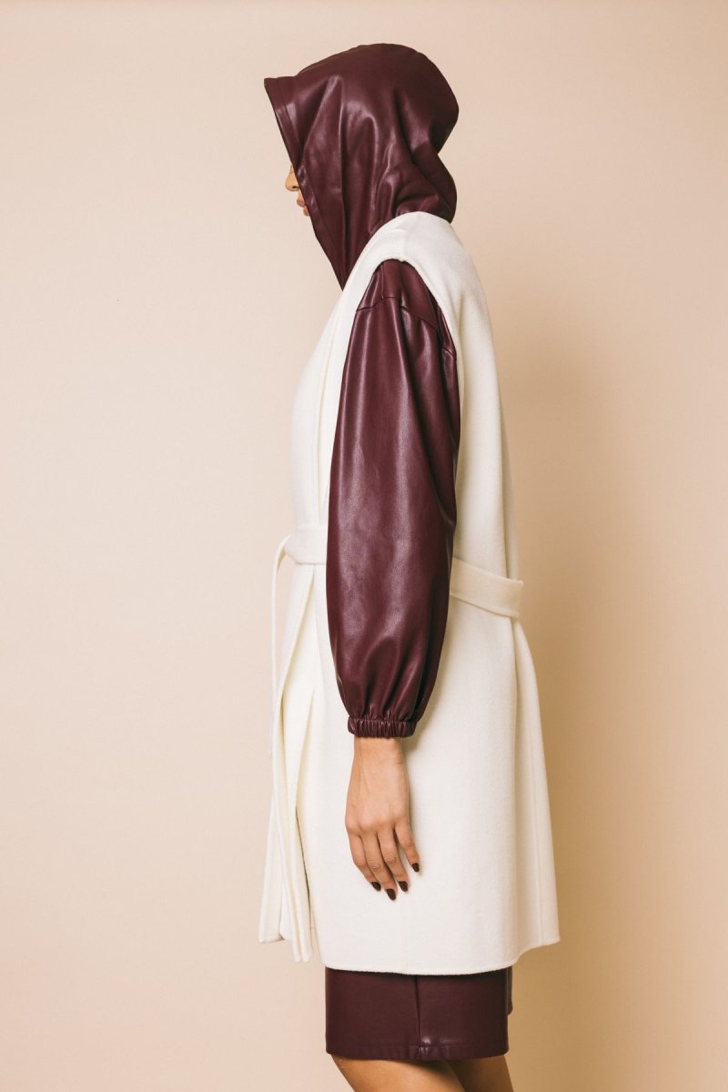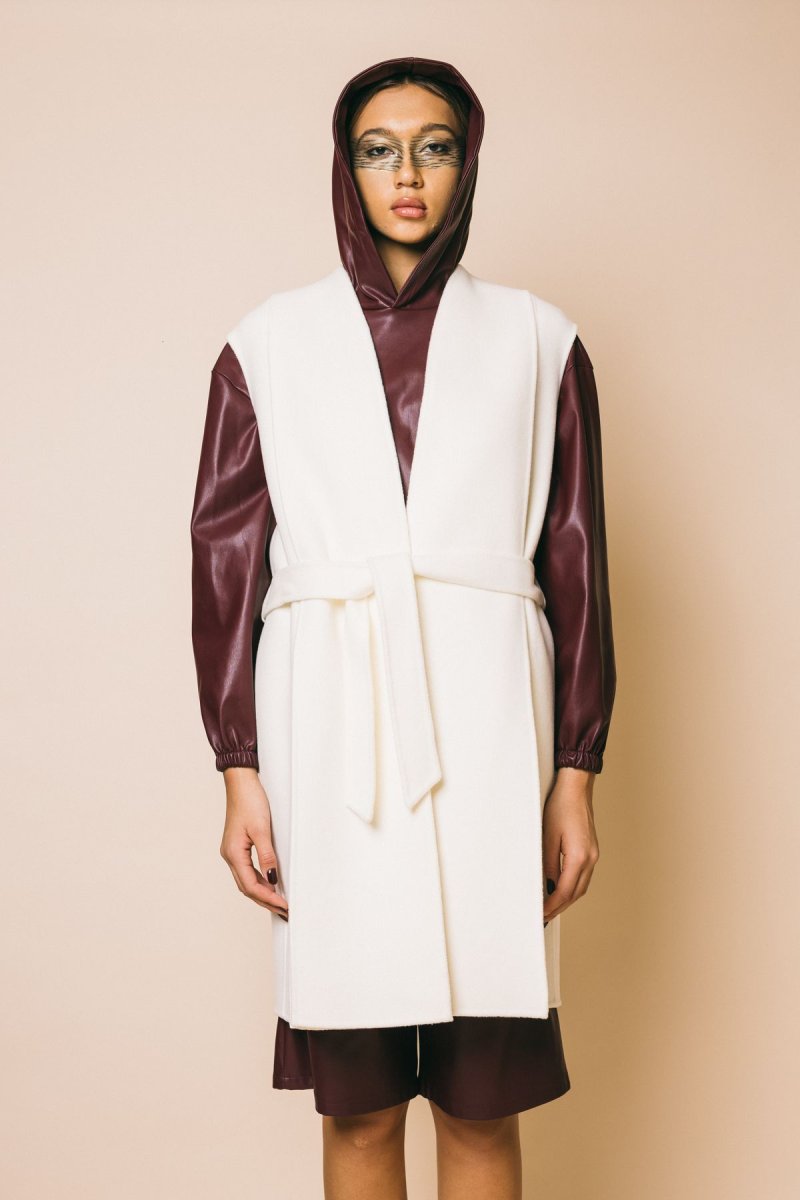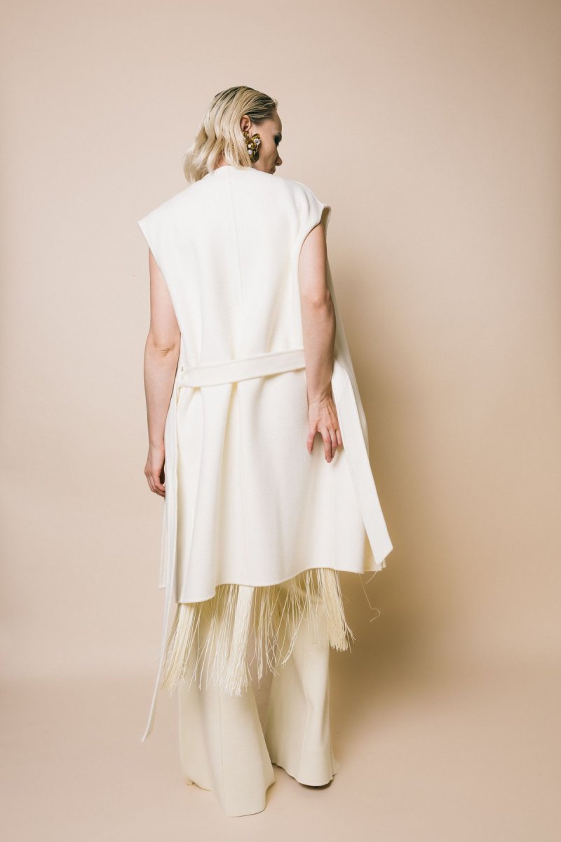 Gilet lungo in lana, cintura in vita, bavero ampio, tasche a scomparsa, aperture laterali