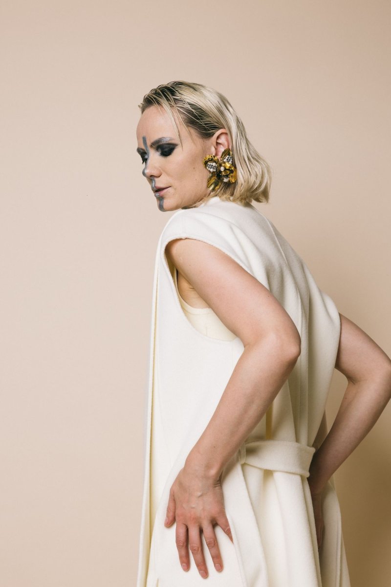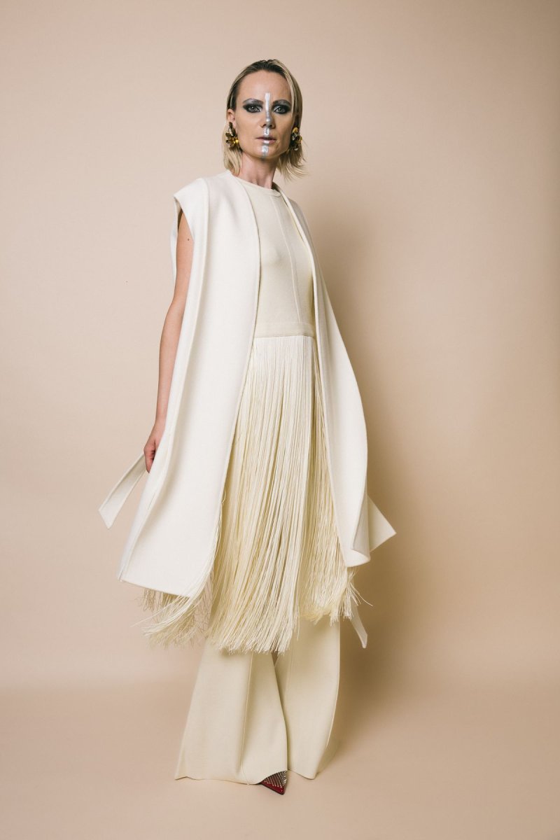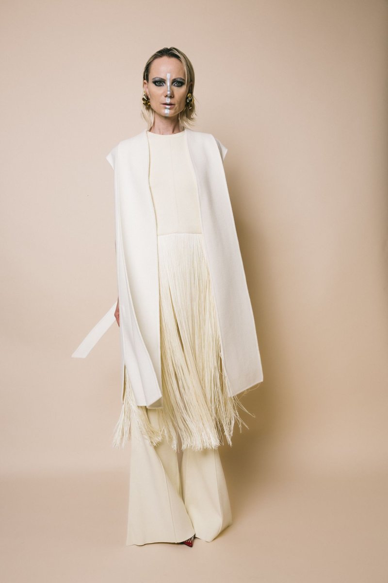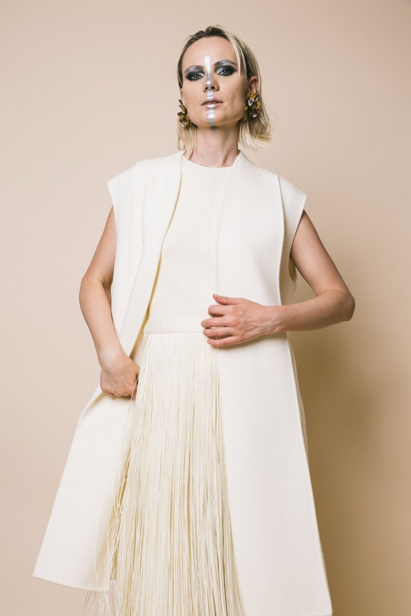 Gilet lungo in lana, cintura in vita, bavero ampio, tasche a scomparsa, aperture laterali