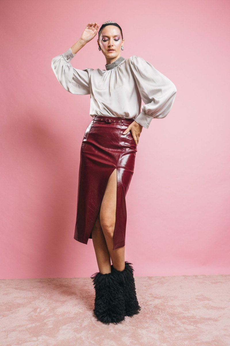 Gonna tubino modello matita in pelle vegana lucida, dal taglio avvitato che valorizza la silhouette. Dotata di cintura in vita per un fit modulabile, presenta uno spacco frontale – laterale che conferisce movimento e slancio. La chiusura laterale con zip invisibile mantiene l’estetica pulita ed elegante, rendendo questo capo un must di femminilità e stile contemporaneo.