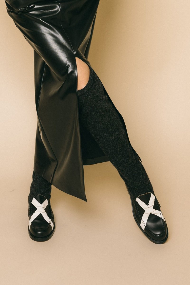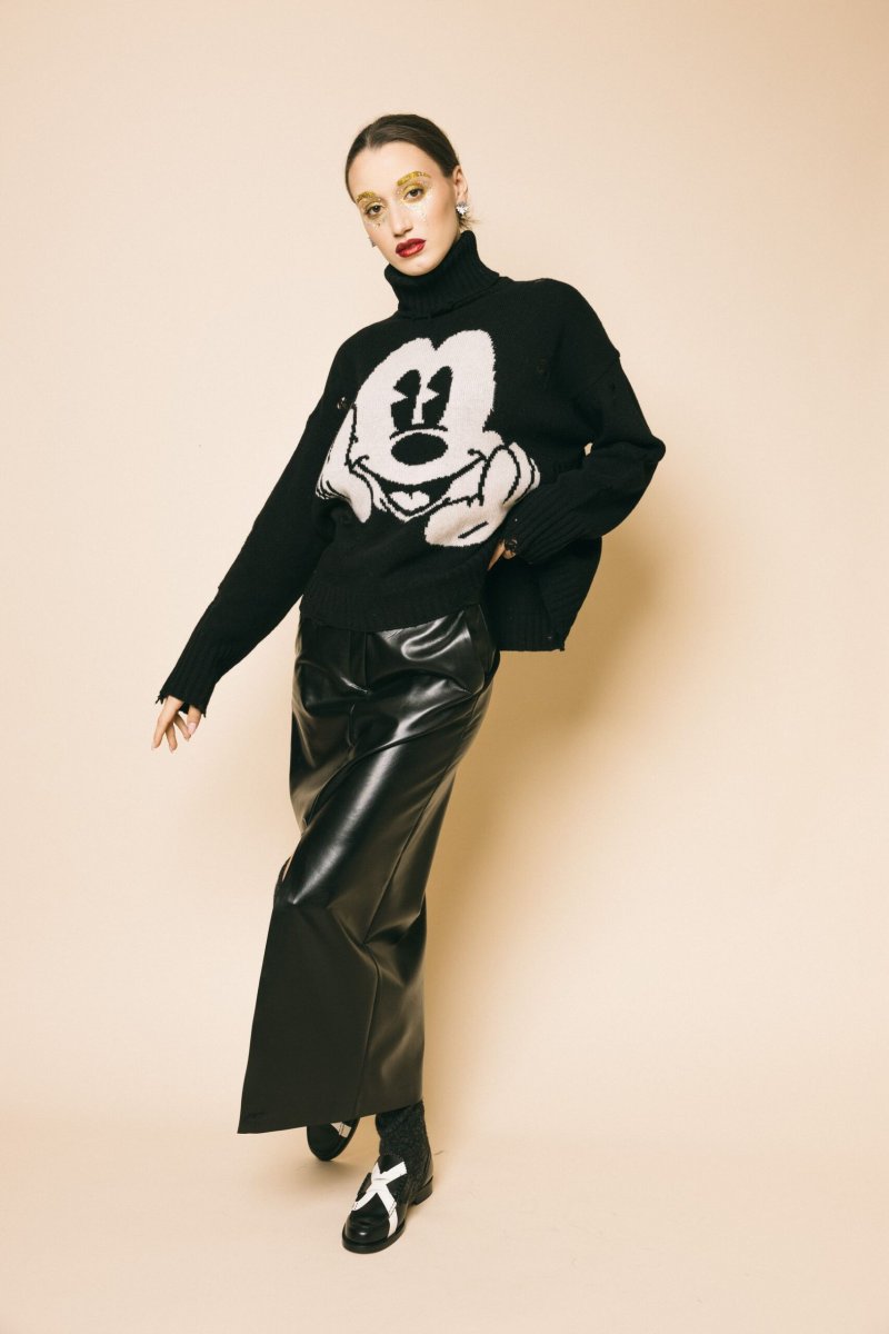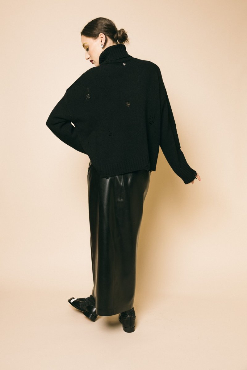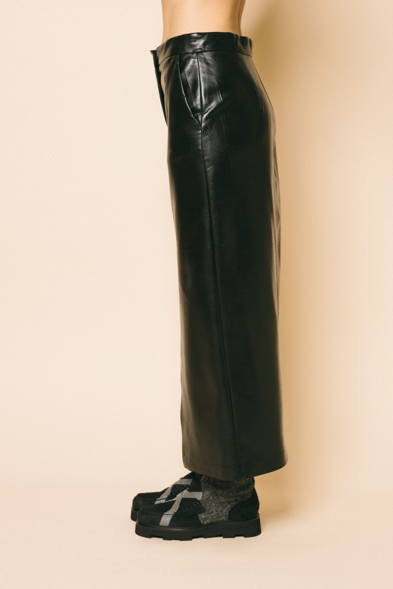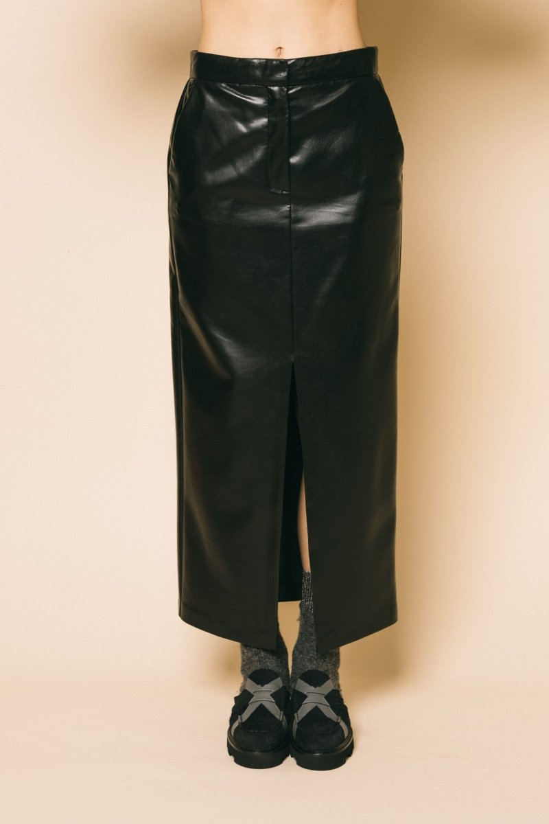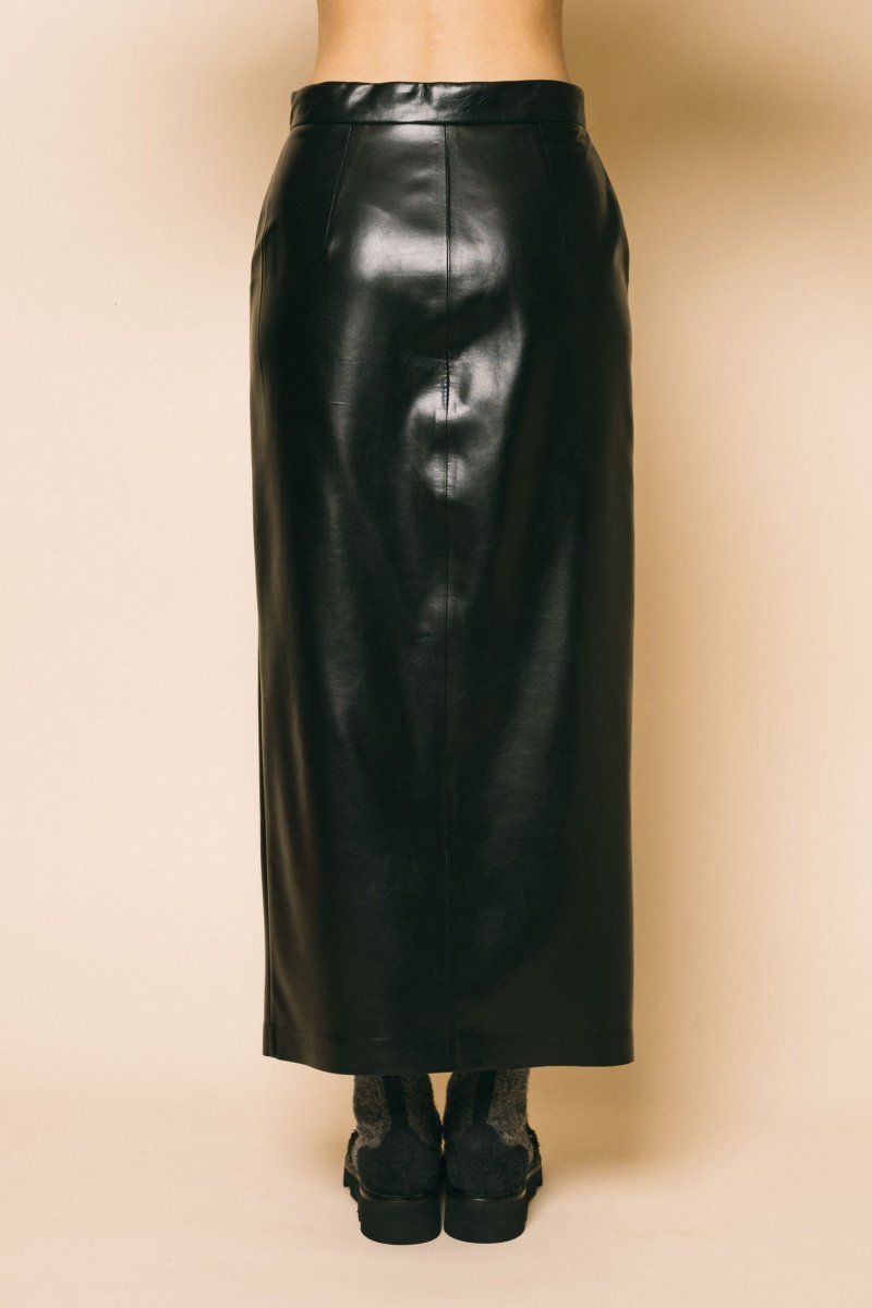 Gonna longuette in ecopelle estremamente morbida, dettaglio apertura centrale