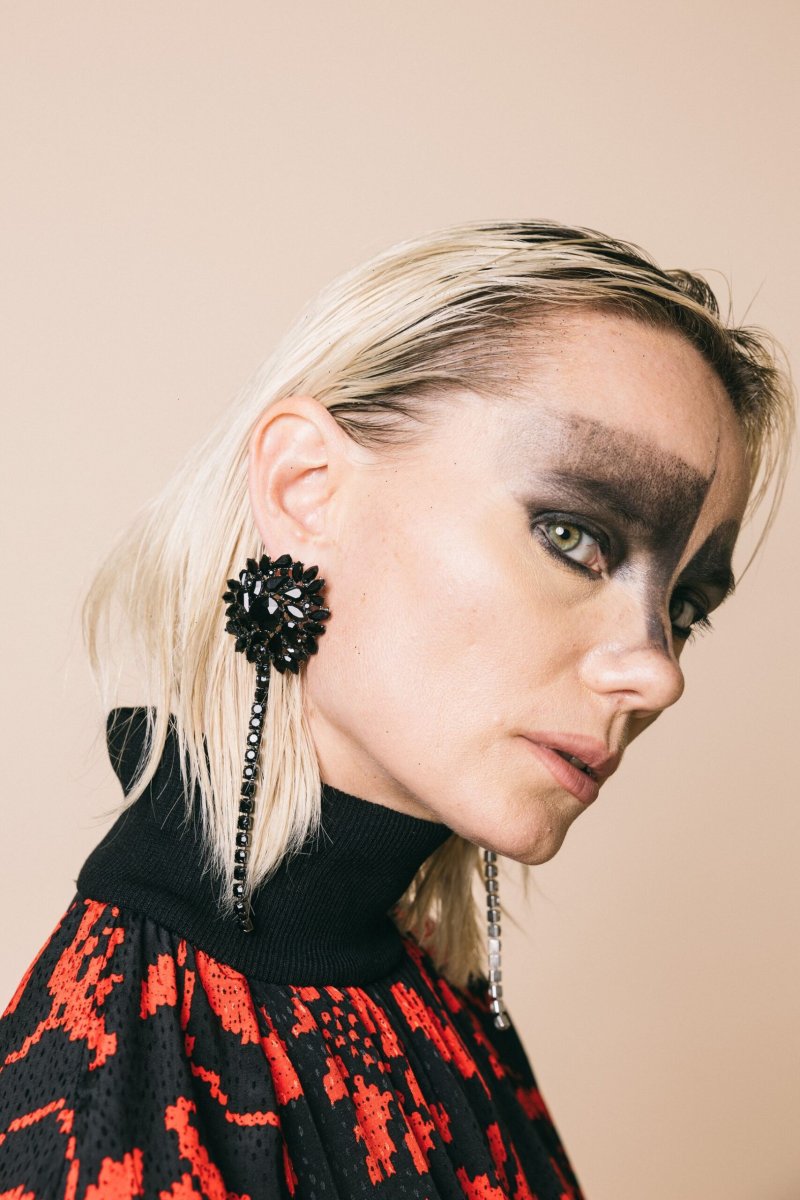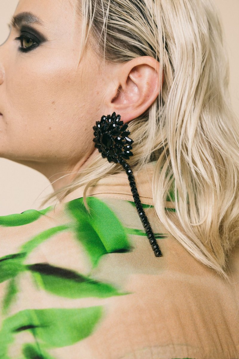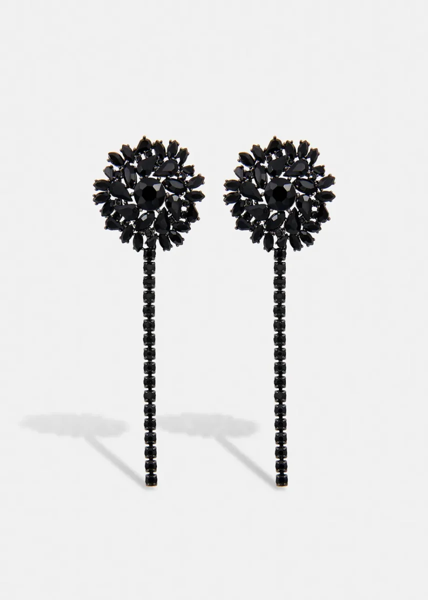 Orecchini lunghi con strass color argento realizzati a forma di fiore alla base, questi orecchini sono caratterizzati da una fila di strass che ondeggia appena sopra le spalle