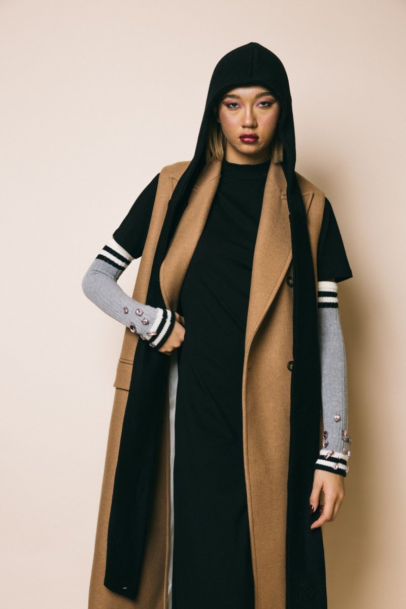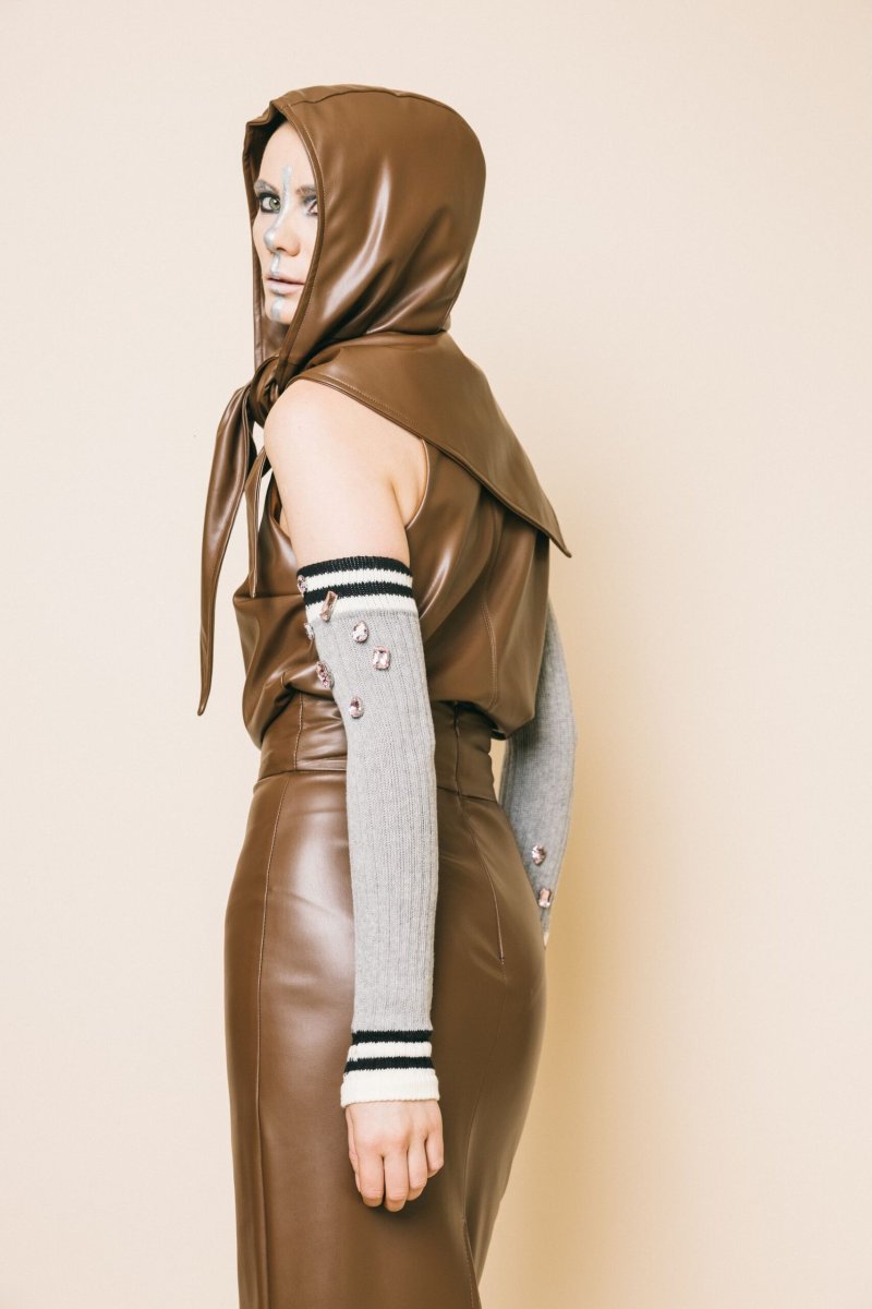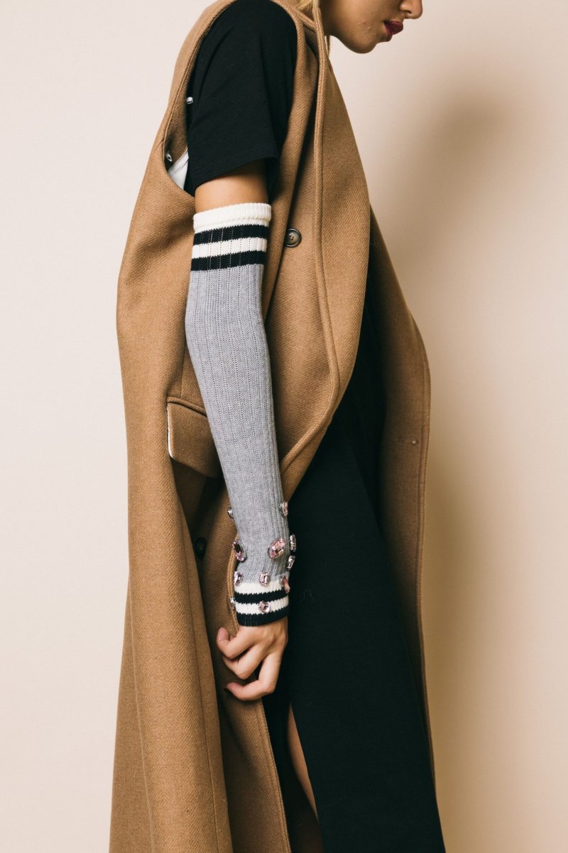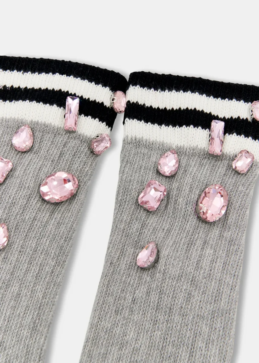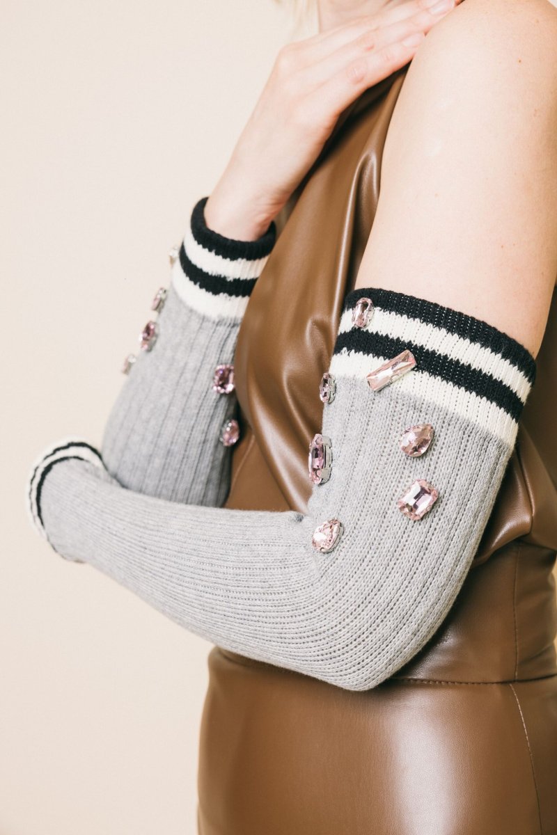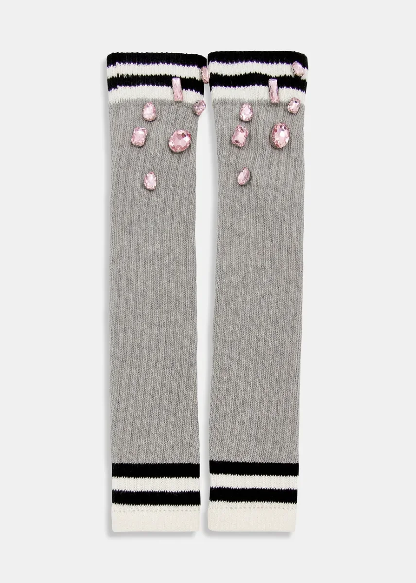 Manicotti in cotone elastico a costine grigio chiaro con maxi gemme strass rosa. un accessorio perfetto per essere sovrapposto su leggins, jeans e sotto le giacca.