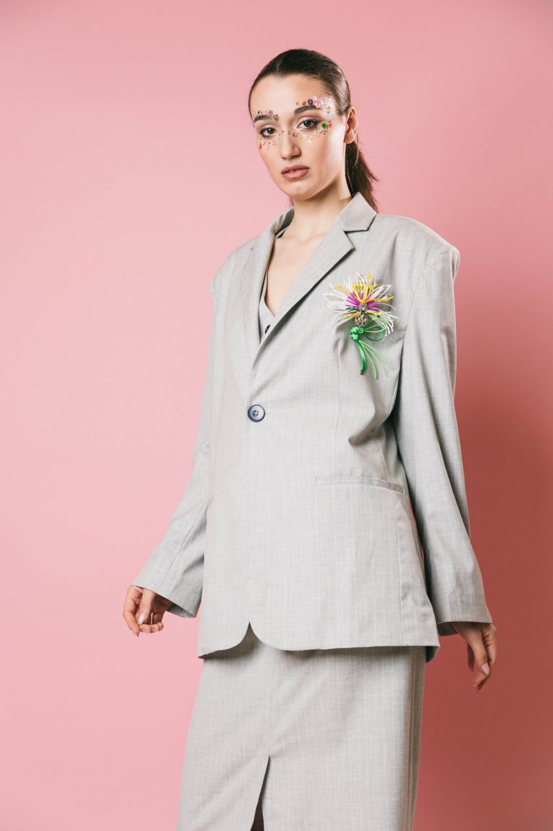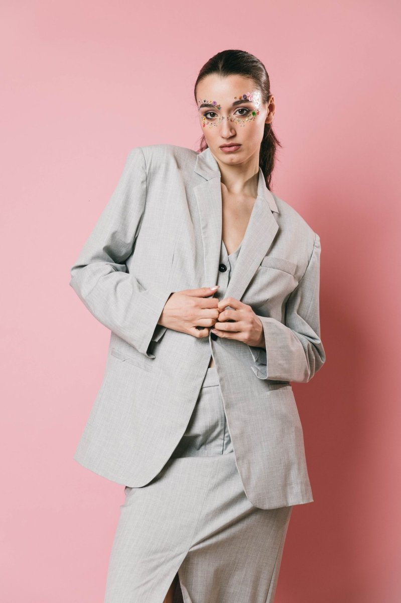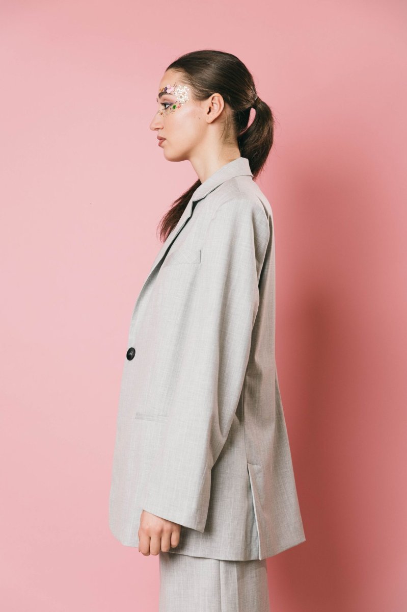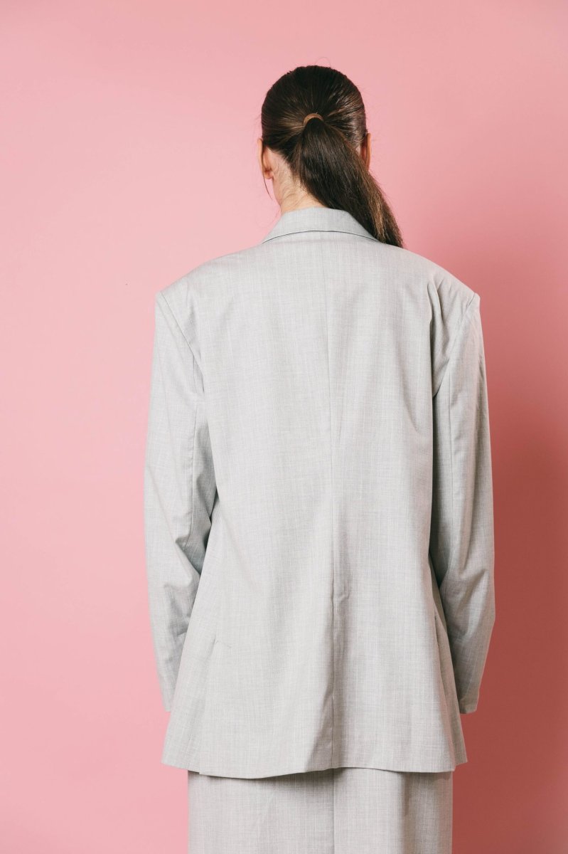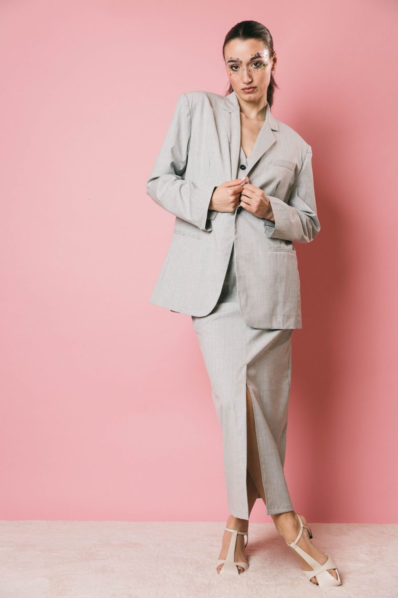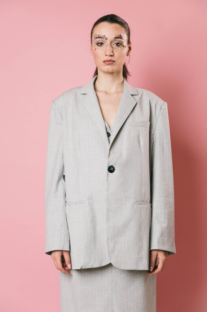 Blazer over in tessuto gessato grigio/bianco, un capo sofisticato e versatile. Caratterizzato da doppi bottoni, di cui uno decorativo, e spacchetti sul retro, questa giacca è perfetta per essere indossata in vari contesti, aggiungendo eleganza e stile a qualsiasi outfit. un must have per chi cerca raffinatezza e praticità in un solo capo.