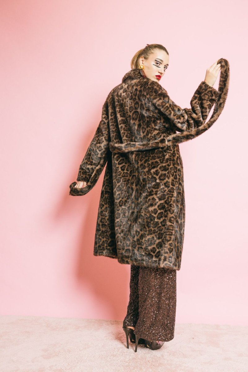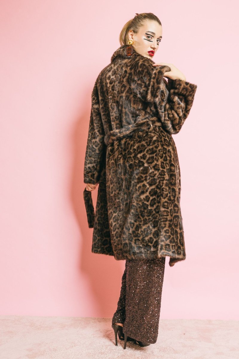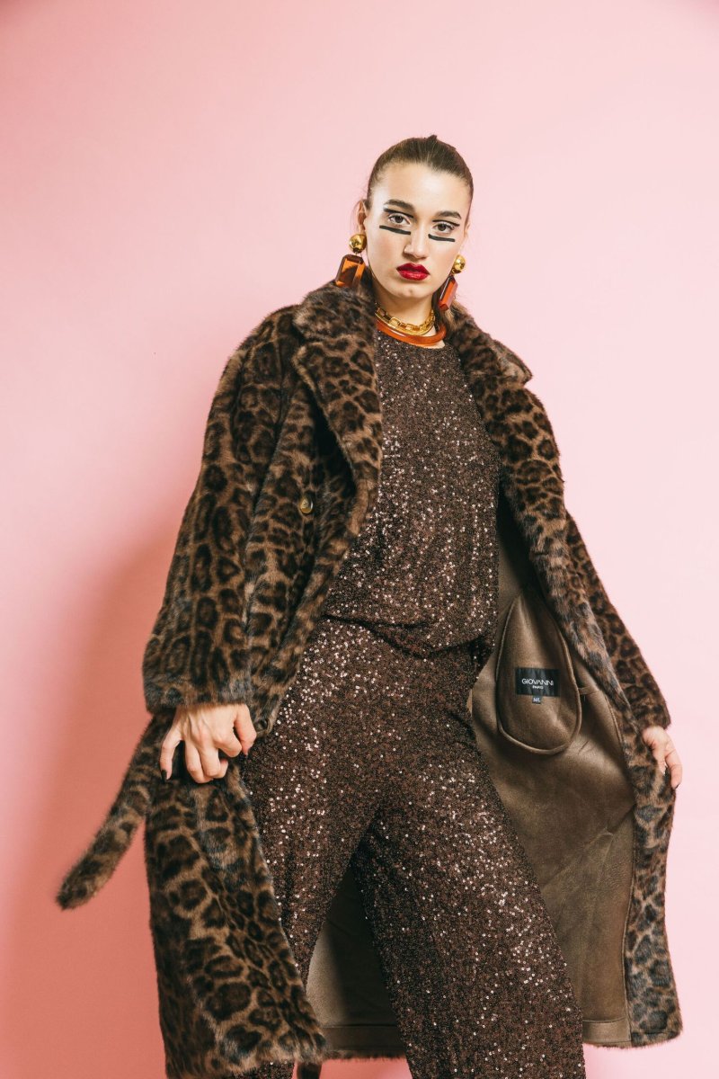 Cappotto in eco-pelliccia animalier dal taglio elegante e sartoriale. La linea strutturata, valorizzata dalla cintura coordinata, avvolge delicatamente la silhouette conferendo un’allure sofisticata e audace. Chiusura con bottoni, due tasche laterali e dettagli curati completano il design, unendo stile e funzionalità. Vestibilità aderente pensata per armonizzare comfort e raffinatezza.