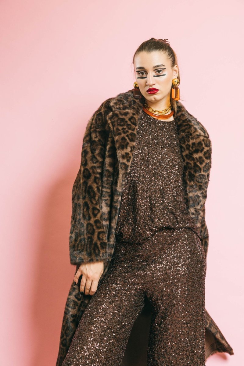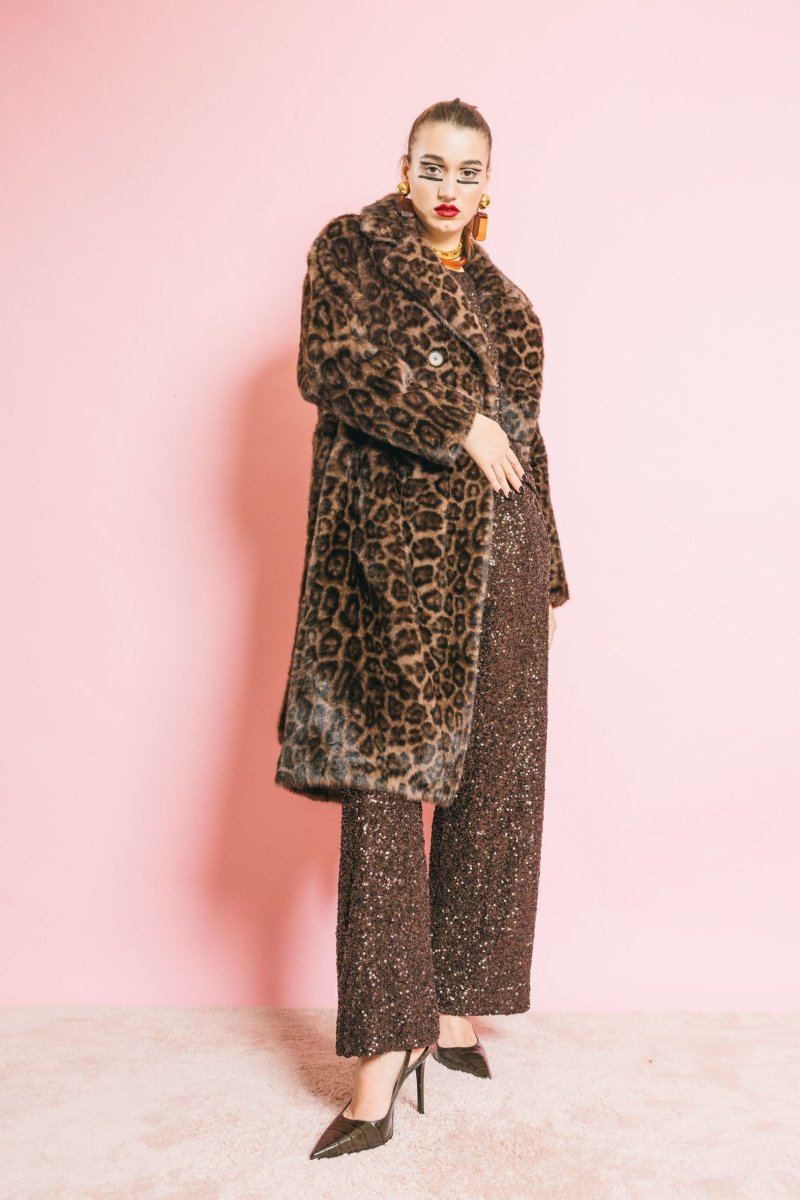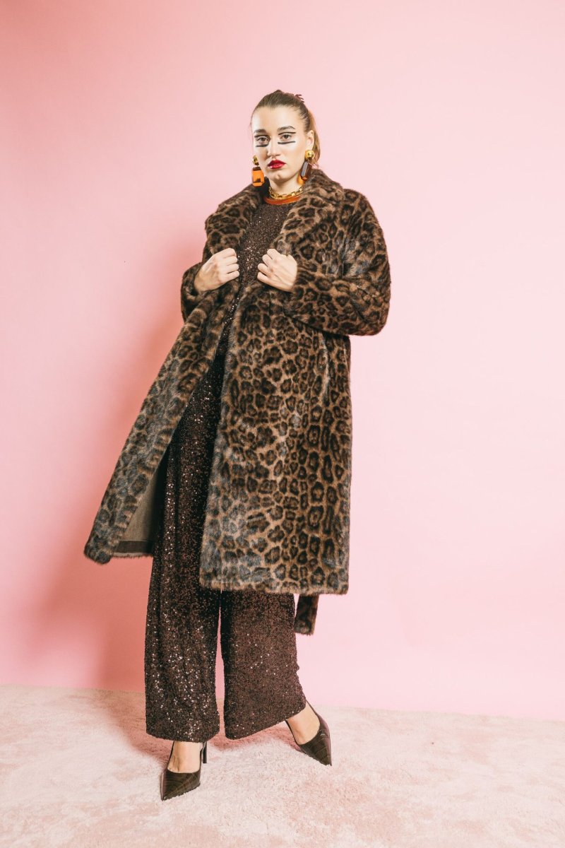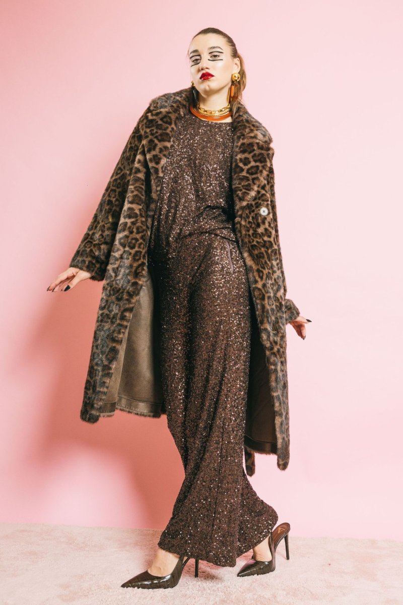 Cappotto in eco-pelliccia animalier dal taglio elegante e sartoriale. La linea strutturata, valorizzata dalla cintura coordinata, avvolge delicatamente la silhouette conferendo un’allure sofisticata e audace. Chiusura con bottoni, due tasche laterali e dettagli curati completano il design, unendo stile e funzionalità. Vestibilità aderente pensata per armonizzare comfort e raffinatezza.