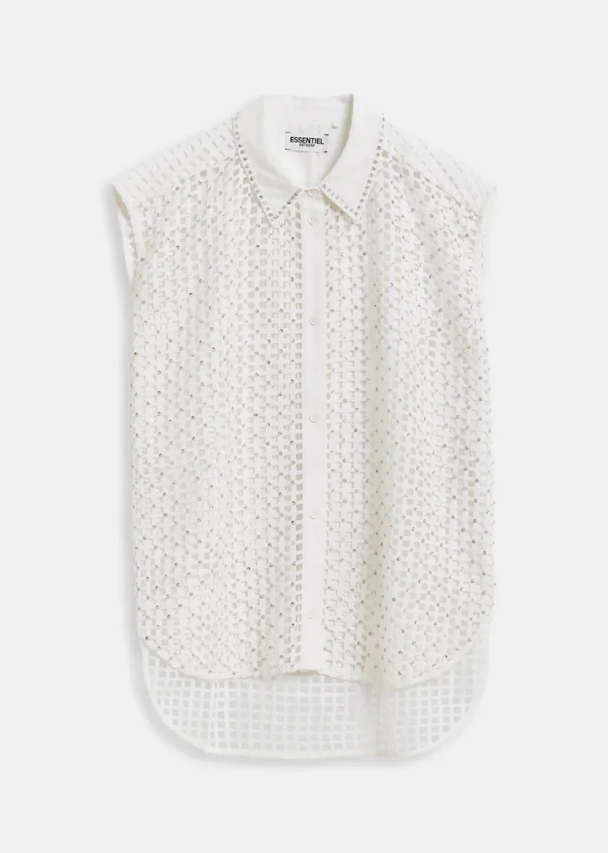 Camicia senza maniche dalla vestibilità rilassata, realizzata in tessuto di medio spessore con un raffinato motivo effetto rete. Impreziosita da decorazioni di perline che aggiungono struttura e profondità, presenta una chiusura frontale con bottoni e un orlo arrotondato più lungo sul retro, per un’eleganza dinamica e sofisticata.