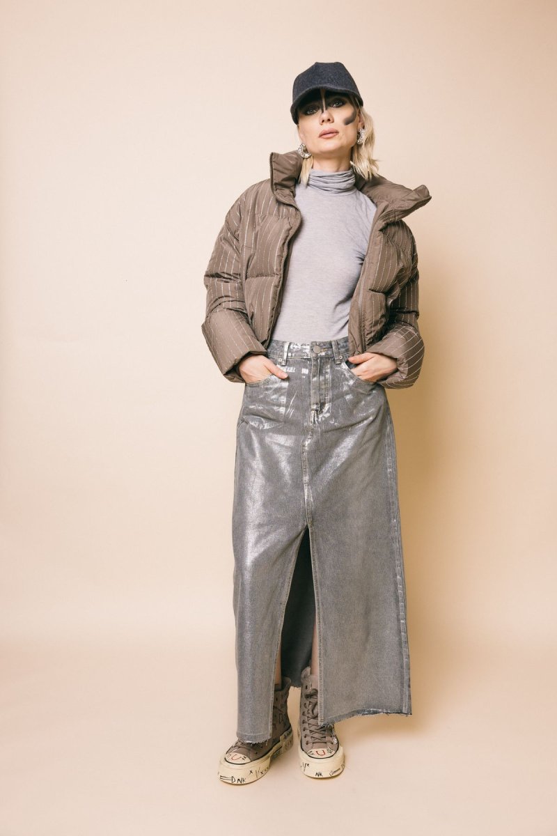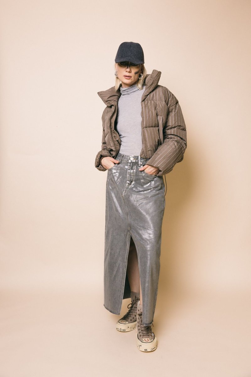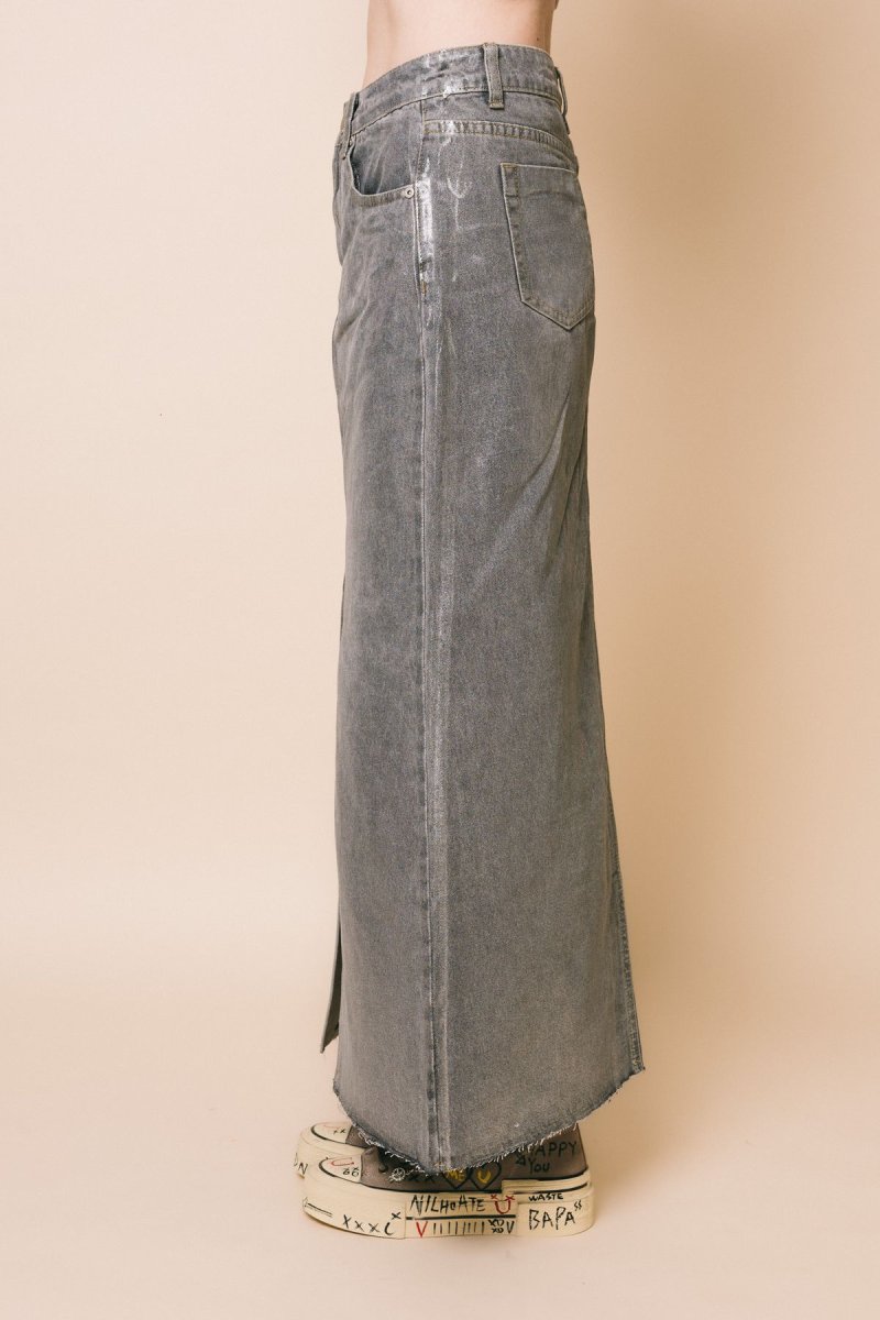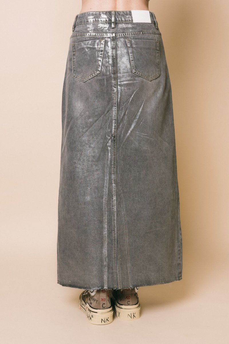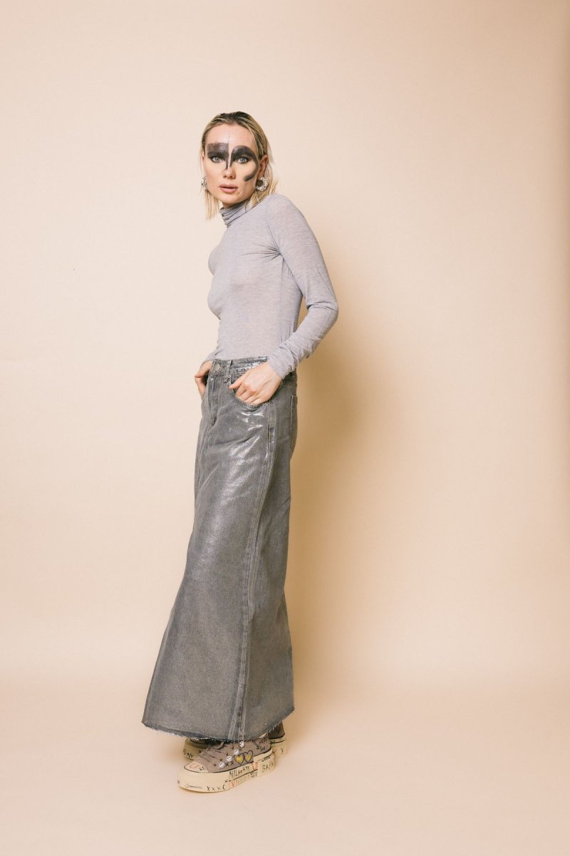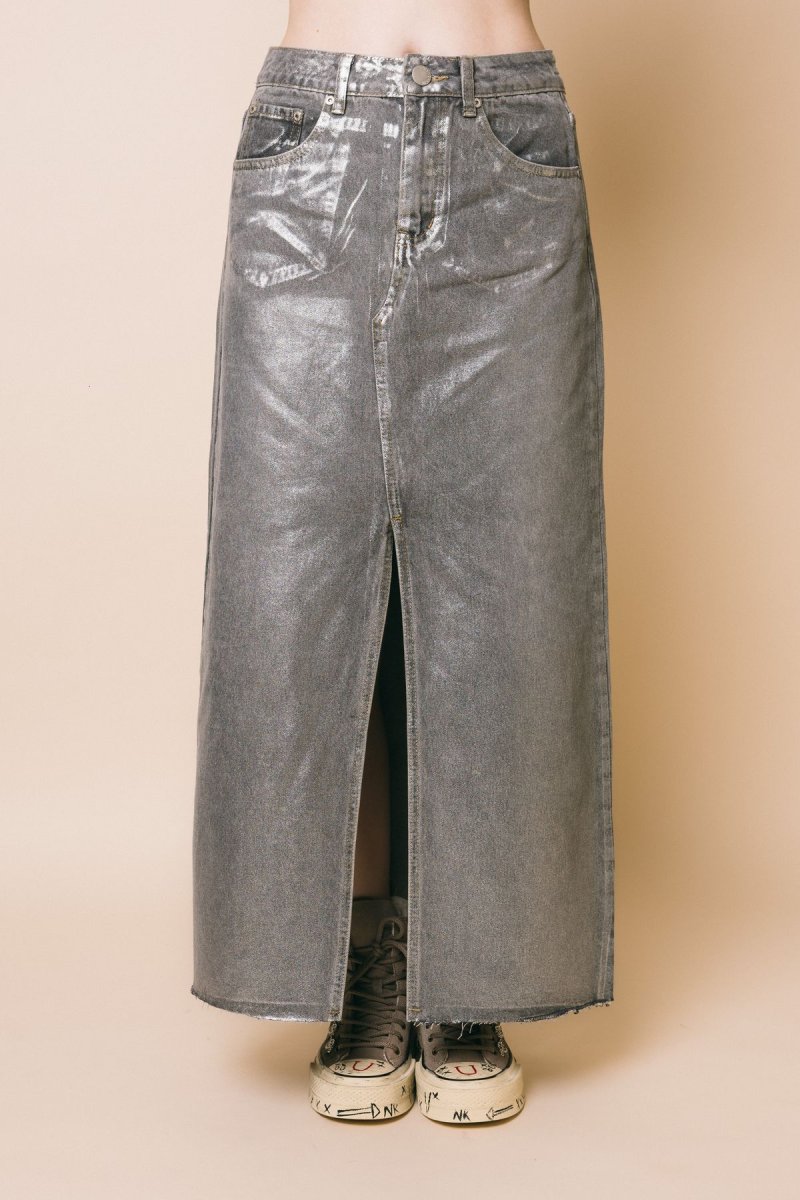 Gonna lunga con spacco anteriore, tessuto spalmato silver lurex