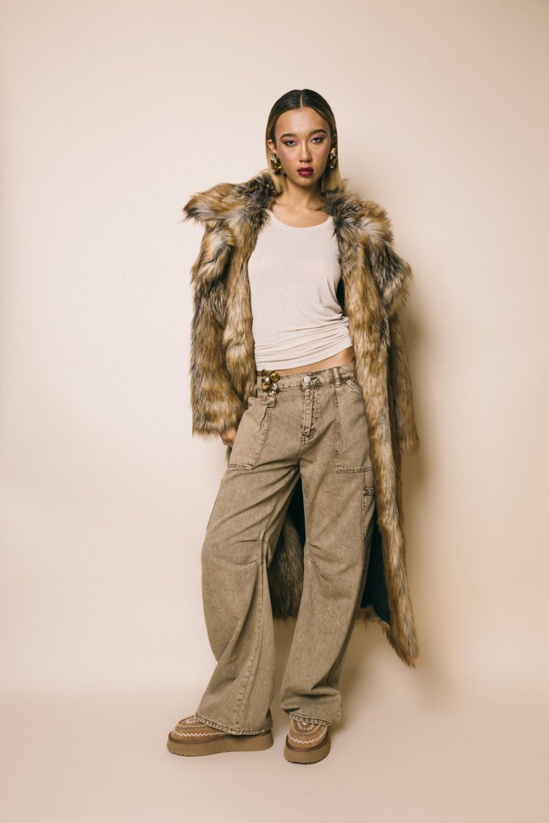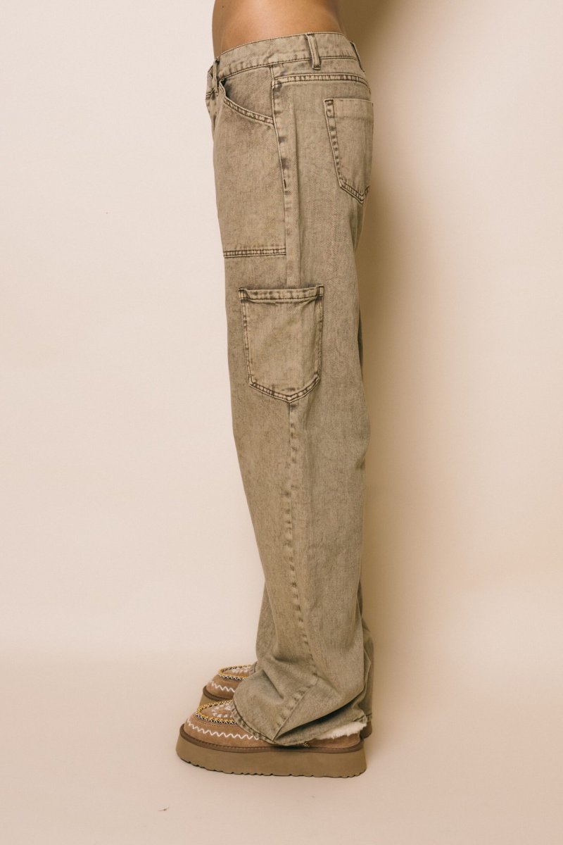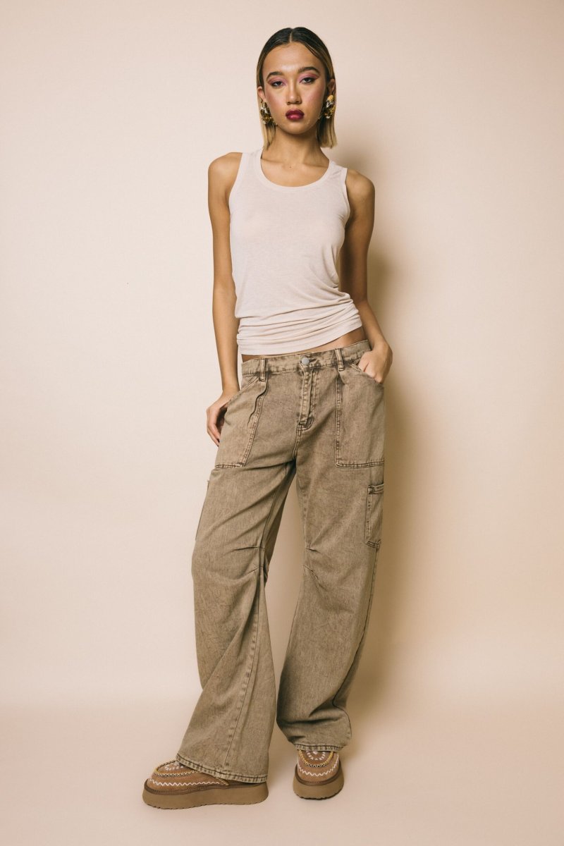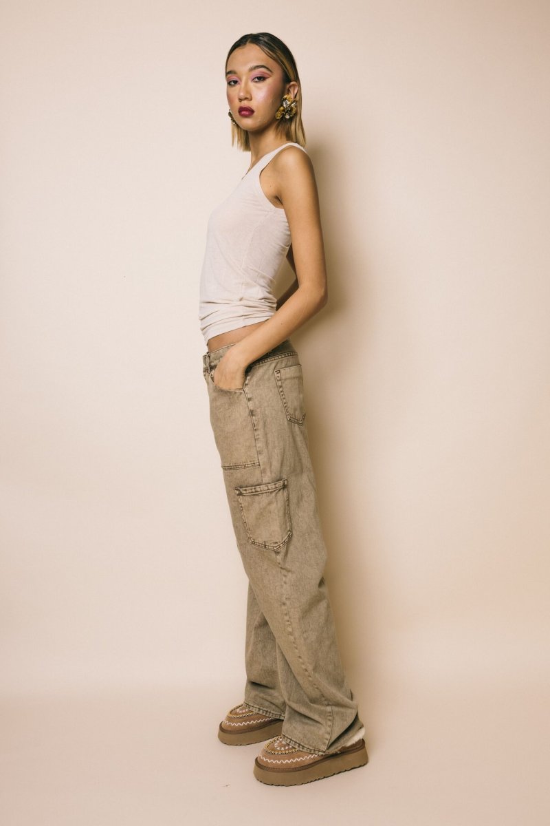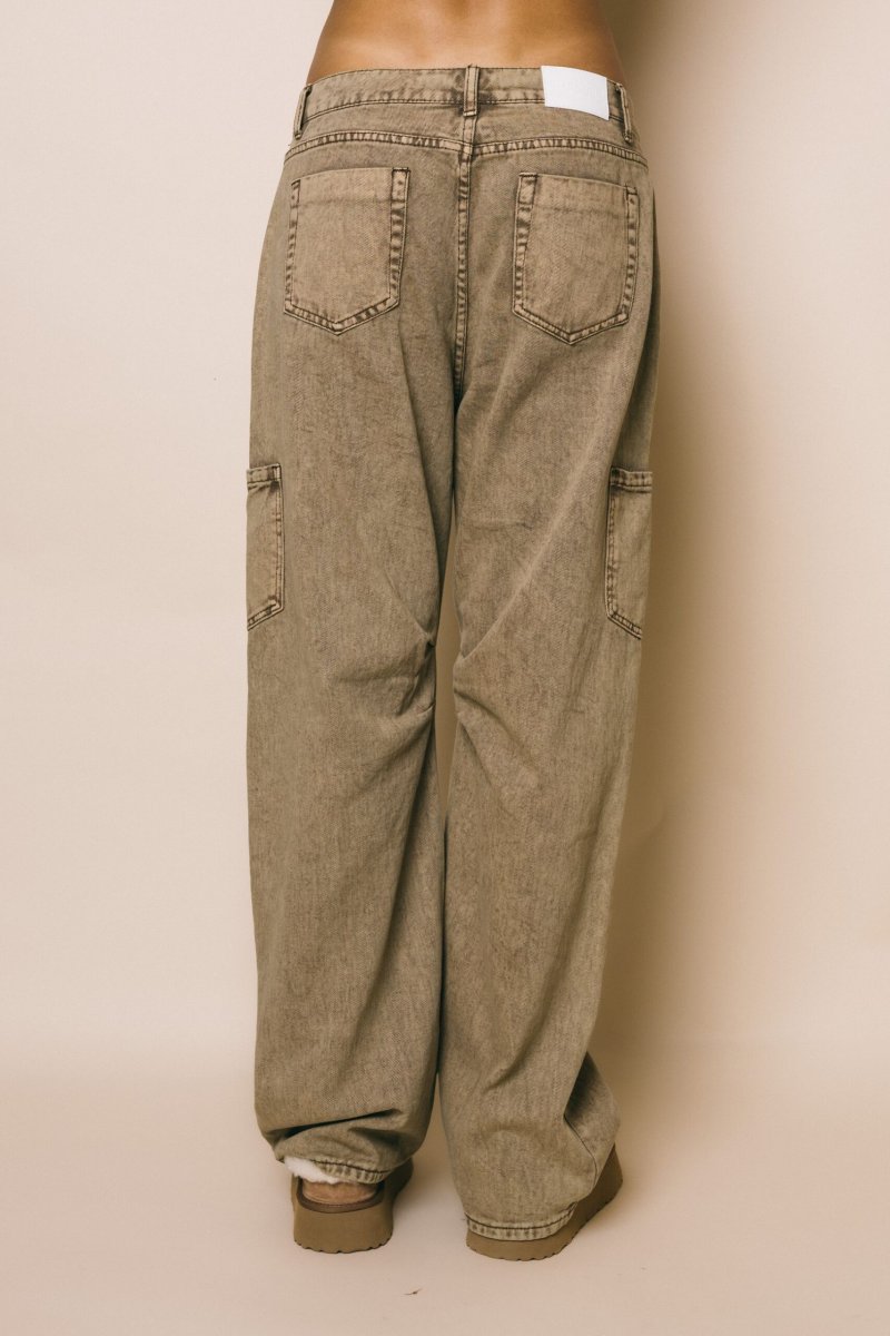 Jeans in tela elasticizzata colore tan wash, dettaglio tasche laterali e arricciatura interno ginocchio