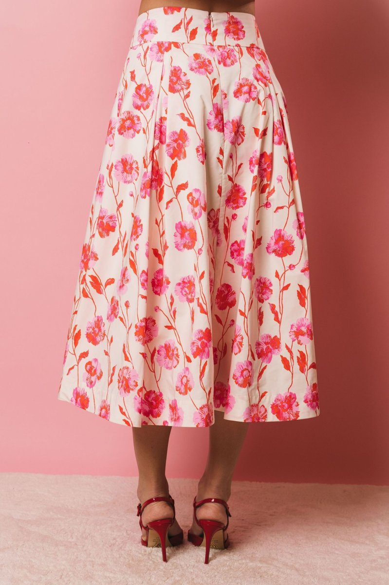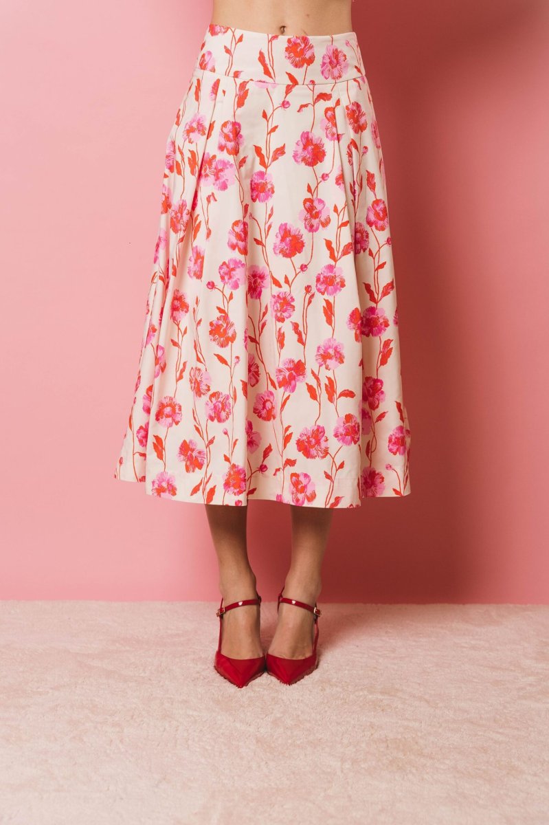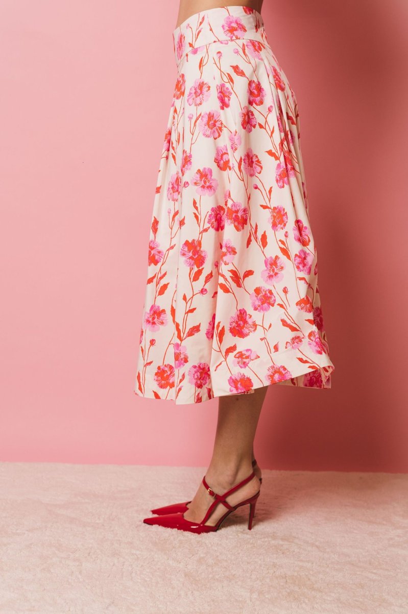 Gonna midi a pieghe fondo latte, stampa floreale rosso e rosa. Progettata con una cintura aderente, questa gonna midi cade in una voluminosa forma a trapezio accentuata dai dettagli a pieghe a scatola. È realizzata in un lucido tessuto misto poliestere riciclato e può essere indossata per qualsiasi occasione, da formale a casual.