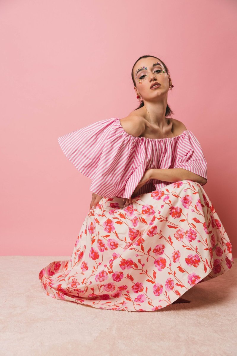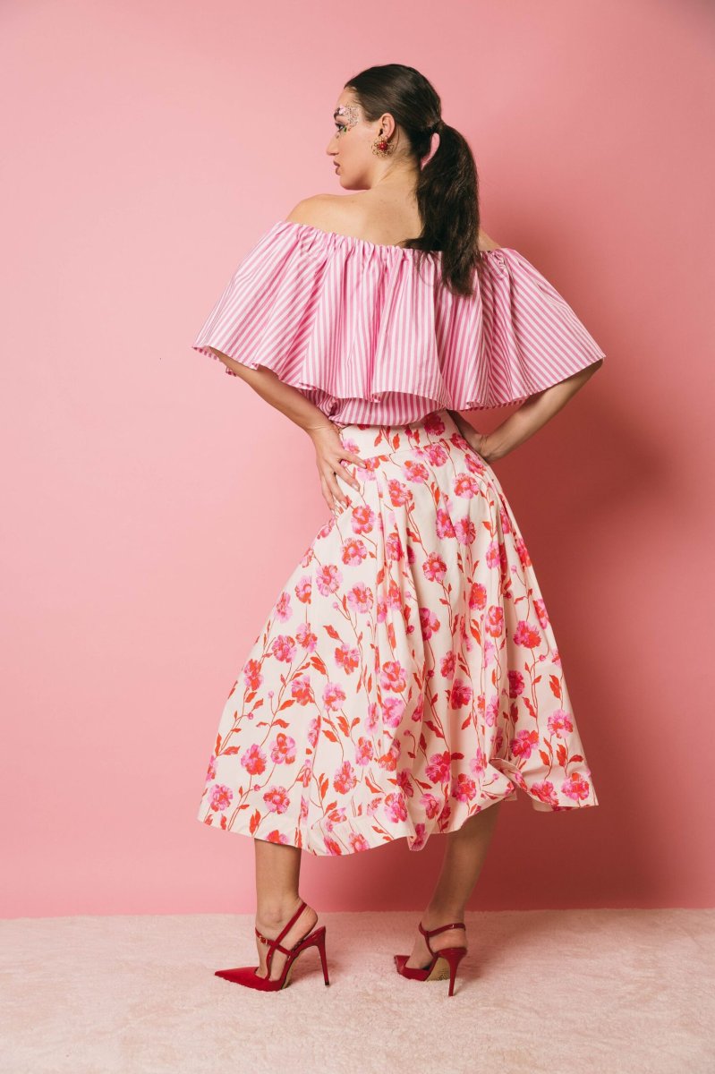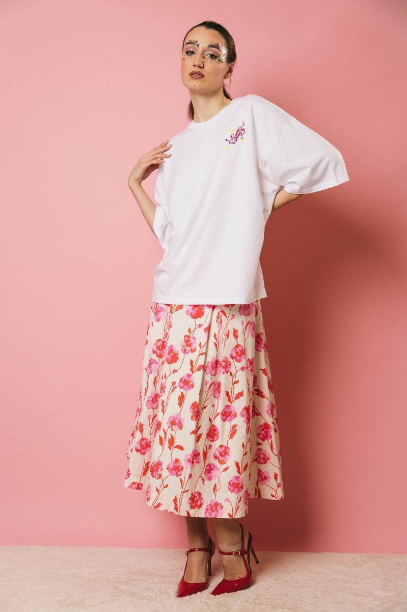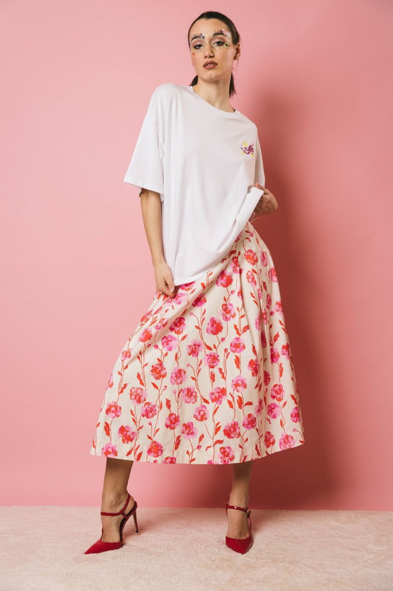 Gonna midi a pieghe fondo latte, stampa floreale rosso e rosa. Progettata con una cintura aderente, questa gonna midi cade in una voluminosa forma a trapezio accentuata dai dettagli a pieghe a scatola. È realizzata in un lucido tessuto misto poliestere riciclato e può essere indossata per qualsiasi occasione, da formale a casual.