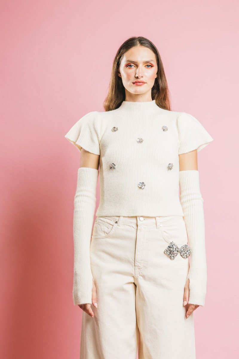 Una t-shirt in puro in cotone, dal taglio squadrato e rilassato, maniche corte e un girocollo pulito, impreziosito da decorazioni oversize in stile perla metallizzata argento per un tocco tanto femminile quanto ricercato. Una zip nascosta sul retro aggiunge una finitura raffinata. Indossala infilata in pantaloni dal taglio sartoriale o lascia che valorizzi il tuo paio di denim preferiti.