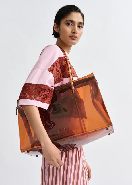 Distinguiti con stile grazie a questa borsa tote trasparente e dai colori vivaci. Realizzata in robusto tessuto trasparente, presenta accenti di colori vivaci, manici, cuciture tono su tono e dettagli metallici coordinati per un look elegante e coeso. La chiusura con zip mantiene al sicuro i tuoi oggetti essenziali, mentre la pochette con zip inclusa aggiunge ulteriore spazio e una finitura raffinata, lasciando emergere il tuo stile personale.
