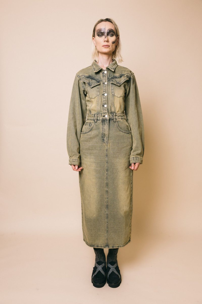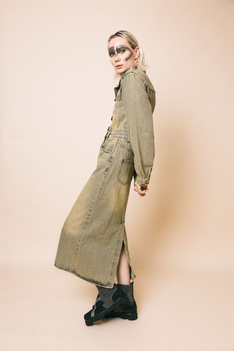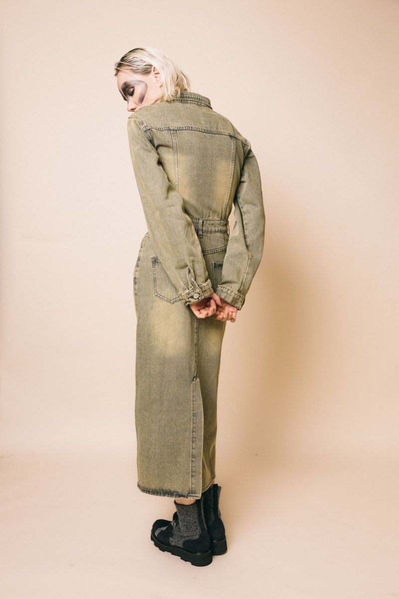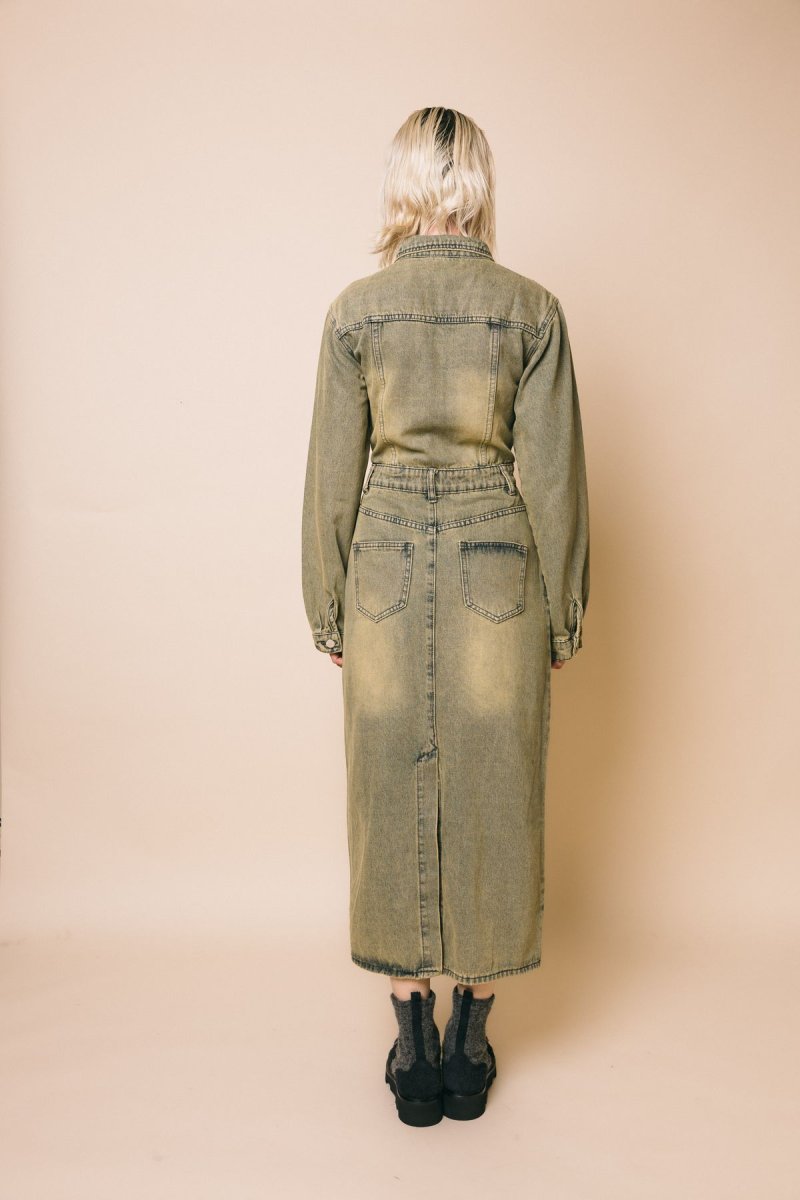 Abito lungo in denim vintage con tasche, spacco posteriore, tessuto morbido e confortevole