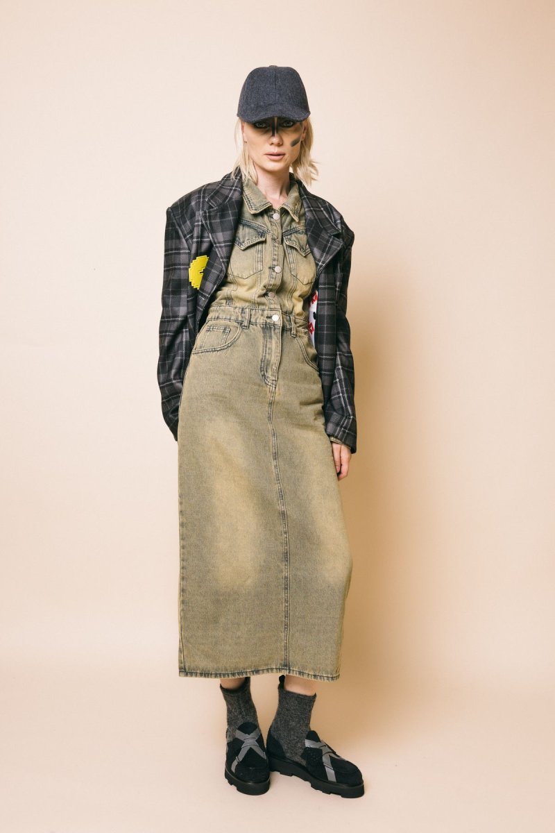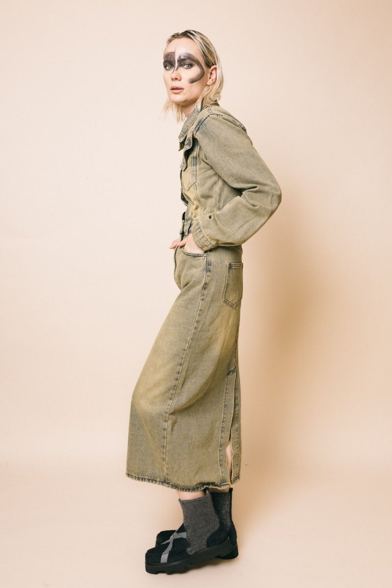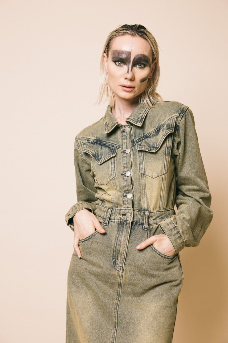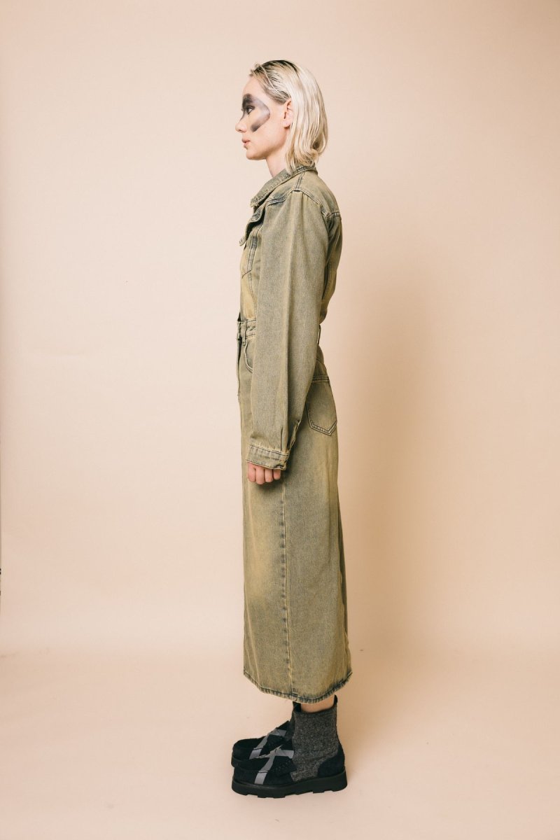 Abito lungo in denim vintage con tasche, spacco posteriore, tessuto morbido e confortevole