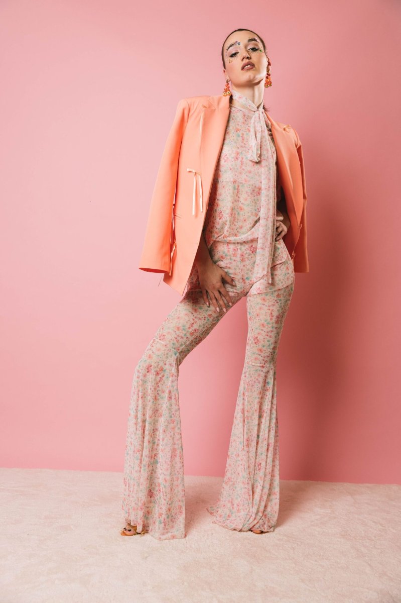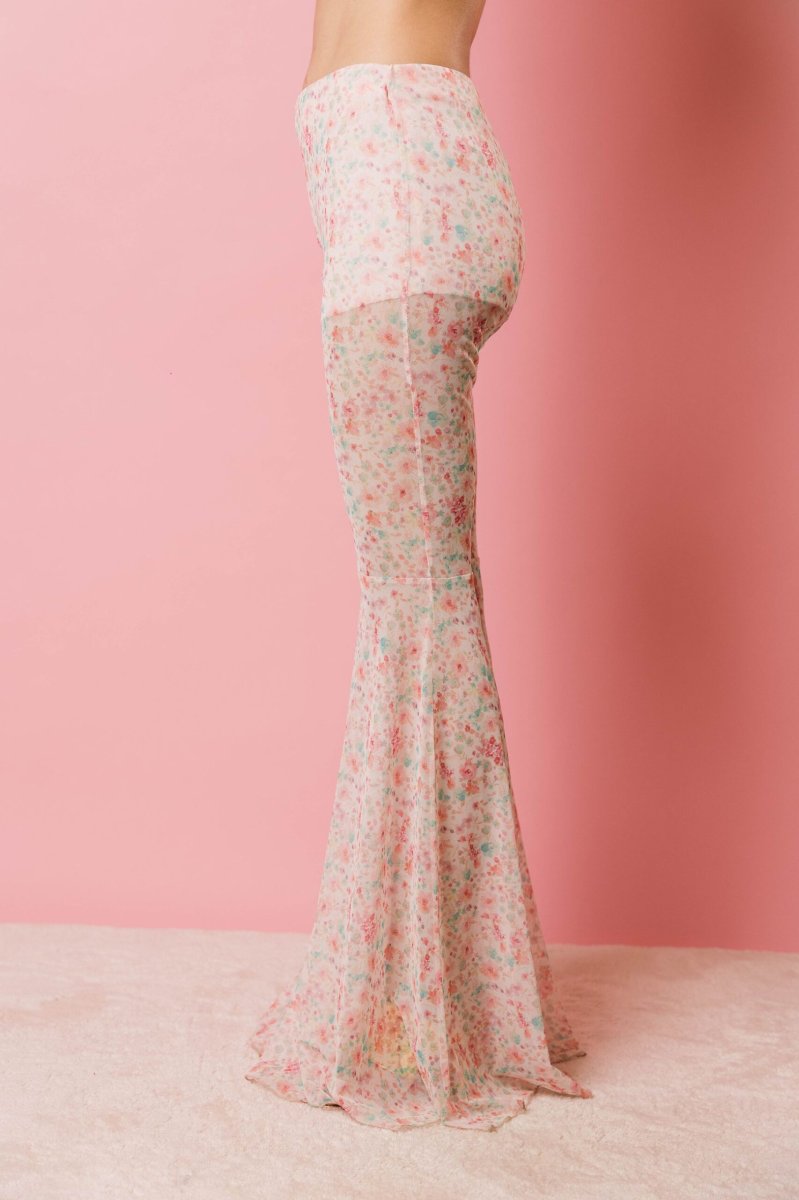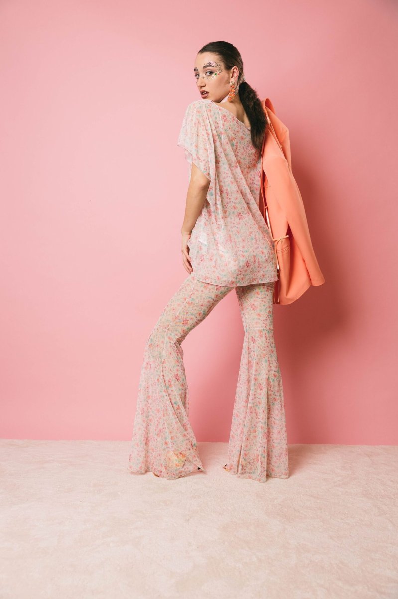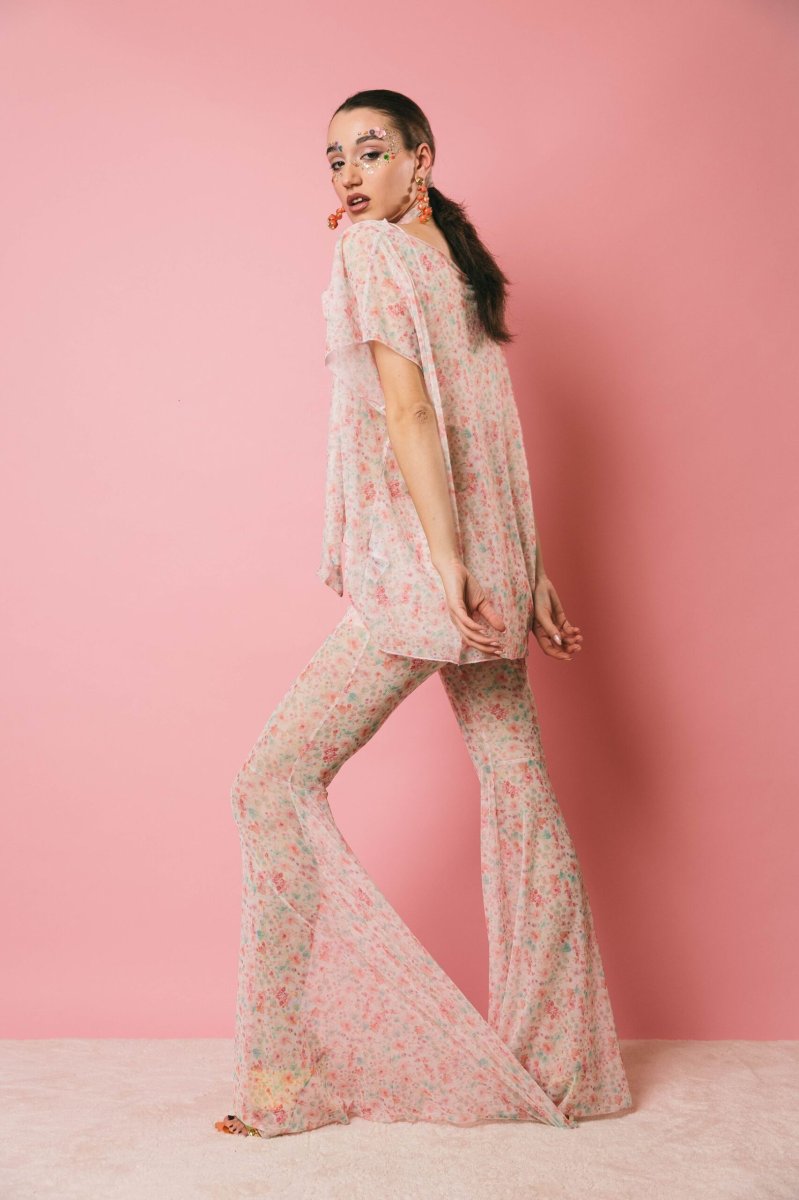 Pantalone in tulle elasticizzato a rete con stampa floreale provenzale, elastico in vita e cucitura a metà gamba che enfatizza la struttura. Il fondo si apre in una zampa estremamente pronunciata, creando un effetto scenografico e raffinato.