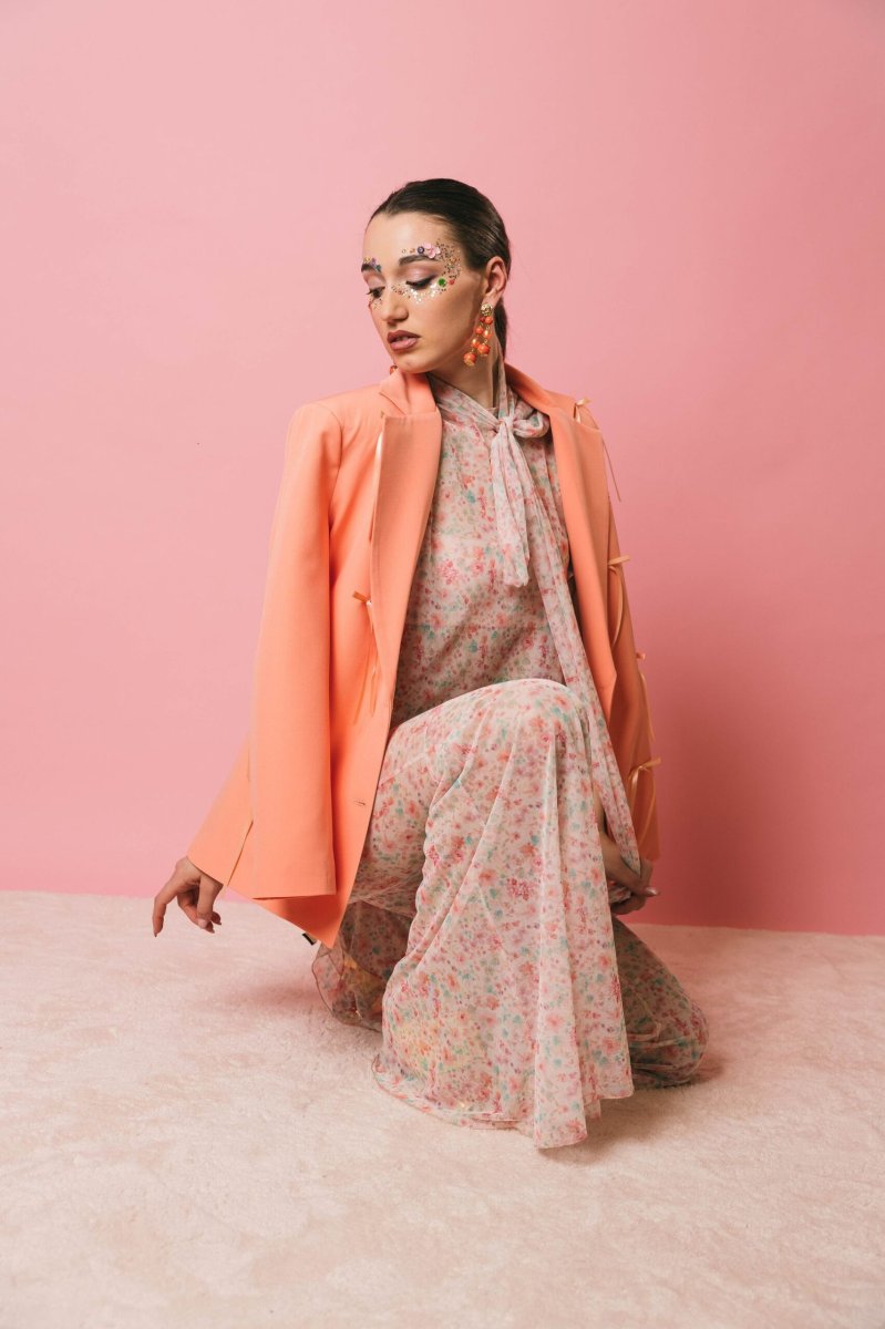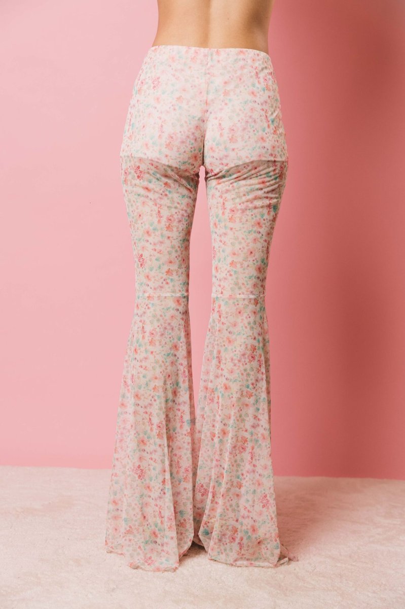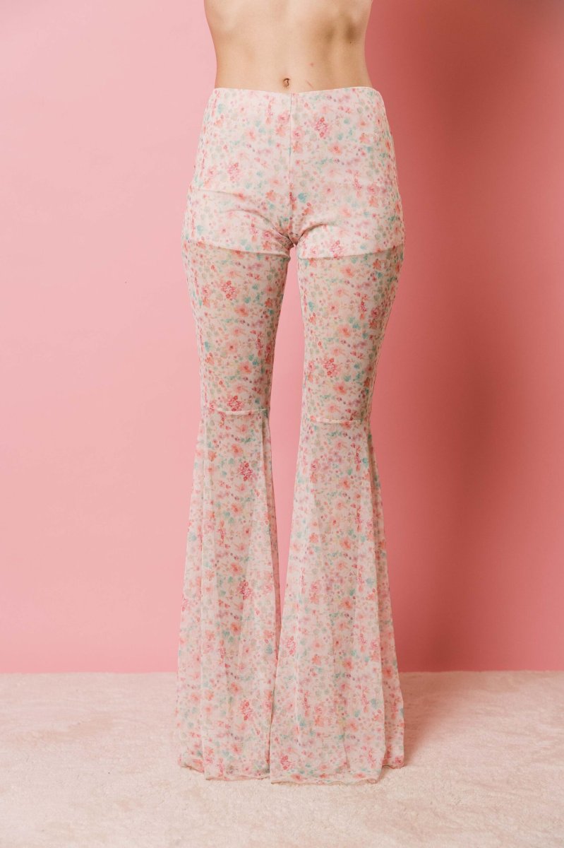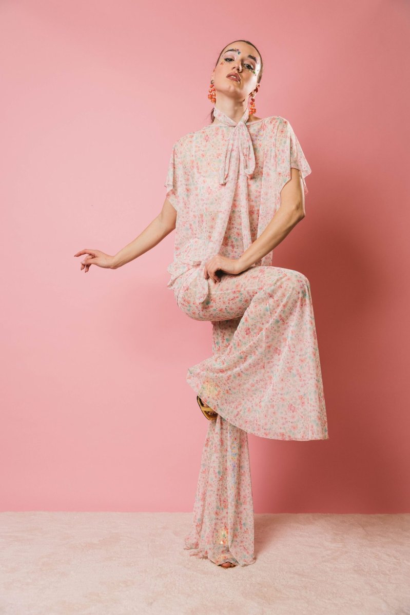 Pantalone in tulle elasticizzato a rete con stampa floreale provenzale, elastico in vita e cucitura a metà gamba che enfatizza la struttura. Il fondo si apre in una zampa estremamente pronunciata, creando un effetto scenografico e raffinato.