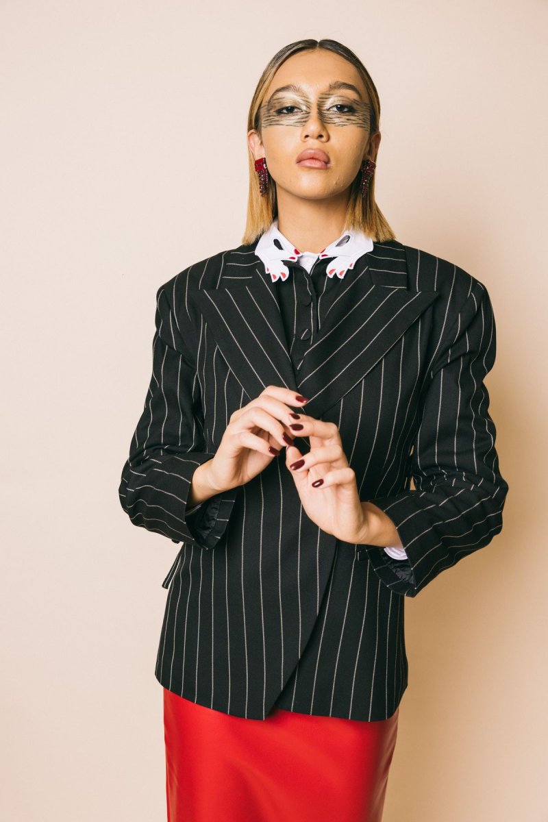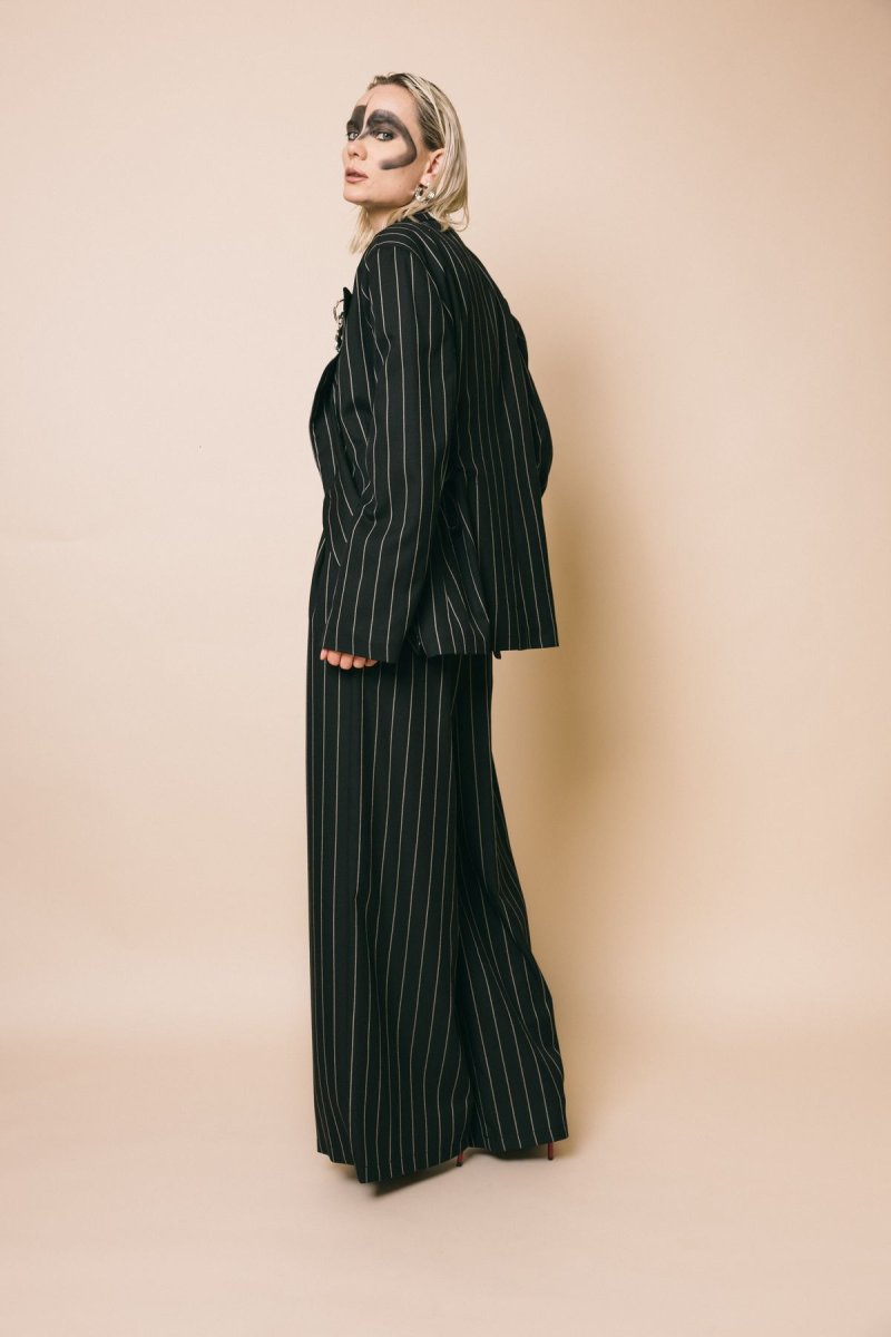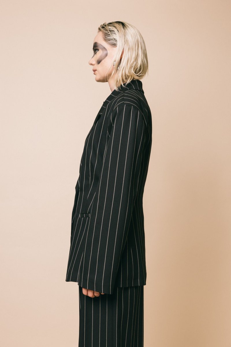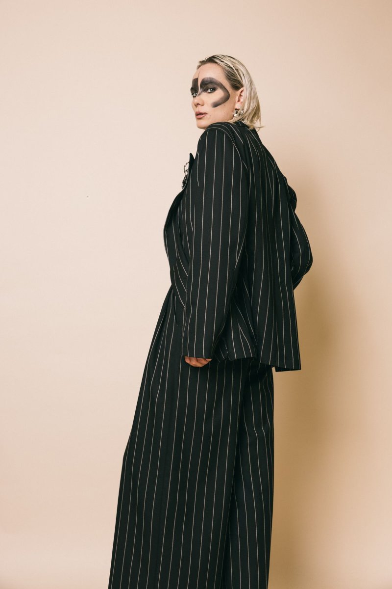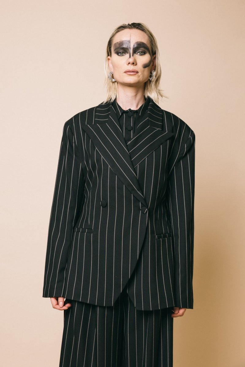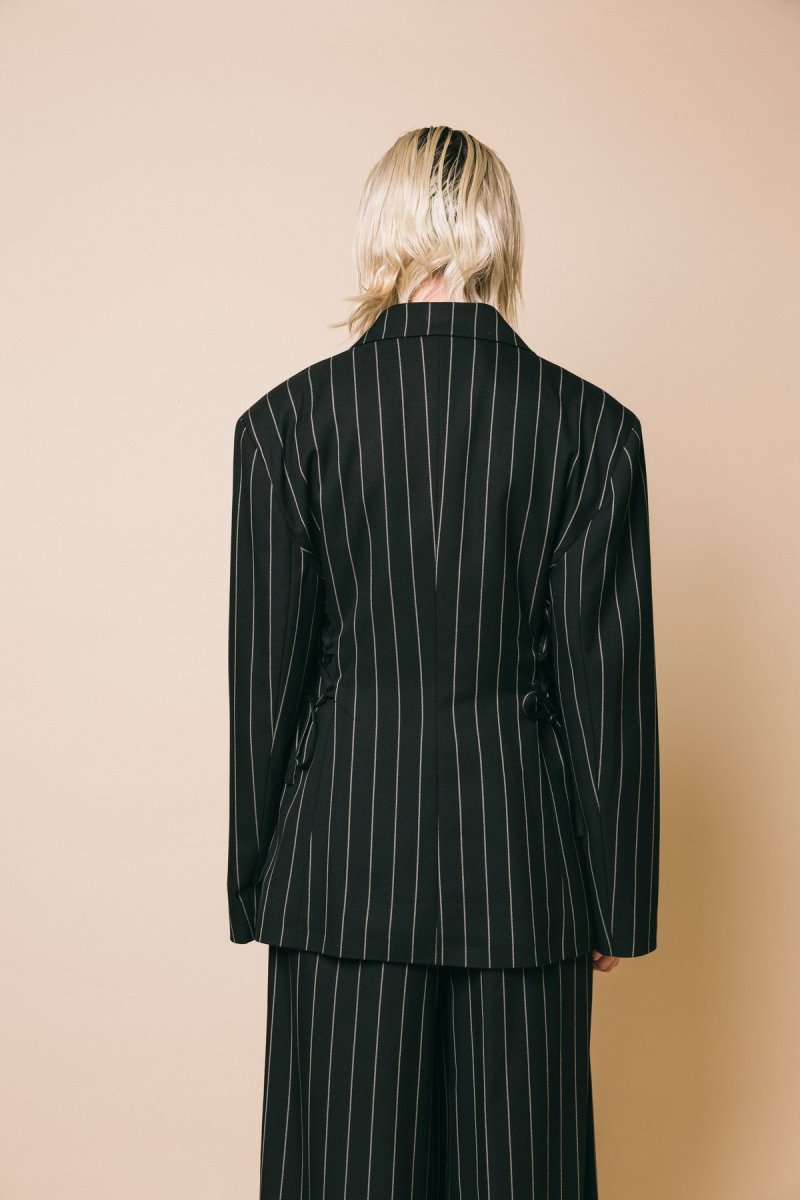 Blazet con spalline e stringhe in vita, tessuto gessato