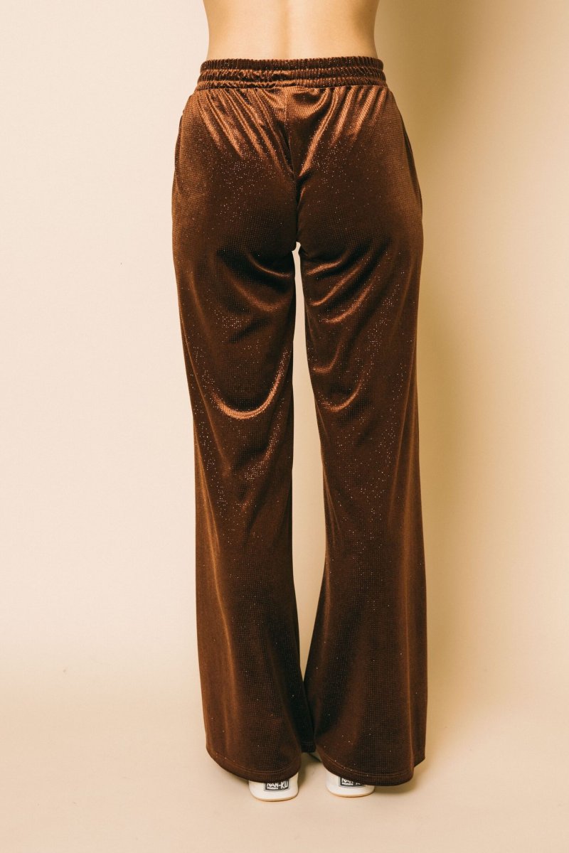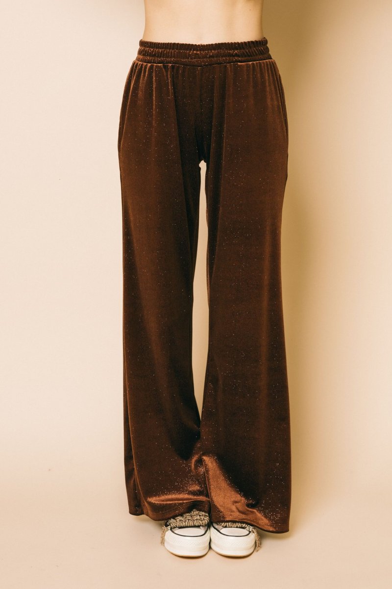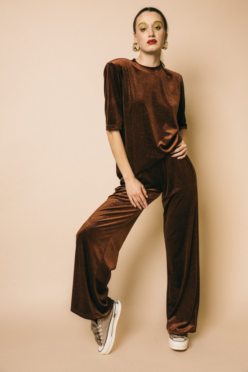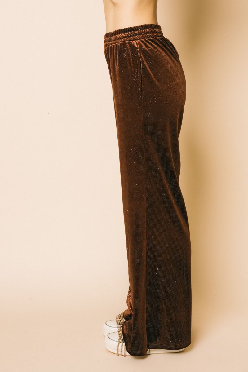 Pantalone palazzo in ciniglia glitter con elastico in vita