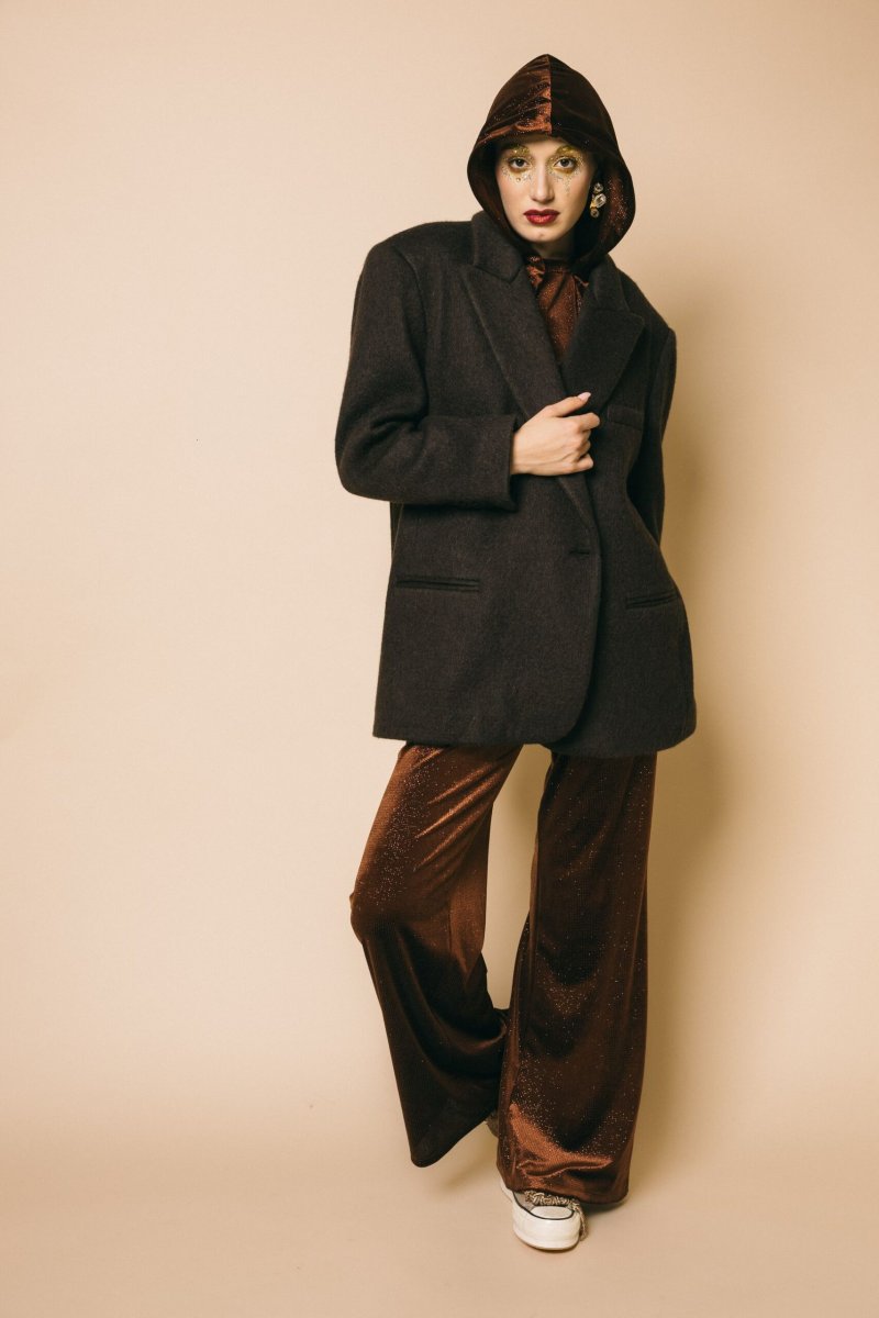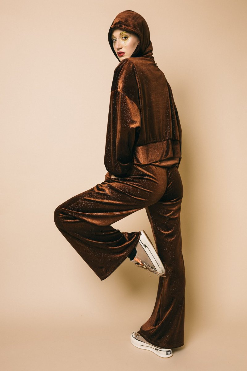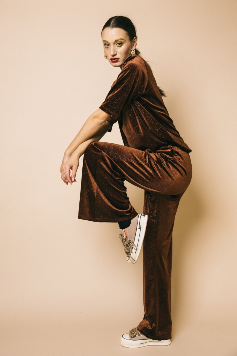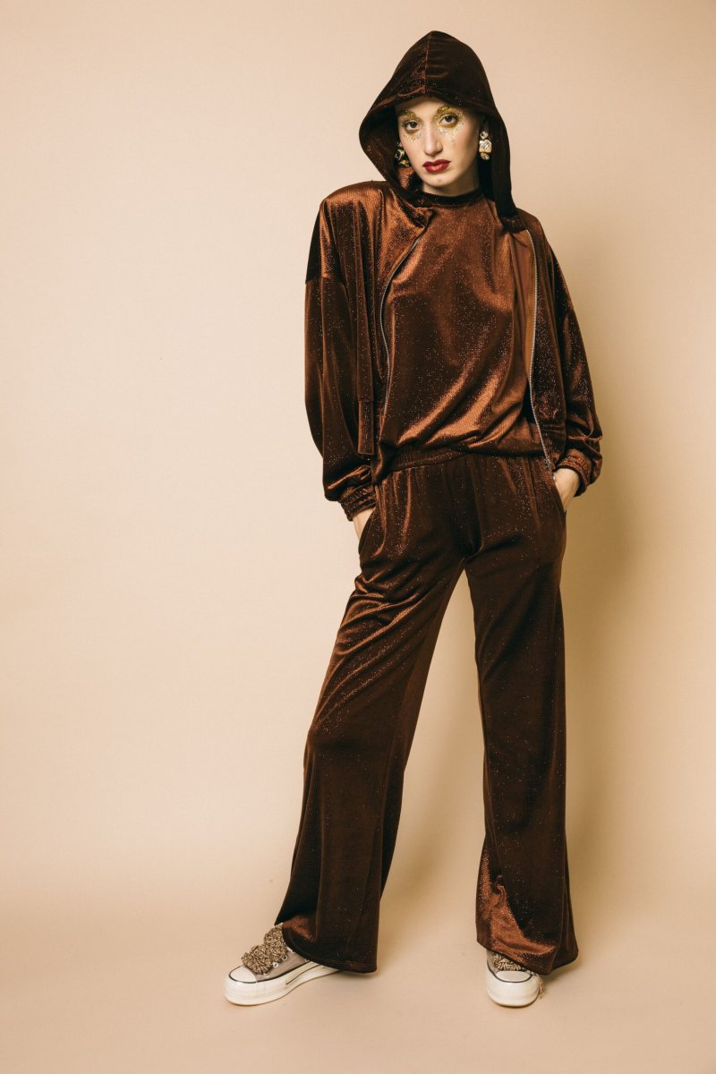 Pantalone palazzo in ciniglia glitter con elastico in vita