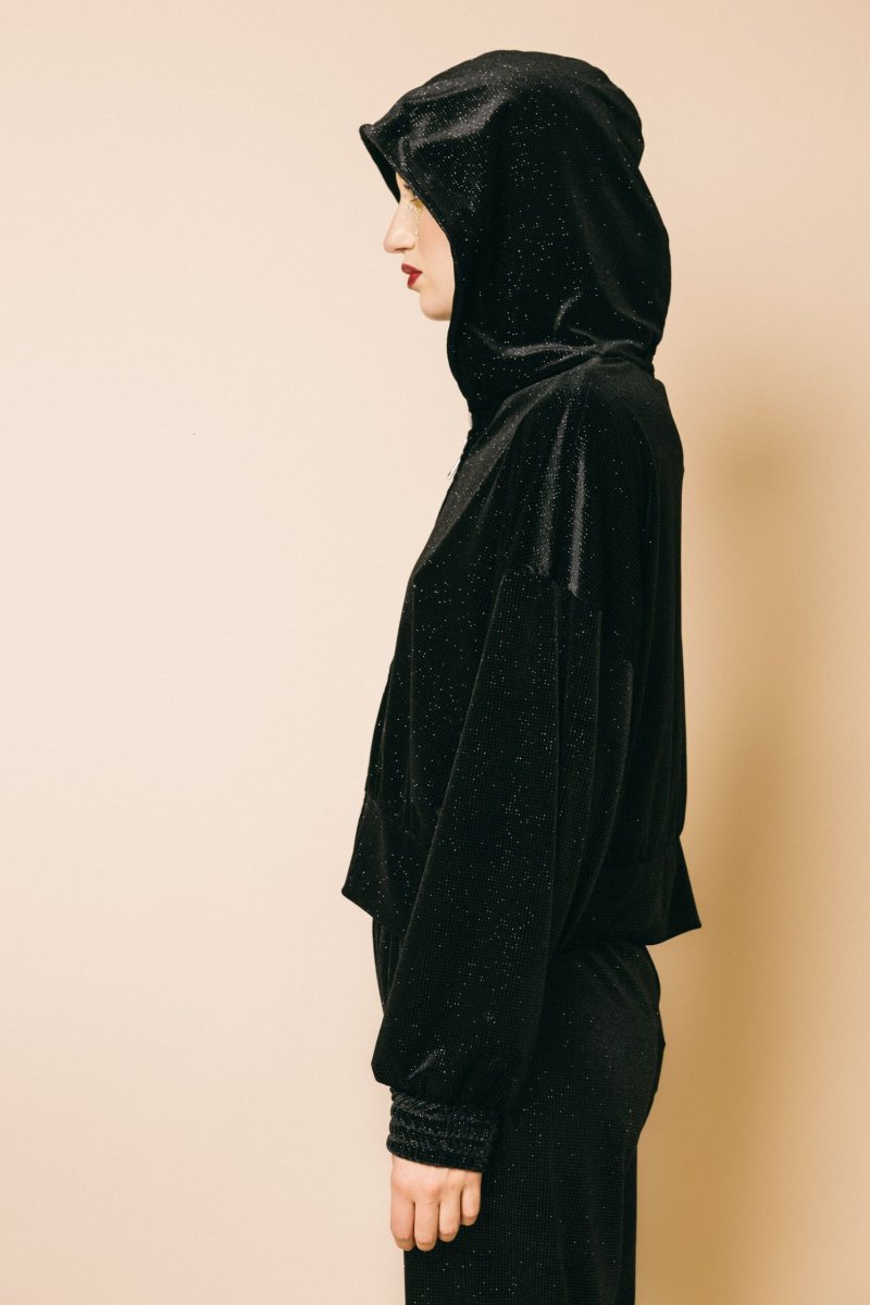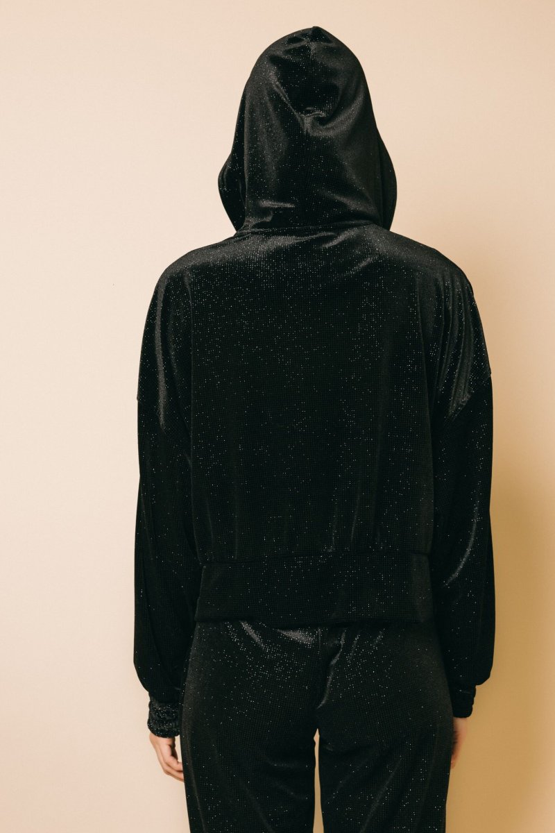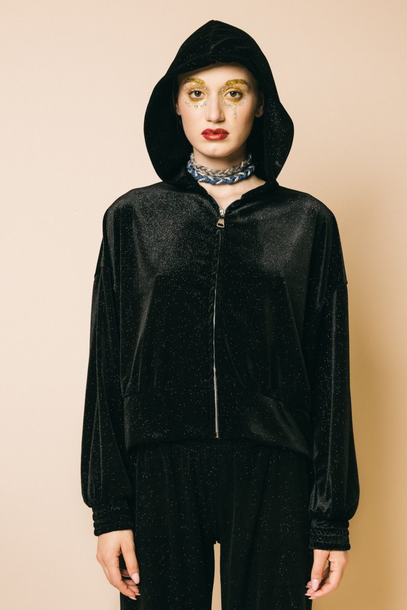 Felpa corta con cappuccio in ciniglia glitterata, chiusura con zip